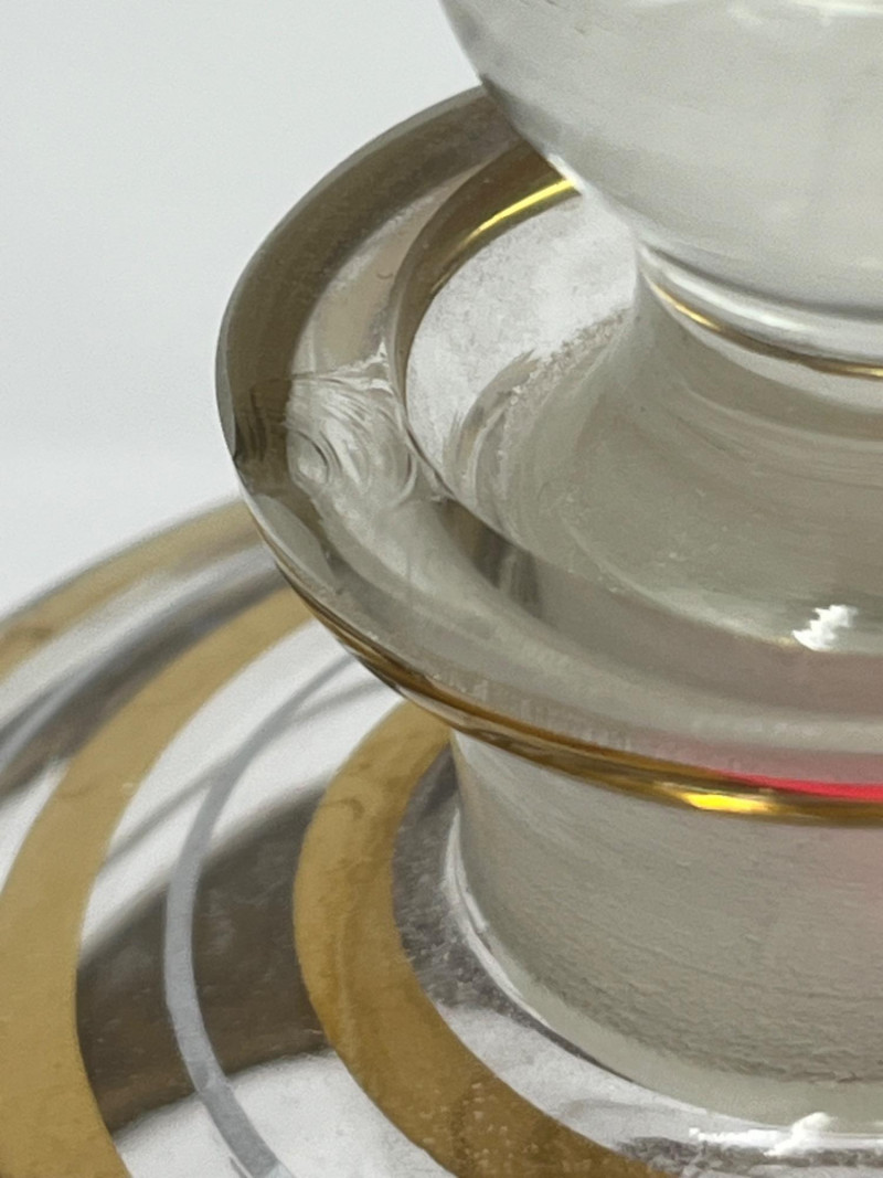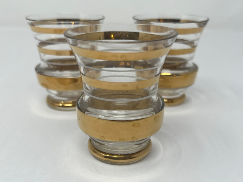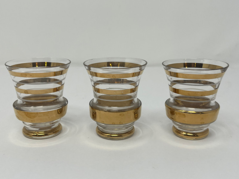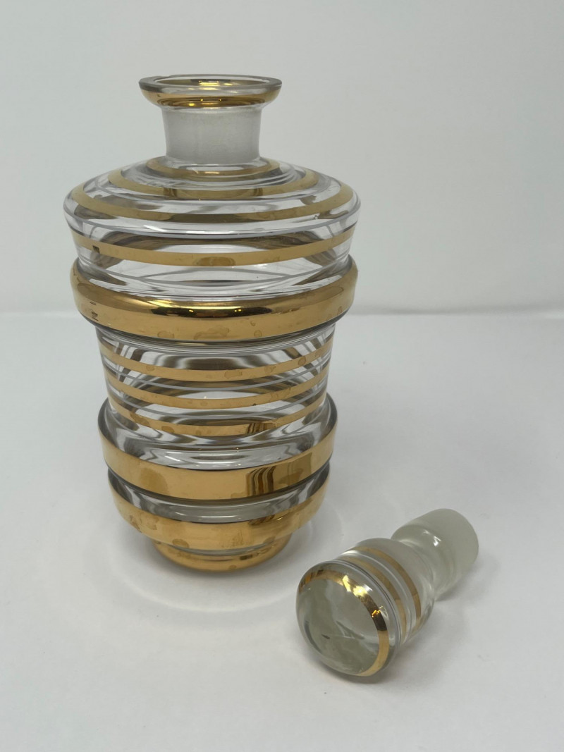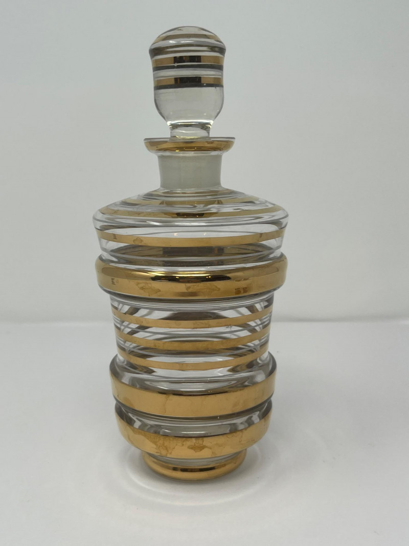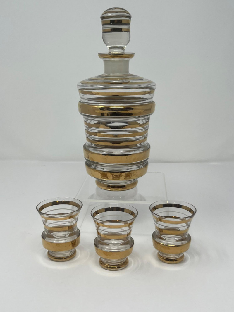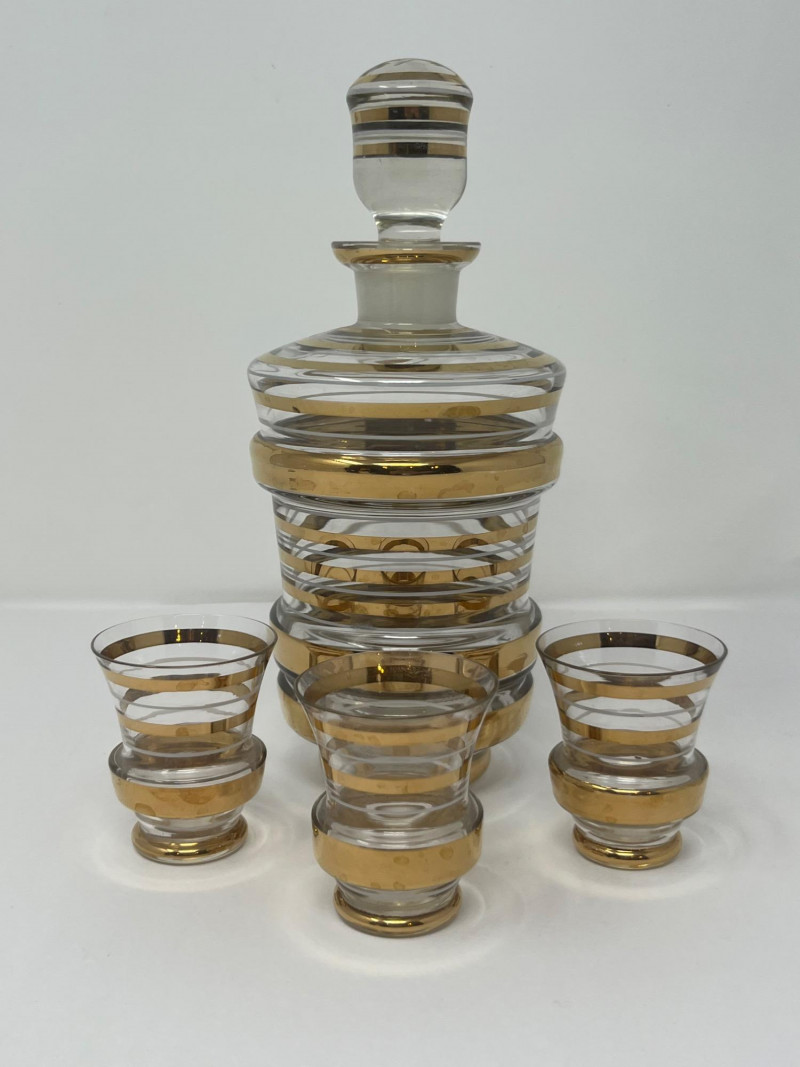 A sleek and stylish Art Deco liqueur set featuring a tall ribbed decanter with matching stopper and three coordinating shot glasses. Each piece is crafted from clear glass and adorned with horizontal gold bands, offering a refined geometric elegance typical of the 1930s cocktail era. The gold gilding is well-preserved with minimal wear, and the decanter shows a small chip on the lip (see photo). A sophisticated addition to any bar cart or vintage glassware collection. Maker: Unmarked; likely Czech or American Art Deco production Material: Clear pressed glass with gold banding Color Scheme: Transparent with metallic gold accents Dimensions: Decanter: Approx. 9" H × 4" W Glasses: Approx. 2.5" H × 2" W each Design Features: Ribbed vertical texture Horizontal gold bands Matching stopper Era: Circa 1930s–1940s Condition: Very good vintage; minor chip on decanter lip, gold banding intactItem Details
