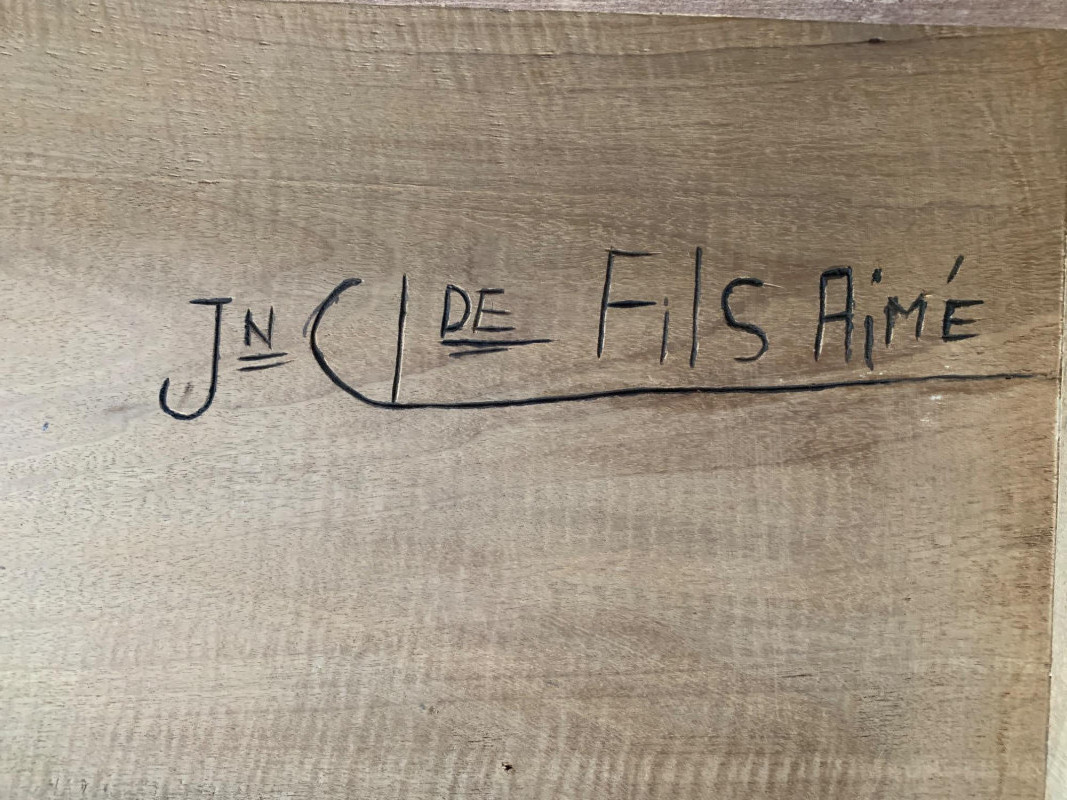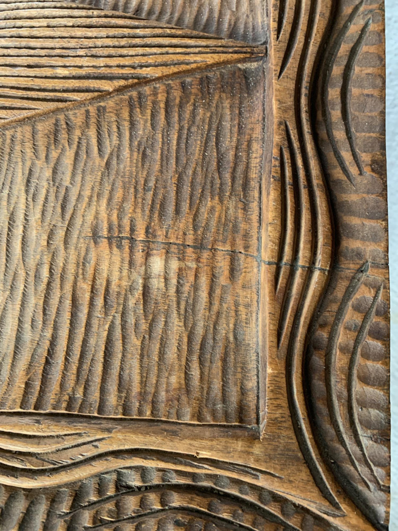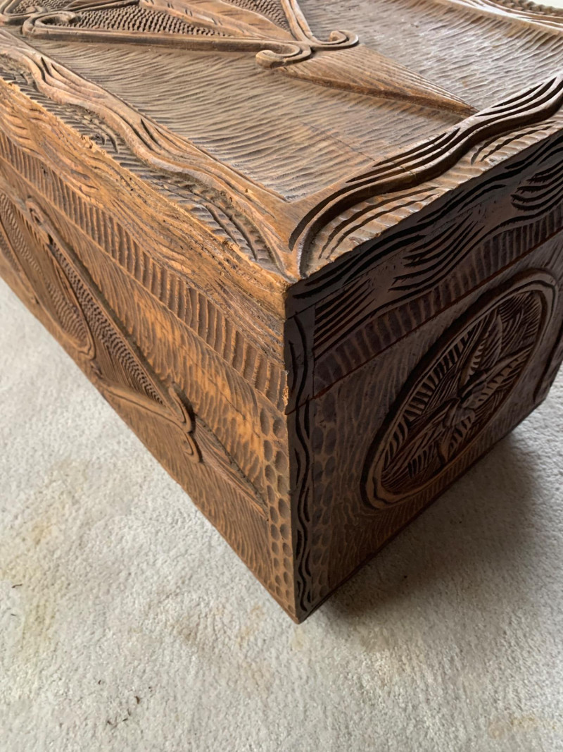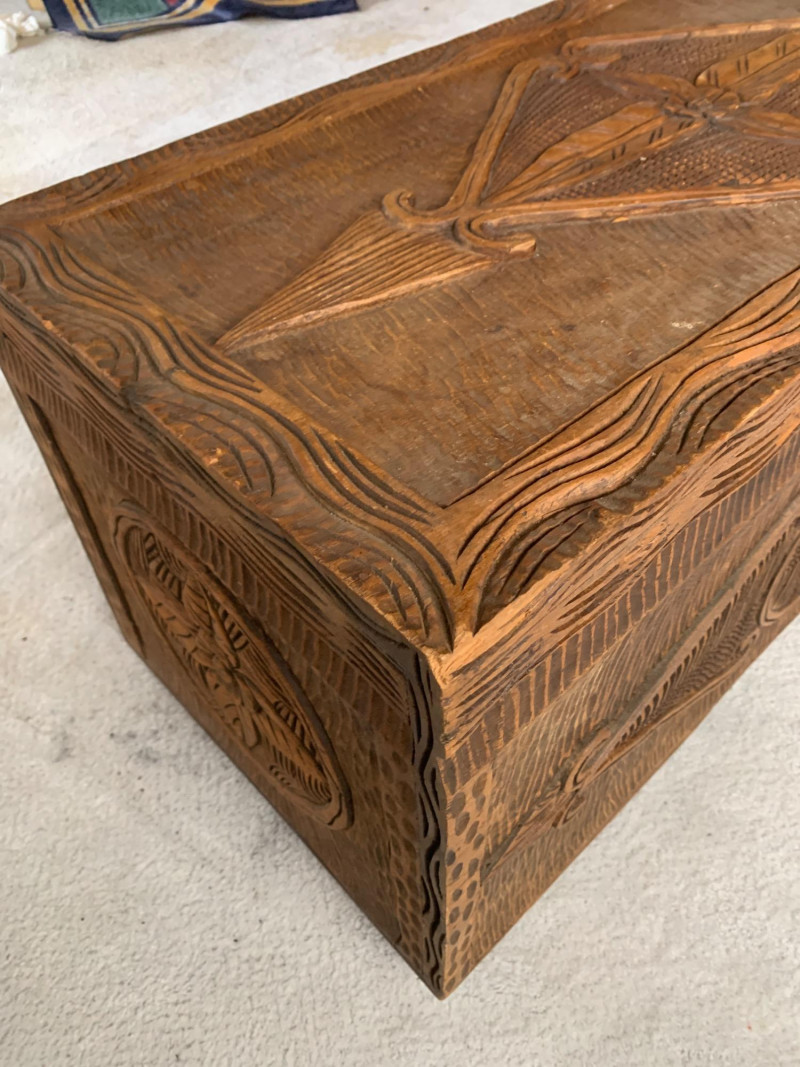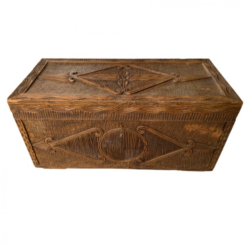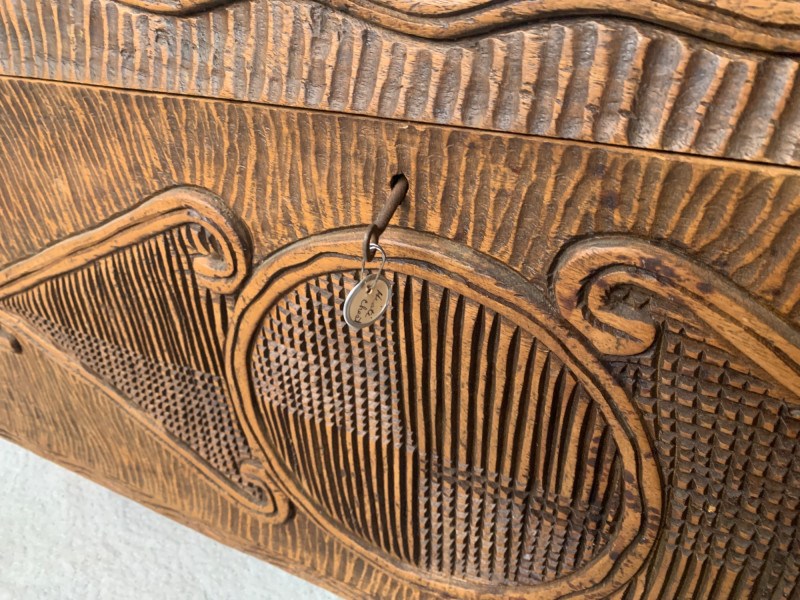 Maker: Unmarked; likely mid-century folk artisan Material: Solid carved wood Color: Rich brown with aged patina Dimensions: Length: 36" Width: 36" Height: 18" Depth: 17" Design Features: Relief carvings: diamond, circular, scroll motifs Ribbed texture across lid and body Hinged lid with lock and key Era: Mid-20th century Condition: Good vintage; age-appropriate wear with one exterior crack (does not affect integrity)