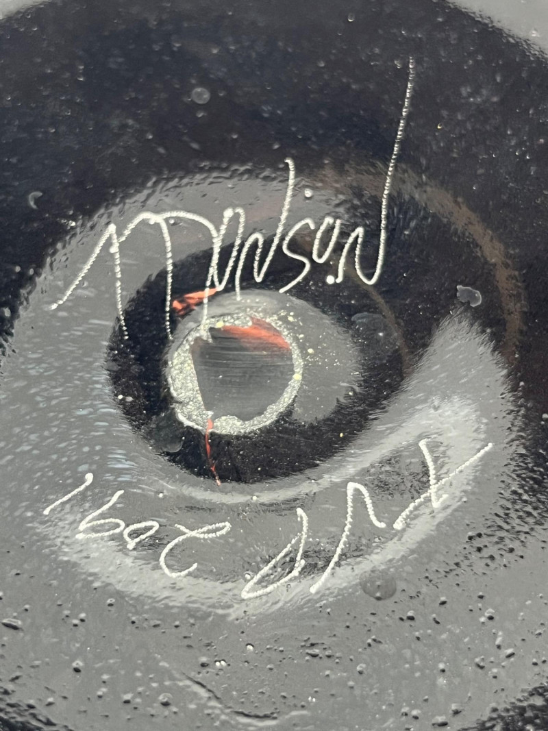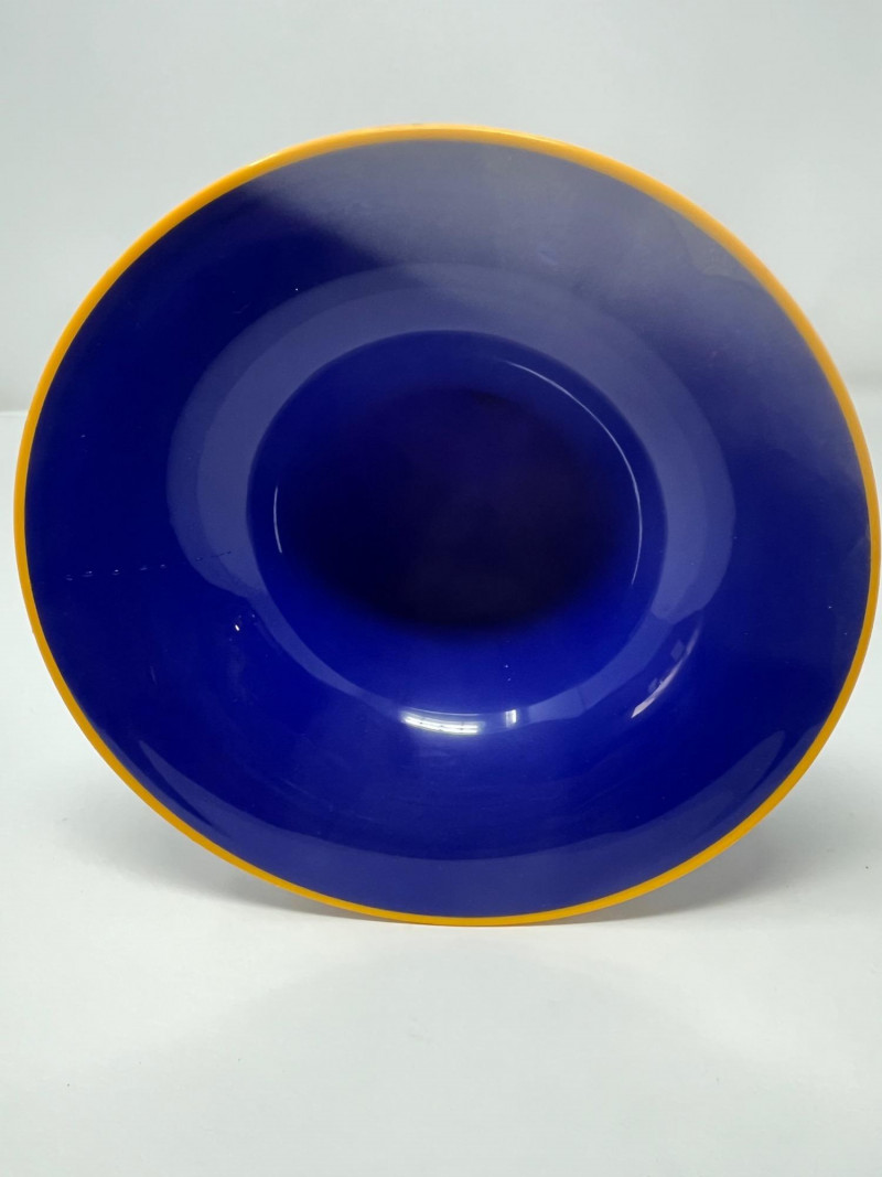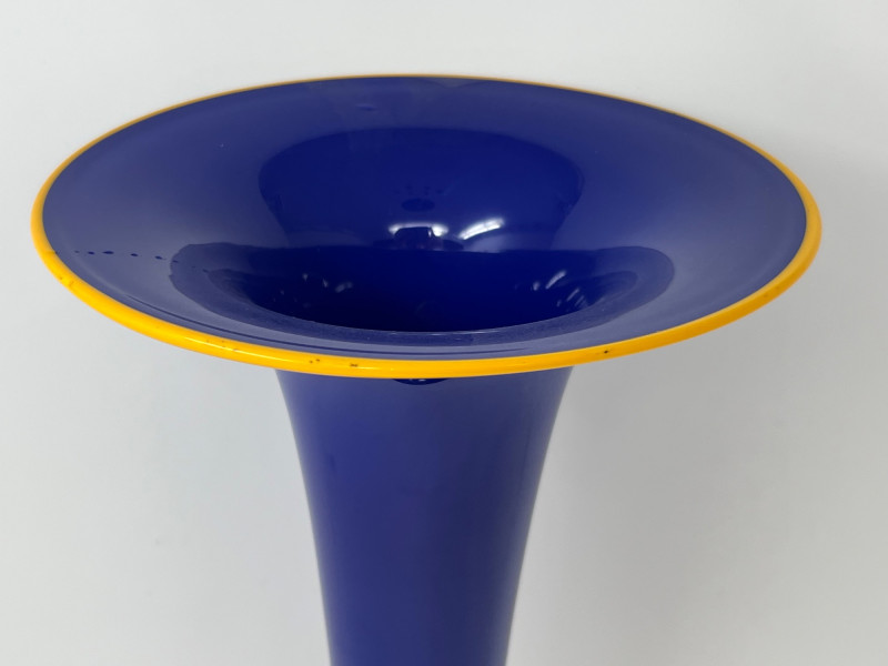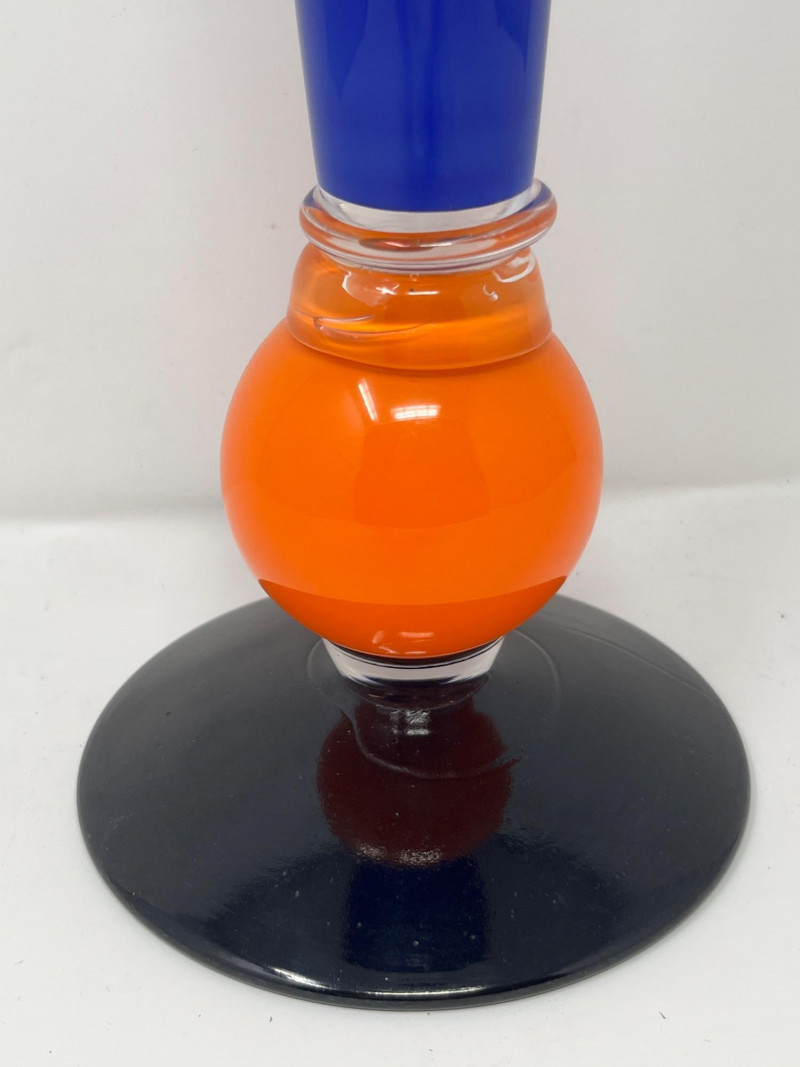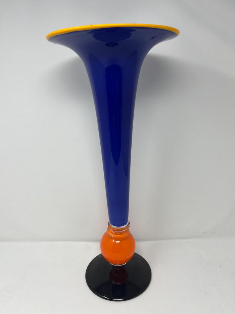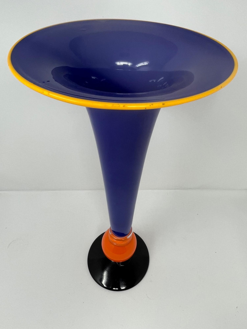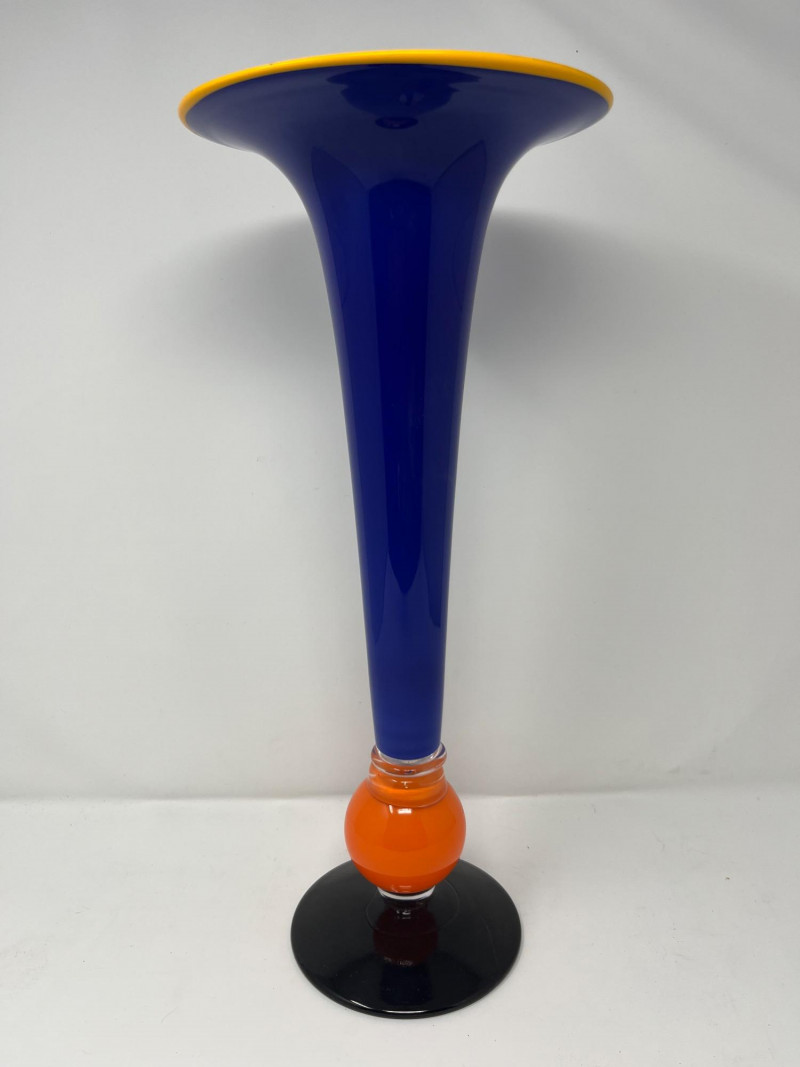 Summary: A bold and sculptural handblown art glass vase signed by Monson, featuring a flared trumpet form in deep cobalt blue with a yellow lip accent. The stem transitions into a vivid orange orb atop a glossy black circular base. Standing 17" tall, this piece exemplifies postmodern studio glass aesthetics with playful color blocking and elegant form. A standout for collectors of signed contemporary glass or lovers of Memphis-inspired design. Artist: Monson (signed) Material: Handblown glass Color Palette: Cobalt blue, yellow, orange, black Dimensions: 17" H × 8" W × 6" D Design Features: Trumpet-style flared rim Yellow lip accent Orange orb stem Glossy black base Era: Late 20th century to early 2000s Condition: Excellent; no chips, cracks, or repairs notedItem Details
