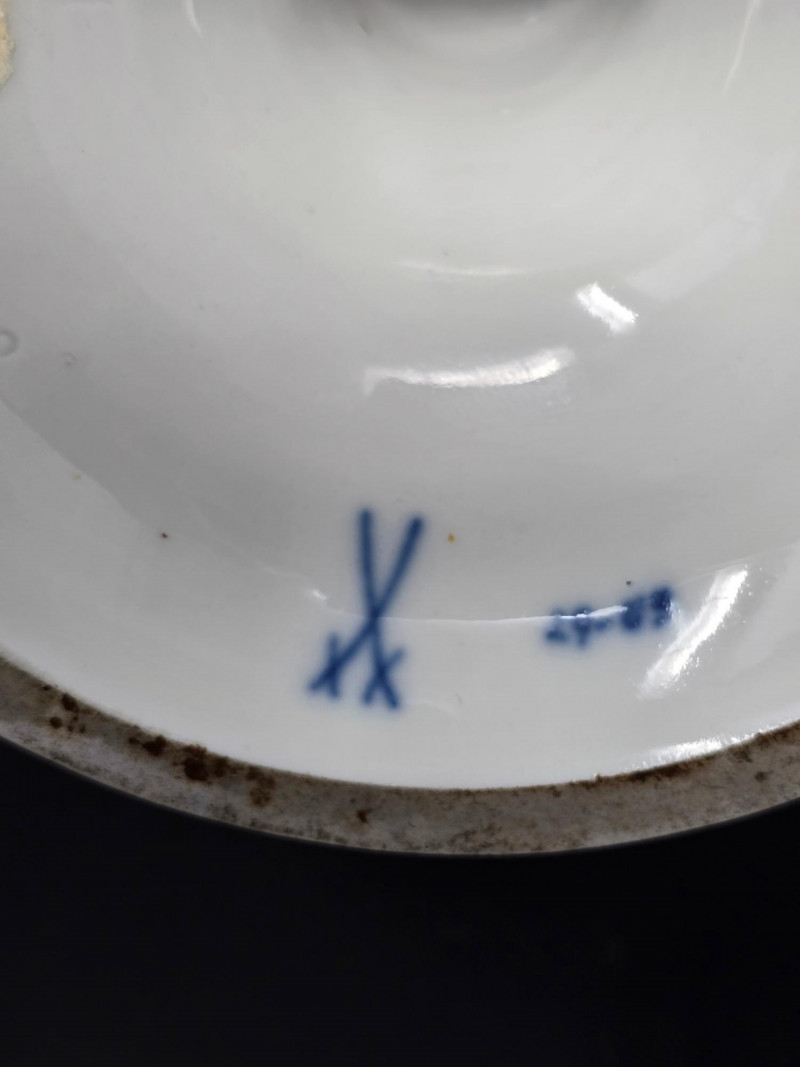 Summary: A refined Meissen porcelain goblet featuring the iconic Blue Onion (Zwiebelmuster) pattern in cobalt blue on white ground. The flared bowl with scalloped rim rests on a decorative pedestal base adorned with matching floral motifs. Standing approximately 8" tall, this piece exemplifies Meissen’s mastery of hard-paste porcelain and 18th-century design revival. Ideal for display or formal table settings, it’s a collectible example of German ceramic artistry. Maker: Meissen (Germany) Pattern: Blue Onion (Zwiebelmuster) Material: Hard-paste porcelain Color Scheme: White with cobalt blue floral decoration Dimensions: Approx. 8" H × 4.5" W Design Features: Scalloped rim Flared bowl Pedestal base with matching floral motifs Era: early 20th century Condition: Excellent; no chips, cracks, or repairs notedItem Details