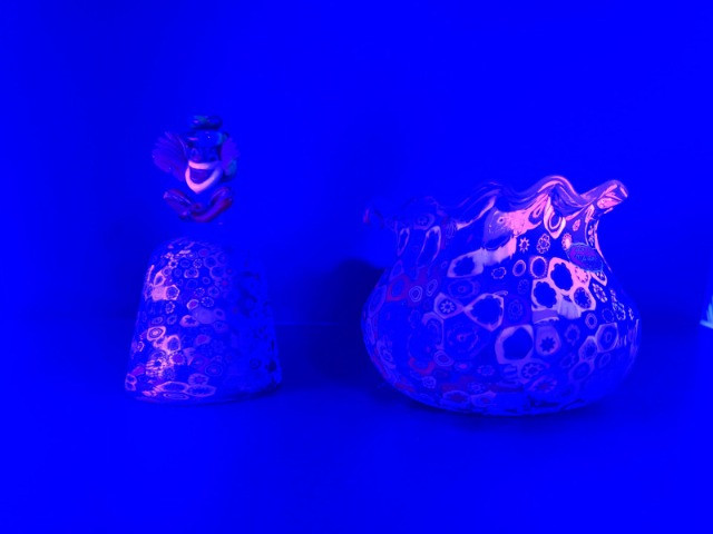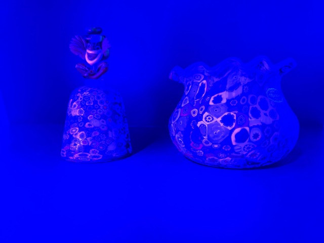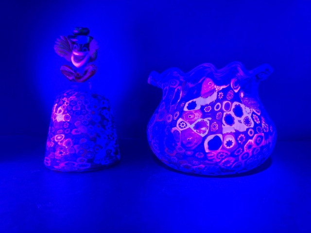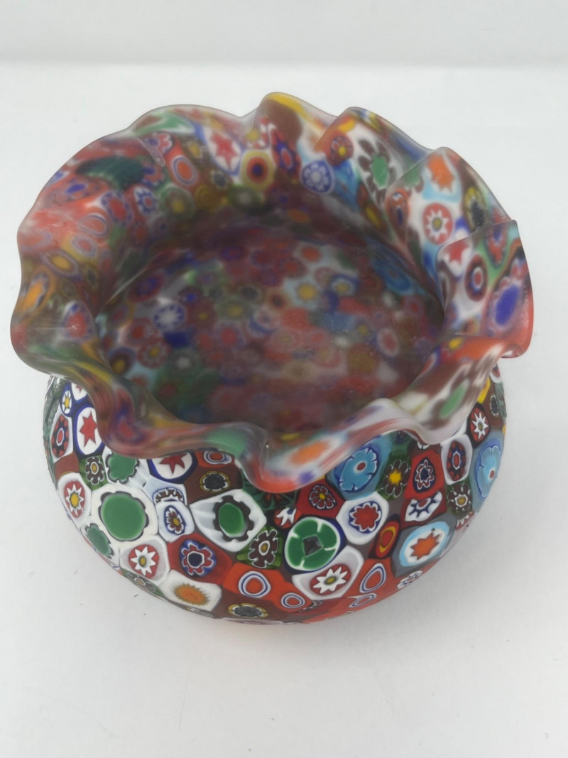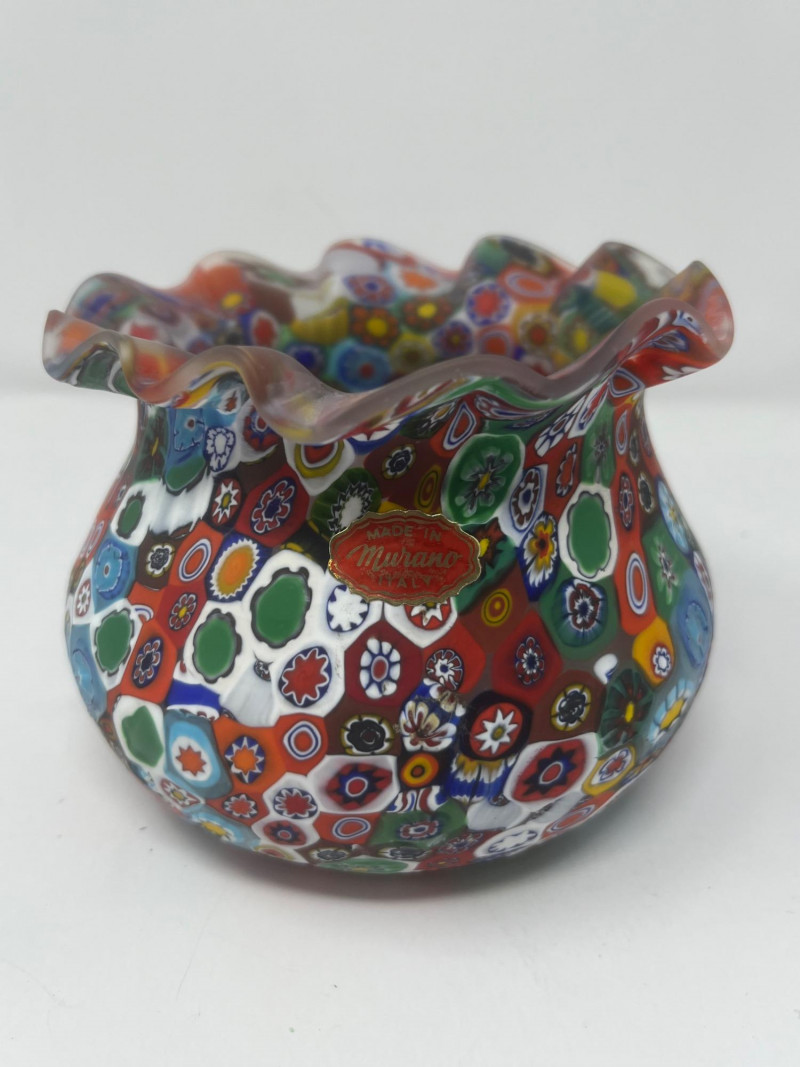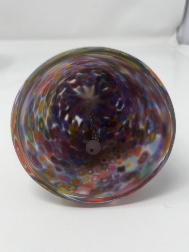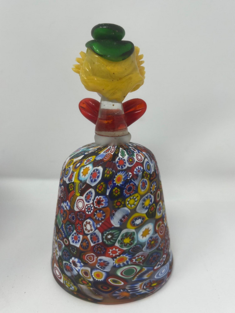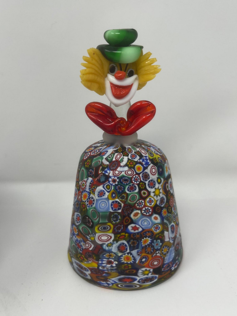 Summary: A vibrant duo of hand-blown Murano millefiori glass featuring a ruffled-edge bowl and a bell-shaped clown figurine. The bowl bursts with floral and geometric cane work in red, blue, green, and yellow, while the clown bell showcases a cheerful face, green hat, and red bow atop a millefiori body. Both pieces glow under UV light, suggesting the presence of manganese or uranium—a trait prized by collectors of vintage glass. A playful and artistic pairing from the Venetian tradition, offered as a set. Maker: Murano (Italy) Material: Hand-blown glass with millefiori technique Color Palette: Multicolor mosaic with dominant reds, blues, greens, and yellows Dimensions: Bowl: Approx. 7" L × 7" W Clown Bell: Approx. 7" H Design Features: Ruffled bowl with millefiori cane mosaic Bell-shaped clown with expressive face and millefiori costume UV-reactive glass (fluorescent under blacklight) Era: Mid- to late 20th century Condition: Excellent; no chips or cracks notedItem Details