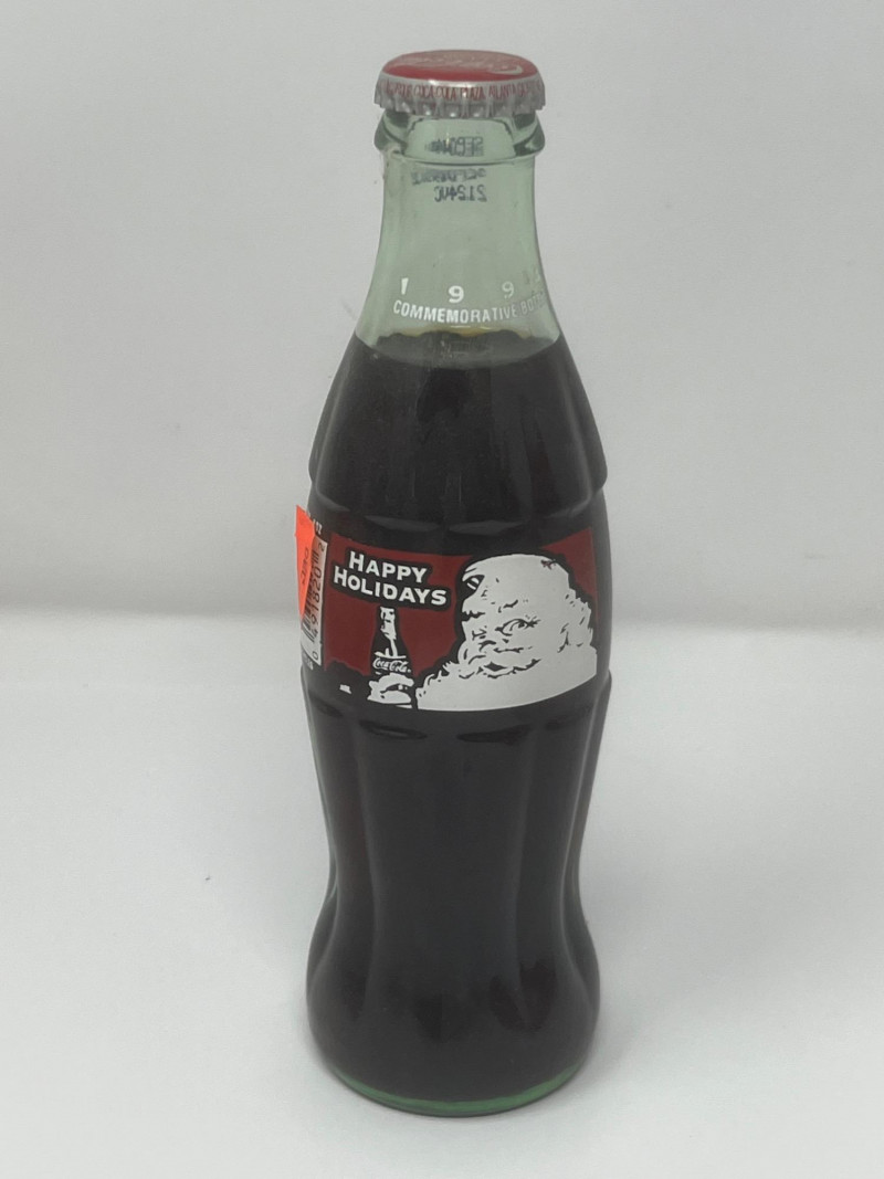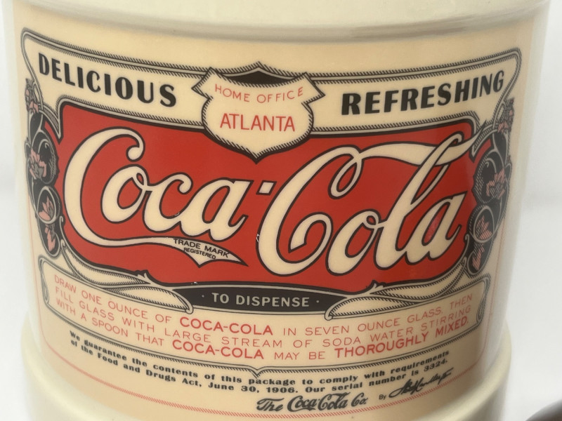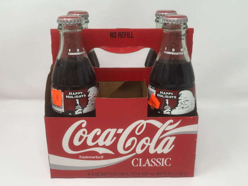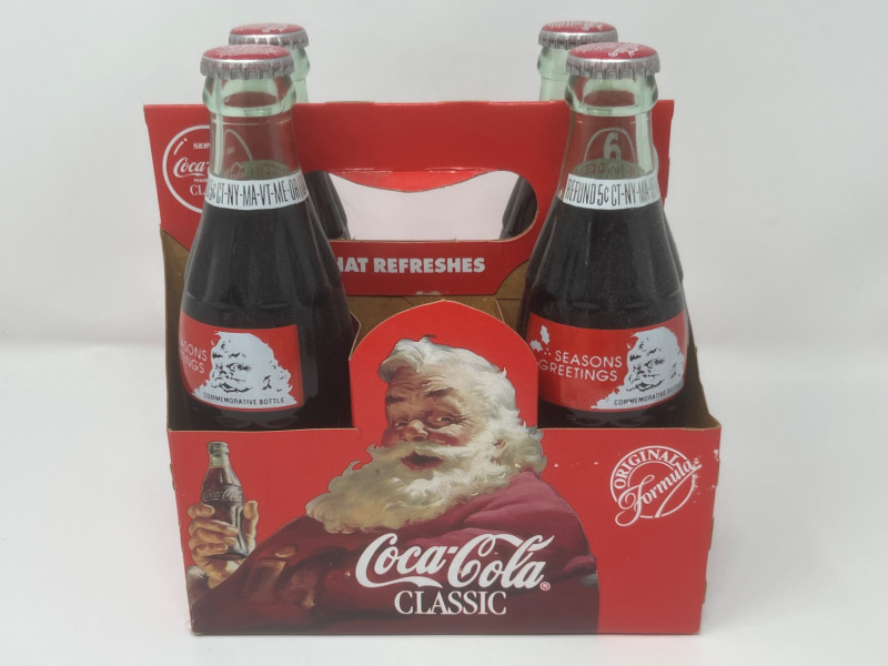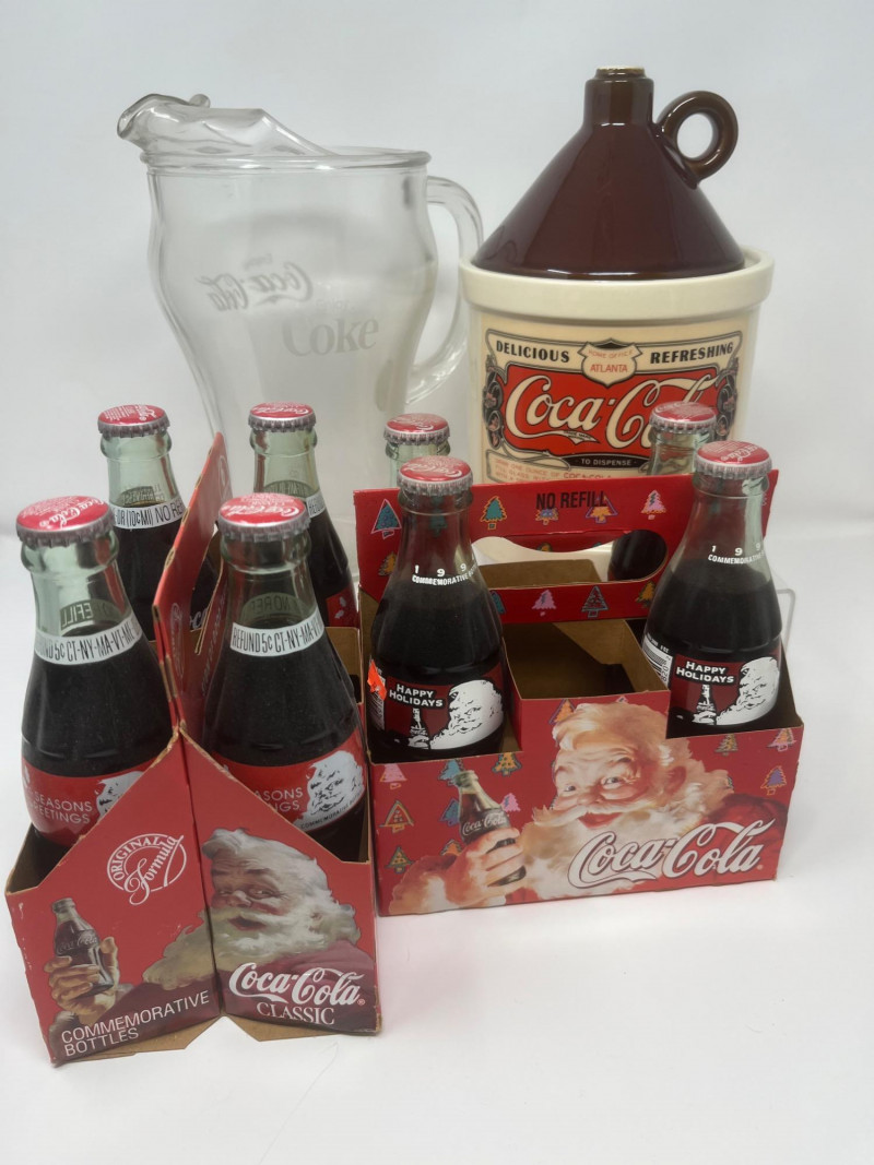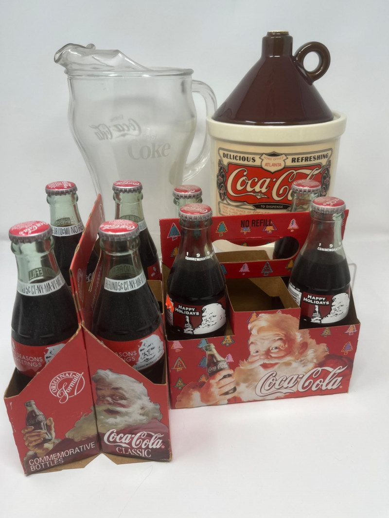 This lot features a curated collection of vintage Coca-Cola memorabilia perfect for collectors and enthusiasts. The items, dating from the early 1990s, are in excellent vintage condition and include some rare and highly sought-after pieces. Two Vintage Coca-Cola Christmas Six-Packs: Two commemorative six-packs of 8oz Coca-Cola bottles in their original cardboard carriers, featuring classic Santa Claus illustrations. These are similar to sets released in the 1990s for the holiday season. Ceramic Syrup Dispenser Jug: A vintage-style ceramic syrup dispenser jug, modeled after a soda fountain dispenser. This is a 1993 replica piece, often also used as a cookie jar. Clear Glass "Coke" Pitcher: A heavy, clear glass pitcher featuring the "Coca-Cola" logo embossed on the glass. The design, with a fluted handle and ice guard, is typical of those popular in the 1980s and 1990s. This lot is being sold as a complete set and would make a great addition to any Coca-Cola collection or a unique gift for a collector. The bottles are full and sealed, but are for display purposes only and are not for consumption. Condition: All items are in excellent vintage condition with minimal signs of wear. The bottles are full and sealed, and the cardboard carriers show light wear consistent with age. Disclaimer: These items are sold as collectibles and the contents of the bottles should not be consumed. Please handle with care.