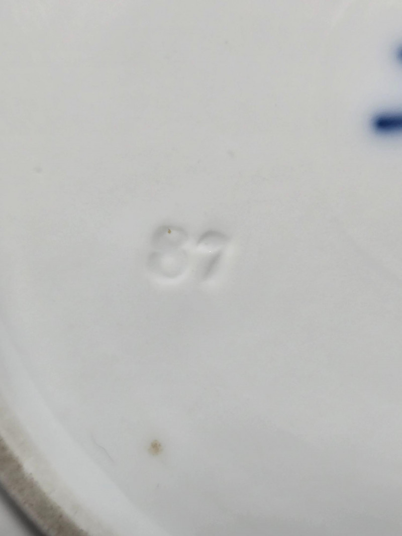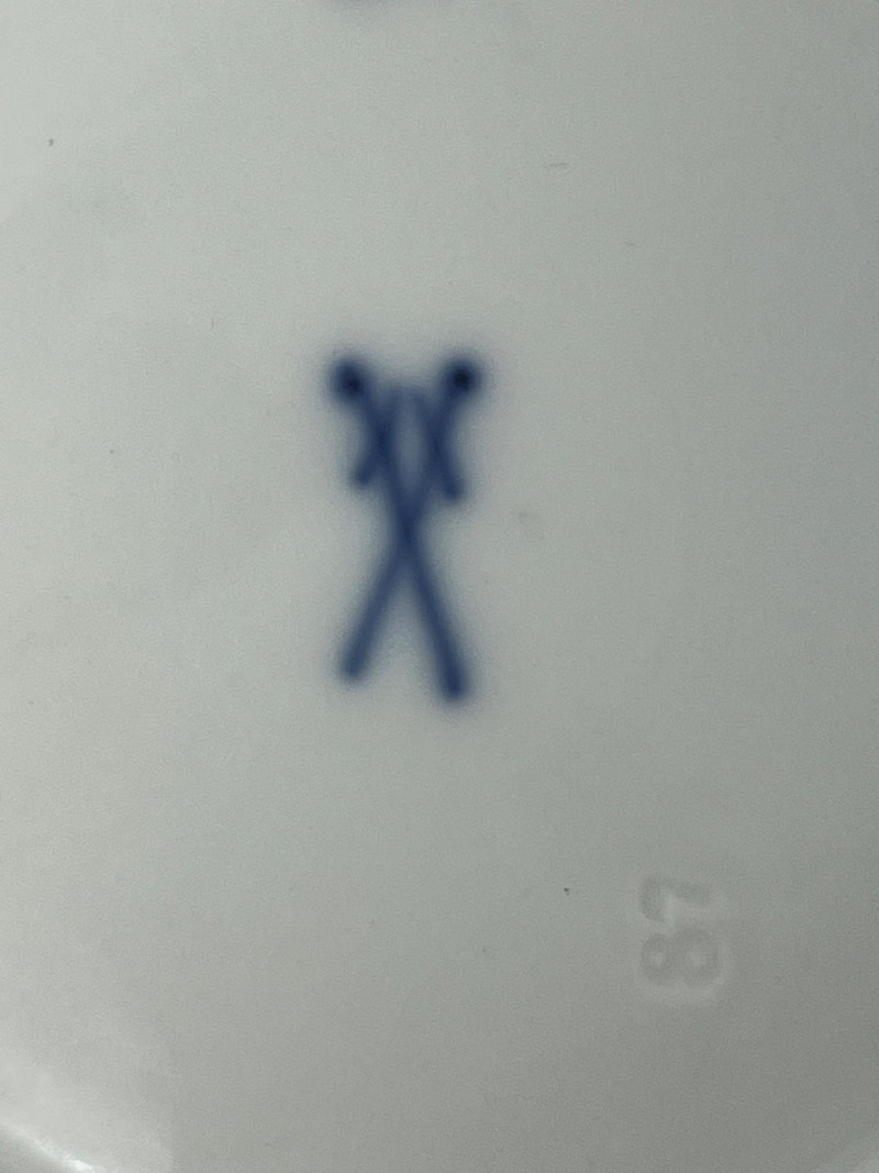 Summary: A charming Meissen blue and white porcelain condiment jar featuring a delicate floral vine motif across the body, lid, and matching saucer. The jar includes a ceramic spoon and a domed lid with a knob handle, all decorated in the classic cobalt-on-white palette. Likely inspired by Meissen’s Blue Onion (Zwiebelmuster) tradition, this piece blends German ceramic elegance with practical tabletop function. Ideal for serving sauces, jams, or pickled vegetables. Maker: Meissen porcelain Pattern: Blue Onion-inspired floral vine motif Material: Glazed hard-paste porcelain Color Scheme: White with cobalt blue decoration Dimensions: Approx. 4" H × 4.5" W (with saucer) Design Features: Lidded jar with knob handle Matching ceramic spoon Saucer with raised edge Continuous floral vine motif Era: Late 20th century Condition: Excellent; no chips, cracks, or repairs notedItem Details