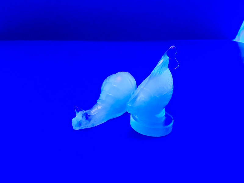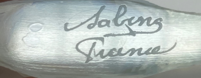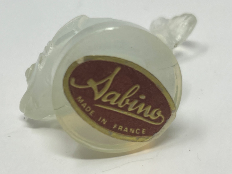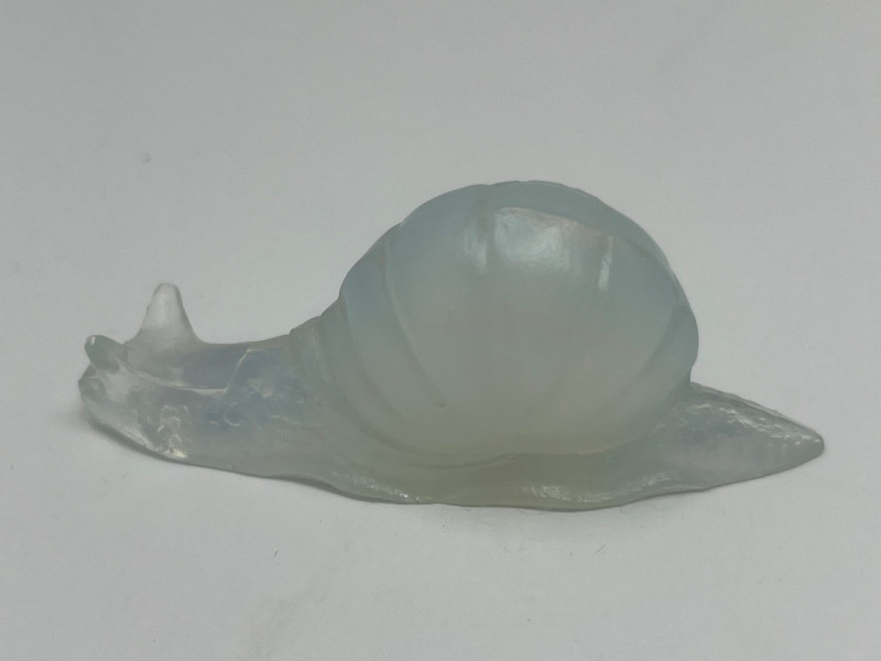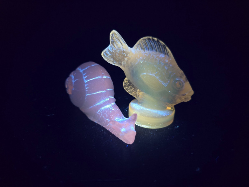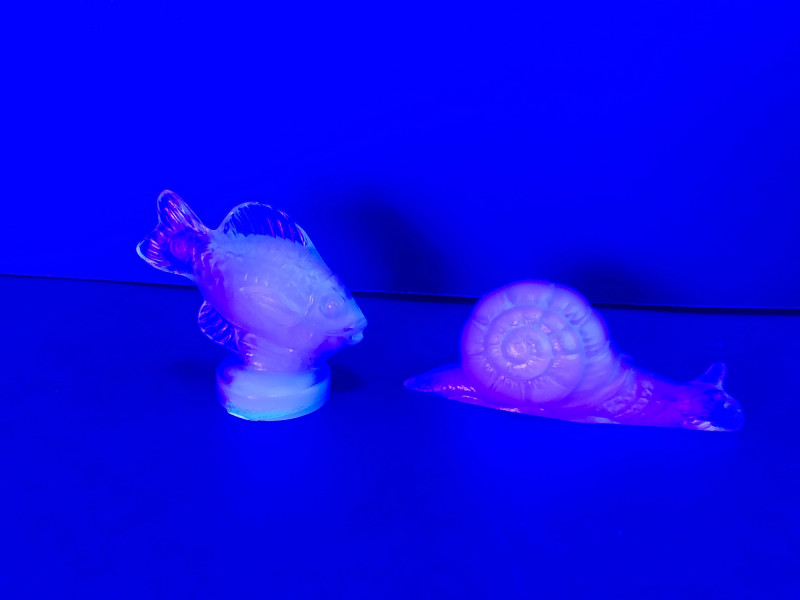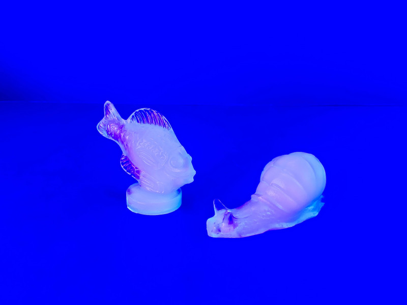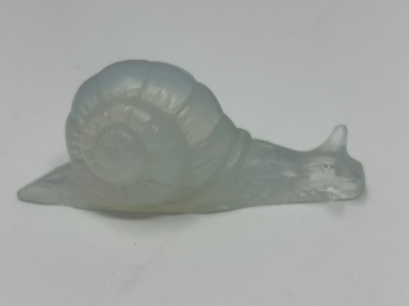 A pair of exquisite opalescent glass figurines by Sabino of France, featuring a standing fish and a reclining snail. Crafted in the signature Sabino style, these pieces glow with ethereal hues of blue, yellow, and violet under changing light. The fish, likely “Poisson L’Eglefin” or “Poisson San Piarre,” stands upright with detailed fins and scales, while the snail showcases a coiled shell and extended antennae. Both pieces are signed and measure approximately 3" wide. A luminous duo for collectors of French Art Deco glass. Maker: Sabino (France) Material: Opalescent glass Color Palette: Iridescent blue, yellow, and violet tones- Glows under UV light Dimensions: Approx. 3" W × 2" H each Design Features: Upright fish with circular base Reclining snail with extended head and coiled shell Signed base (Sabino France) Era: Mid-20th century Condition: Excellent; no chips, cracks, or repairs noted Item Details
