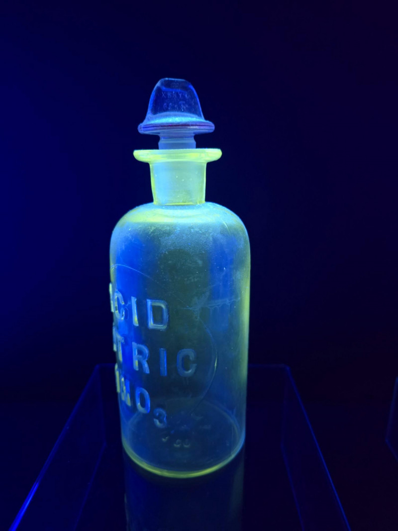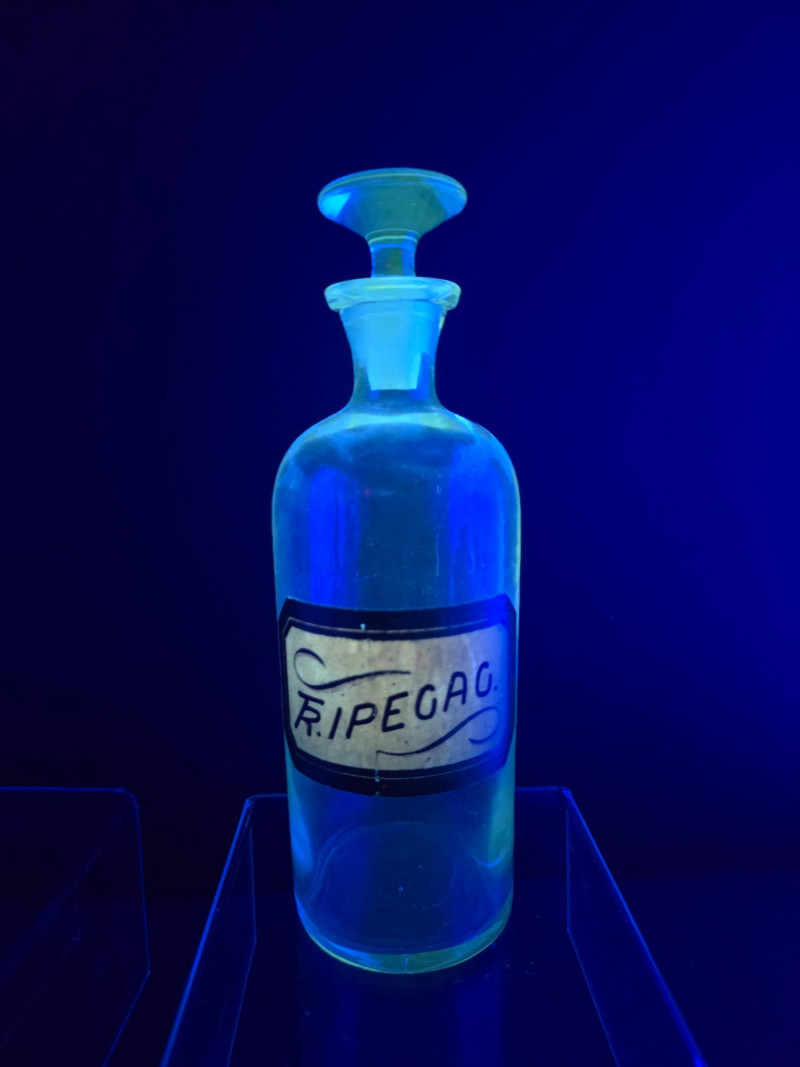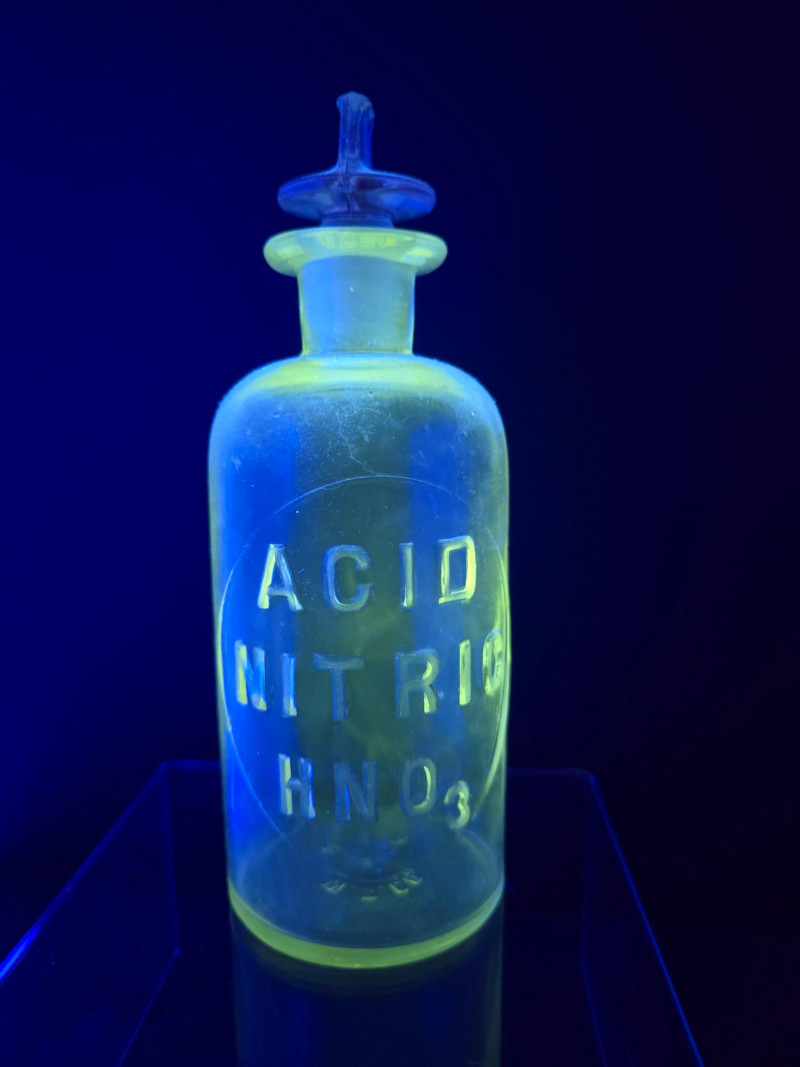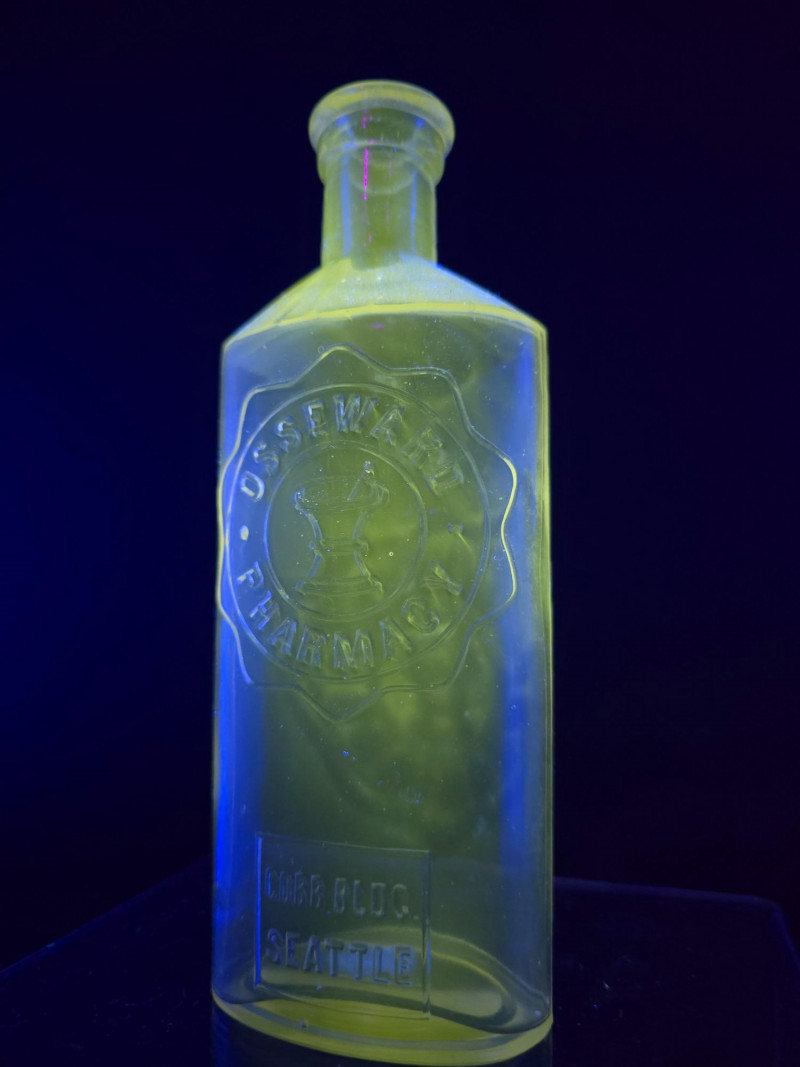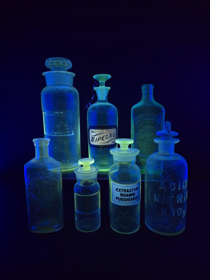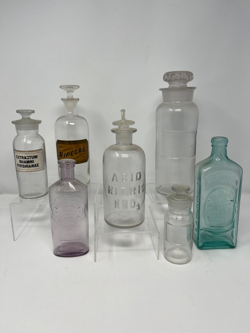 Summary: A fascinating set of eight vintage pharmacy bottles ranging from 5.5" to 10.5" tall, including embossed and labeled examples from historic drug companies. Highlights include two embossed Owl Drug Co. bottles—one in light purple and one in greenish-blue—plus a labeled Extractum Nucis Vomicae bottle, a clear Acid Nitric HNO₃ bottle, and several unmarked vessels. Some pieces glow under UV light, suggesting uranium or manganese content. A compelling mix of medical history, glass artistry, and collector intrigue. Manganese glass: This type of glass was used to decolorize glass and can be found in clear or colored pieces that have a faint green glow under UV light. Pre-1930s manganese glass is rarer and can be more valuable than common Depression-era uranium glass. Maker(s): Owl Drug Co. (embossed) Pharm. Musshianae (label) Unmarked/embossed acid bottle Material: Pressed and blown glass Color Palette: Clear, light purple, greenish-blue Dimensions: 5.5" to 10.5" tall Design Features: Embossed logos and pharmaceutical terms Paper labels with Latin and chemical names Varied neck and base styles Some UV-reactive glass Era: Late 19th to early 20th century Condition: Very good vintage; minor residue and label wear consistent with ageItem Details