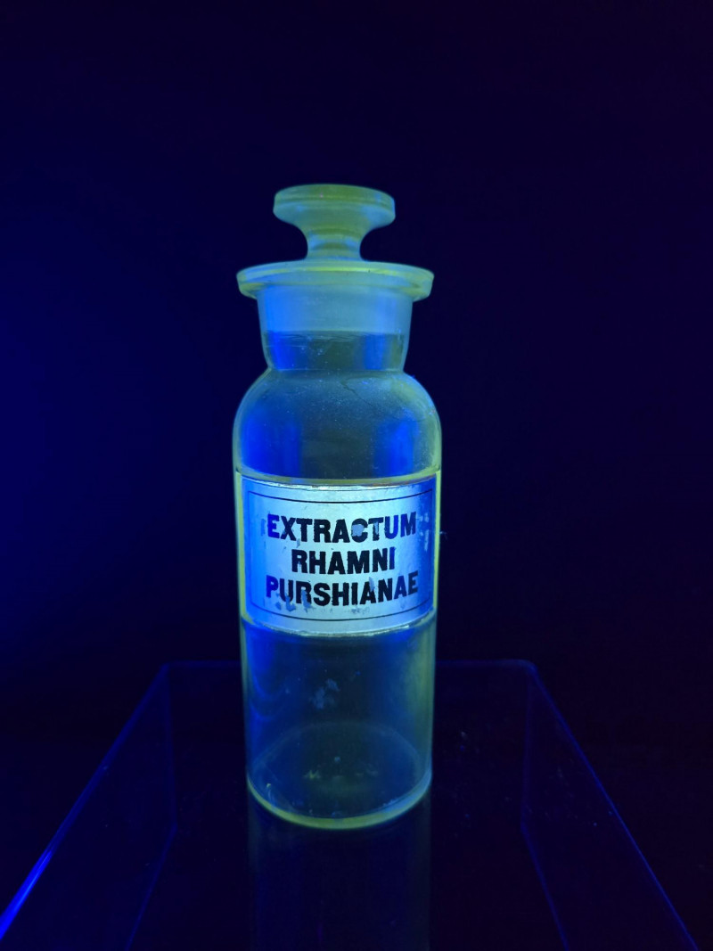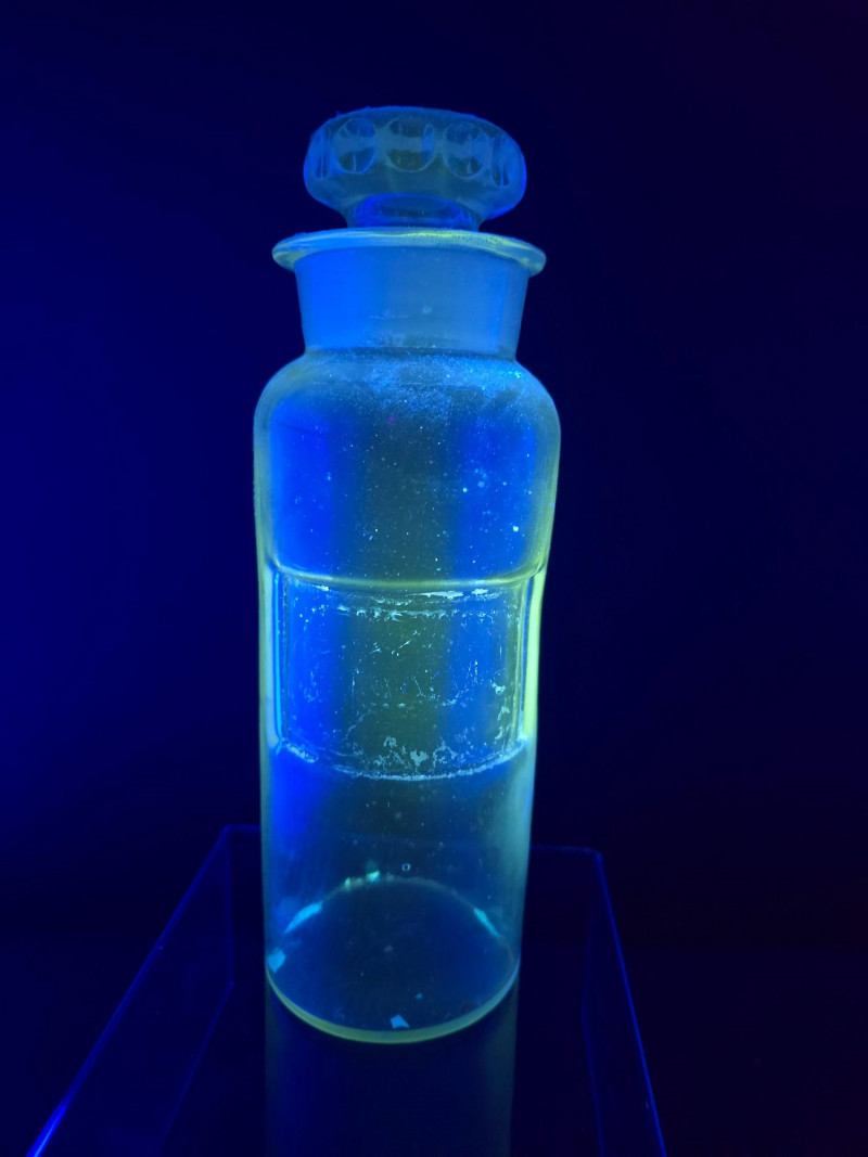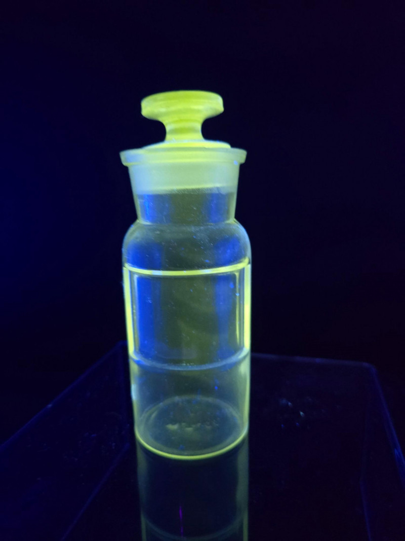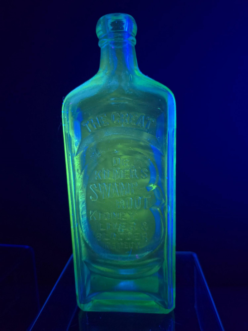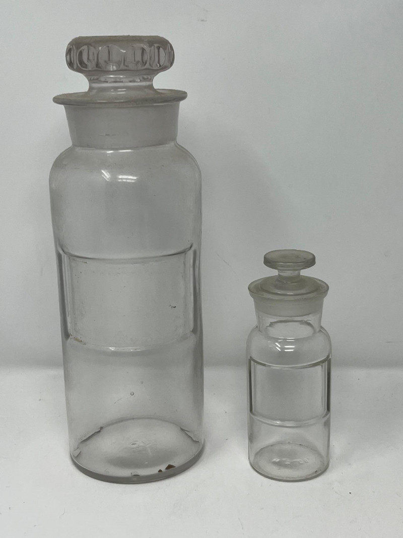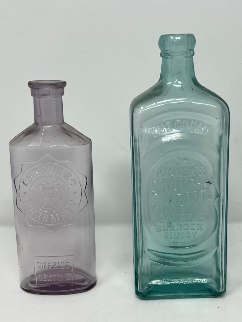 Summary: A fascinating set of eight vintage pharmacy bottles ranging from 5.5" to 10.5" tall, including embossed and labeled examples from historic drug companies. Highlights include two embossed Owl Drug Co. bottles—one in light purple and one in greenish-blue—plus a labeled Extractum Nucis Vomicae bottle, a clear Acid Nitric HNO₃ bottle, and several unmarked vessels. Some pieces glow under UV light, suggesting uranium or manganese content. A compelling mix of medical history, glass artistry, and collector intrigue. Manganese glass: This type of glass was used to decolorize glass and can be found in clear or colored pieces that have a faint green glow under UV light. Pre-1930s manganese glass is rarer and can be more valuable than common Depression-era uranium glass. Maker(s): Owl Drug Co. (embossed) Pharm. Musshianae (label) Unmarked/embossed acid bottle Material: Pressed and blown glass Color Palette: Clear, light purple, greenish-blue Dimensions: 5.5" to 10.5" tall Design Features: Embossed logos and pharmaceutical terms Paper labels with Latin and chemical names Varied neck and base styles Some UV-reactive glass Era: Late 19th to early 20th century Condition: Very good vintage; minor residue and label wear consistent with ageItem Details
