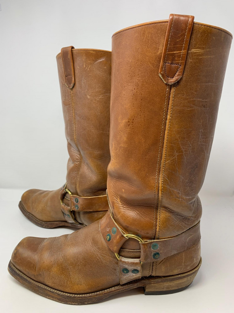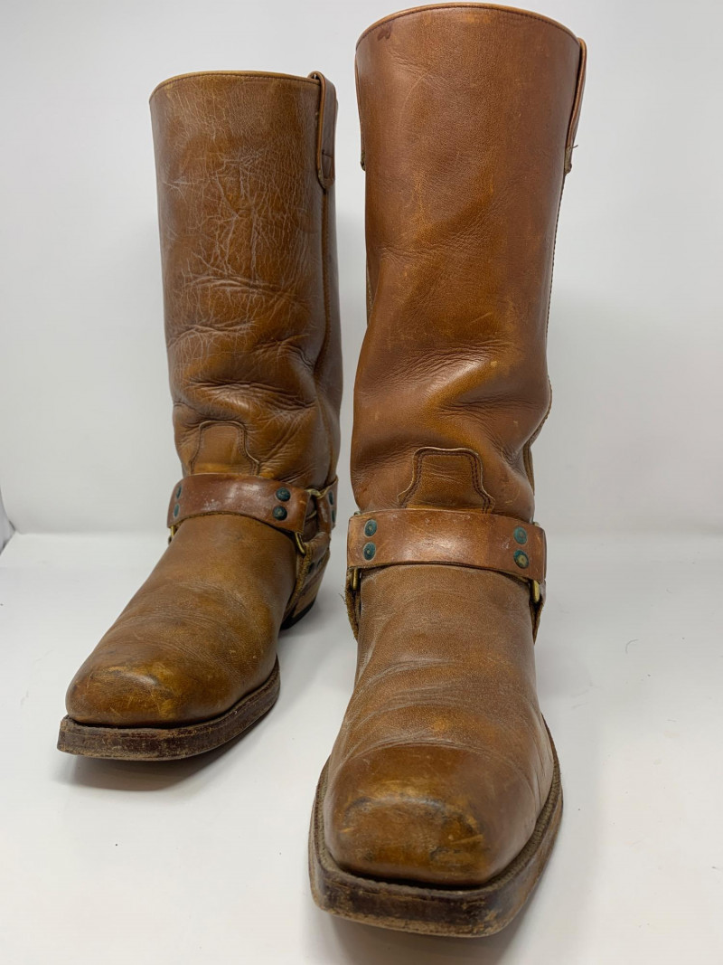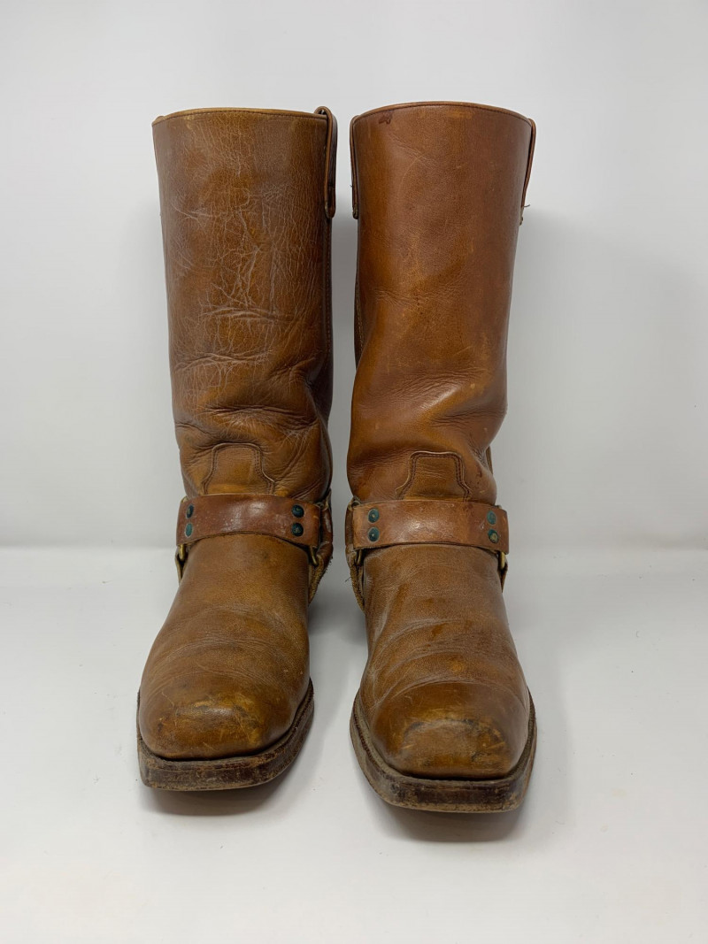 Summary: A pair of classic Frye Harness 12R boots in distressed brown oiled leather, size 12D men’s. These iconic motorcycle-style boots feature a square toe, ankle harness strap with brass hardware, and Goodyear welt construction. Inspired by Civil War cavalry gear, Frye’s Harness line is known for its durability, American craftsmanship, and timeless style. This pair shows authentic wear and patina, adding character and vintage appeal. Maker: Frye (USA) Model: Harness 12R Size: 12D Men’s Material: 100% oiled leather upper Color: Brown Sole: Leather and rubber Shaft Height: 12" Design Features: Square toe Brass hardware Ankle harness strap Goodyear welt construction Era: Contemporary heritage line, inspired by 1863 origins Condition: Well-worn vintage; creasing and scuffs consistent with use Item Details