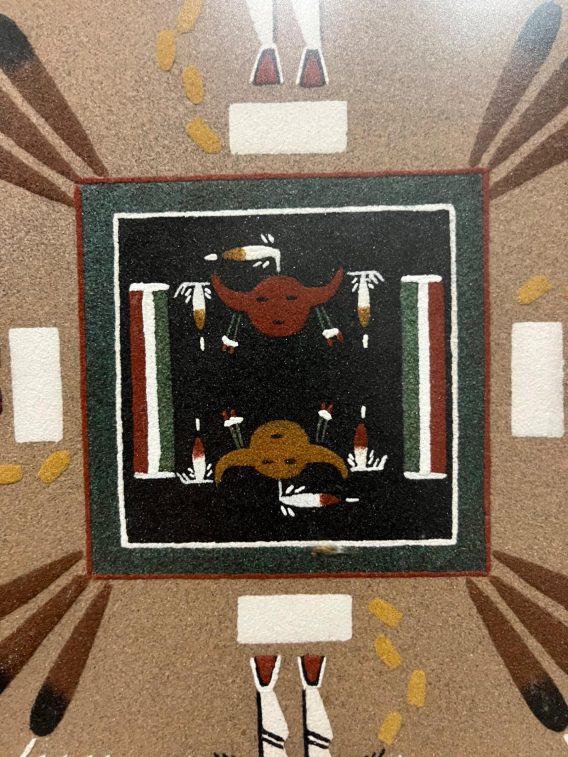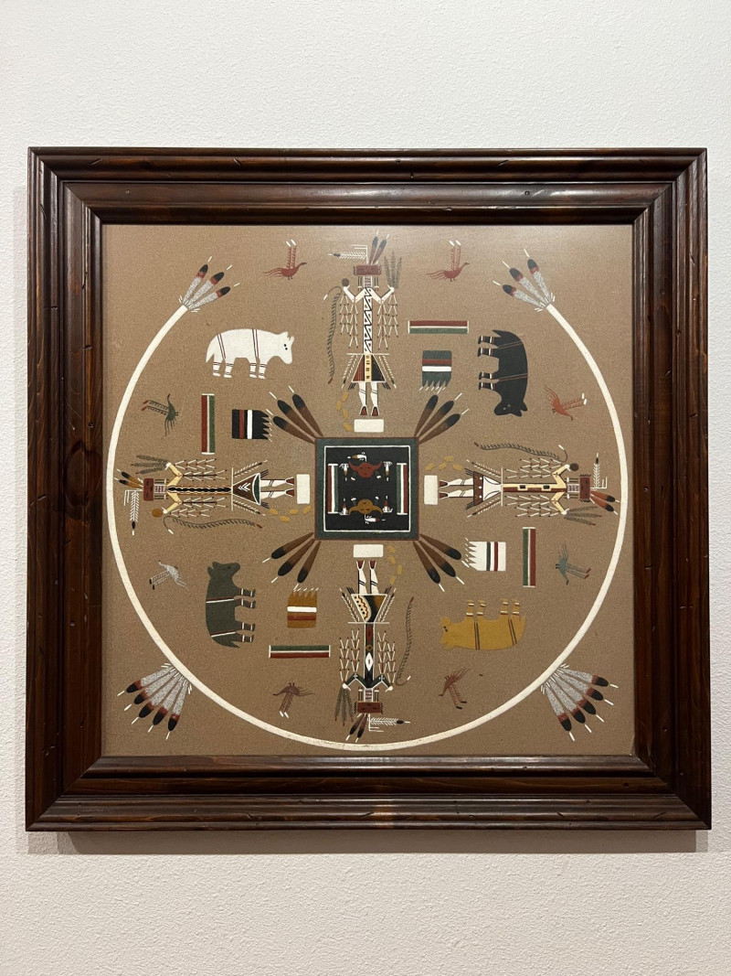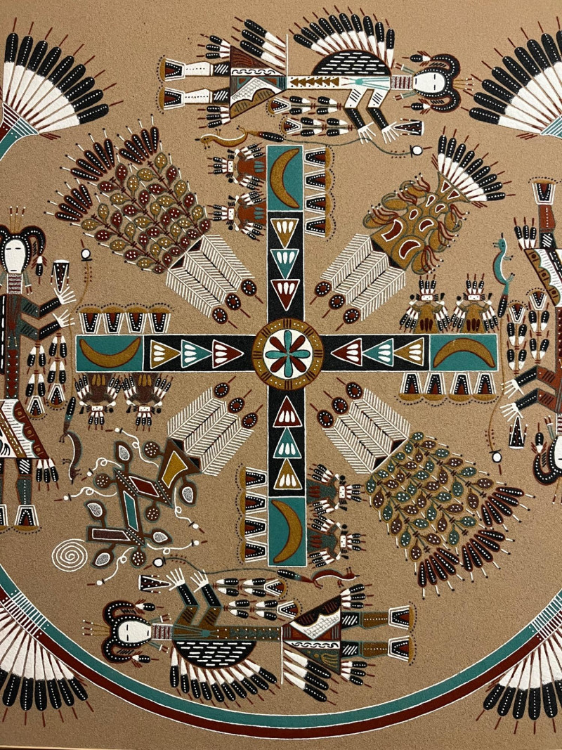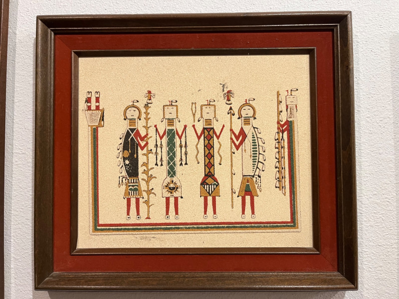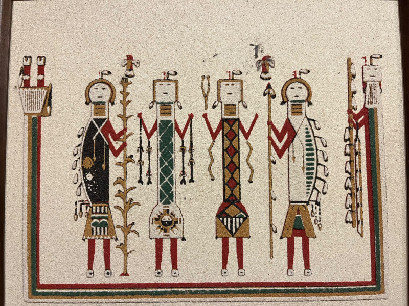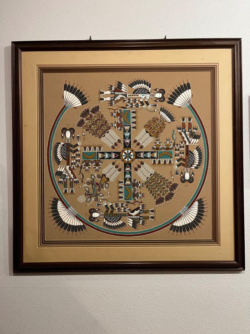 An exceptional collection of three framed Navajo sand paintings, each showcasing distinct aspects of this revered Native American art form. The lot includes: Yei Blessing Figures: A vibrant painting featuring five classic Yei figures, symbolizing blessing and healing. Measurements: 15”x13” Sacred Animals & Whirling Log Motif: An intricate circular design incorporating sacred animals and Yei figures within a powerful ceremonial pattern, possibly representing a "Whirling Log" motif. Measurements: 31.5”x33” Yei & Sacred Directions: A symbolically rich piece with a central cross motif and surrounding Yei figures, representing the cardinal directions and cosmic harmony. Measurements: 29”x29” Each painting is meticulously crafted from natural sands and minerals, showcasing the intricate detail and spiritual significance inherent in Navajo ceremonial art.