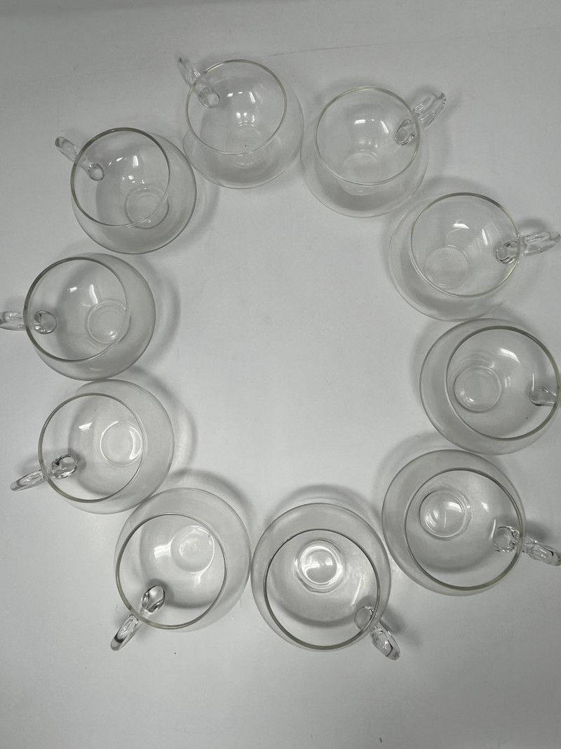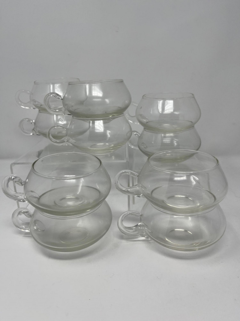 Summary: A sleek and minimalist set of ten vintage punch cups from the “Moderno” line by Riekes Crisa. Each cup is handblown in crystal-clear glass with a rounded bowl and applied handle, showcasing mid-century modern elegance. Ideal for punch service, holiday entertaining, or retro bar setups. These cups pair beautifully with matching bowls and trays from the same line. Maker: Riekes Crisa (Italy/Mexico) Pattern: Moderno Material: Handblown clear glass Dimensions: Width: 4" Height: 2.5" Design Features: Rounded bowl shape Applied loop handle Sleek, unadorned silhouette Era: Mid-20th century (likely 1960s–70s) Condition: Excellent vintage; no chips or cracks noted Item Details