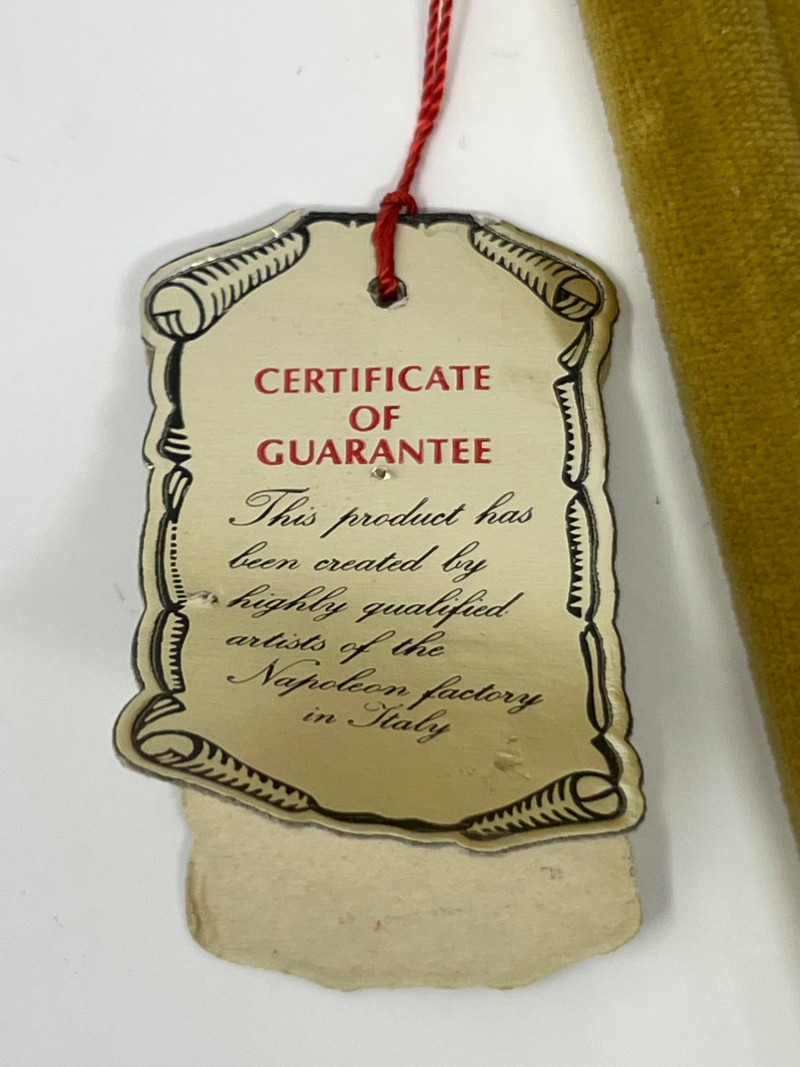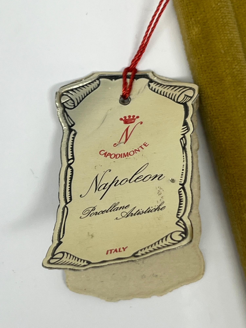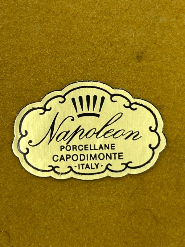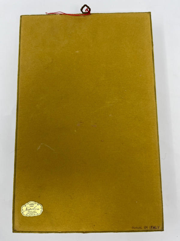 Bring a touch of classic Italian elegance to your home with this exquisite vintage Napoleon Capodimonte porcelain floral wall hanging. This beautiful piece features meticulously handcrafted porcelain flowers in an elegant arrangement, mounted on a plush velvet-covered plaque and framed with a decorative rope-style trim. The vibrant colors and delicate details of the flowers showcase the renowned artistry and craftsmanship characteristic of Capodimonte porcelain. This piece is likely from the "Napoleon" line, a respected manufacturer known for producing high-quality Capodimonte-style porcelain wares. It's a charming decorative item perfect for adding a touch of vintage romance and sophistication to any room, whether in a gallery wall arrangement or as a standalone statement piece. Authentic Capodimonte Style: Handcrafted porcelain flowers in the beloved Capodimonte tradition. Ornate Design: Features an oval-shaped plaque covered in velvet with a detailed rope-style trim. Vibrant Floral Arrangement: Intricate, delicate porcelain flowers in a beautiful color palette. Napoleon Brand: From the esteemed "Napoleon" line of Capodimonte-style porcelain. Vintage Charm: A timeless piece that adds a classic, romantic aesthetic to any decor.