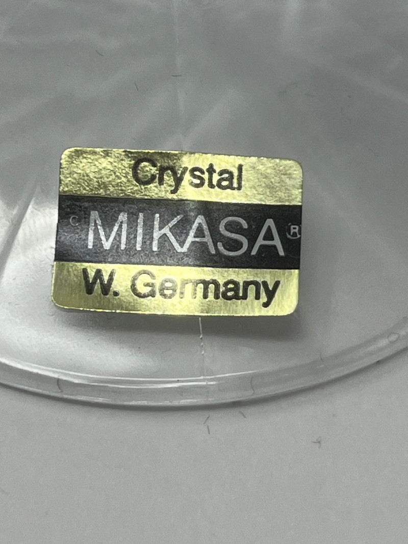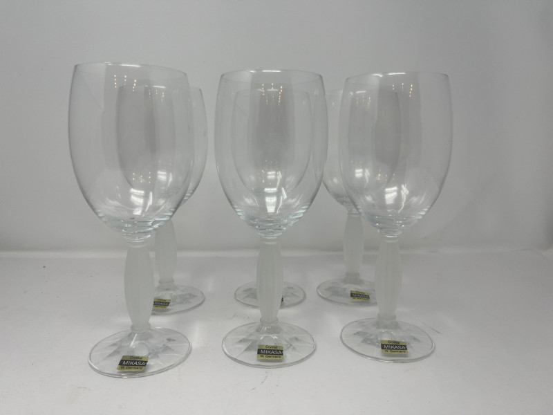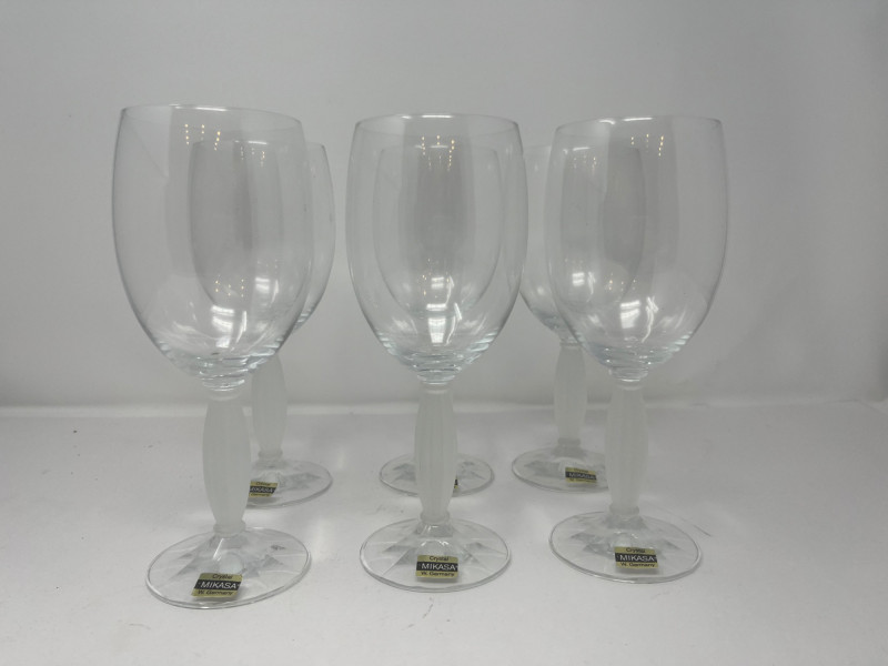 This is a beautiful set of six vintage Mikasa Royal Manor crystal water goblets. These elegant glasses, produced in 1994, feature a clear, rounded bowl perched on a distinctive frosted, fluted column stem with a hexagonal base. All six glasses are in excellent, pre-owned condition, with no chips, cracks, or clouding. The original Mikasa labels are still affixed to the base of each goblet, indicating they were made in West Germany. This particular pattern has been discontinued, making this a rare find for collectors or those looking to add a touch of classic sophistication to their home. Perfect for special occasions, holiday dinners, or as a thoughtful gift. Details: Brand: Mikasa Pattern: Royal Manor Type: Water Goblet / Wine Glass Material: Crystal Country of Origin: West Germany Year of Production: 1994 Condition: Excellent vintage condition. Original labels on all six glasses.