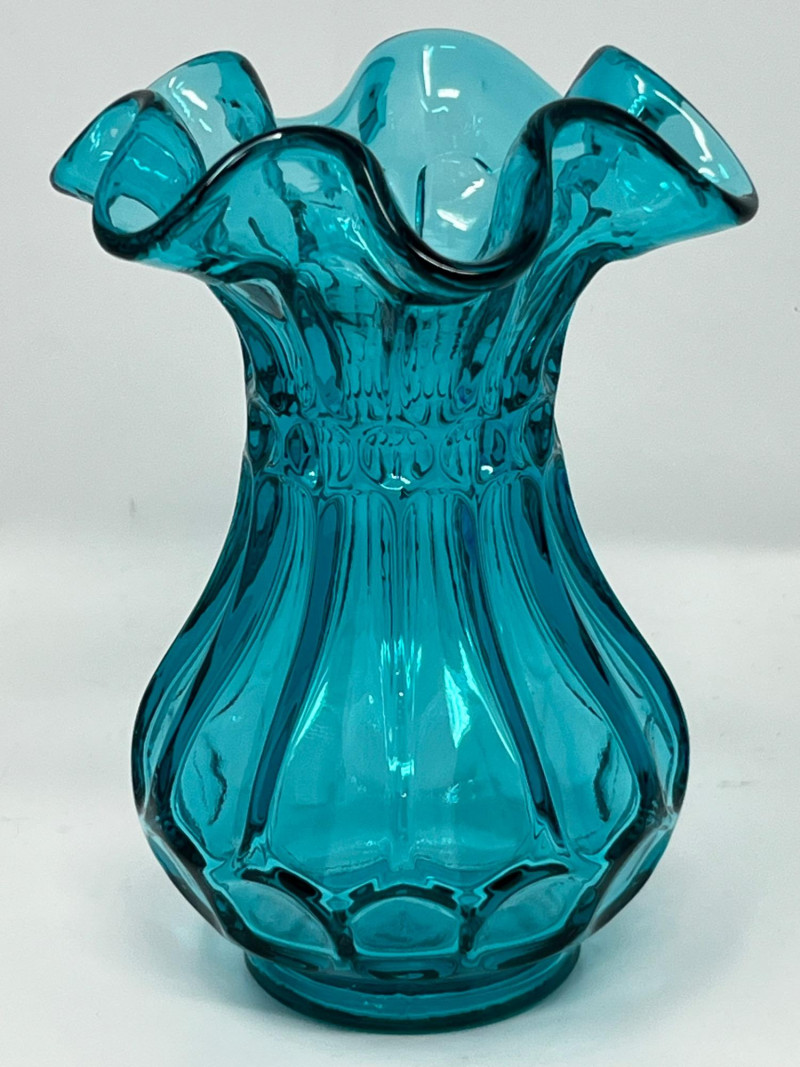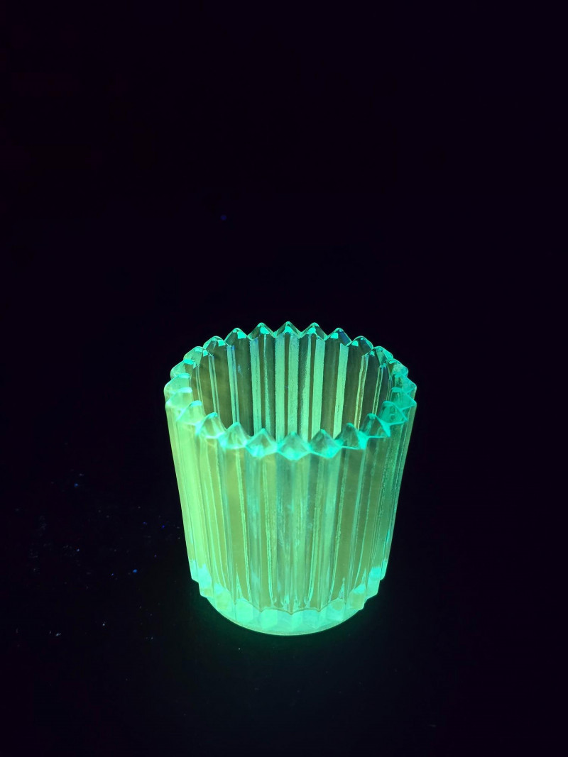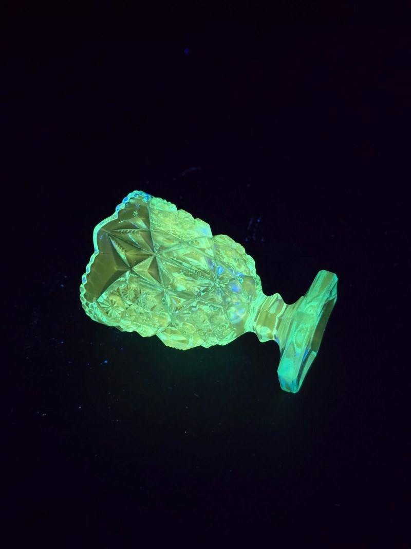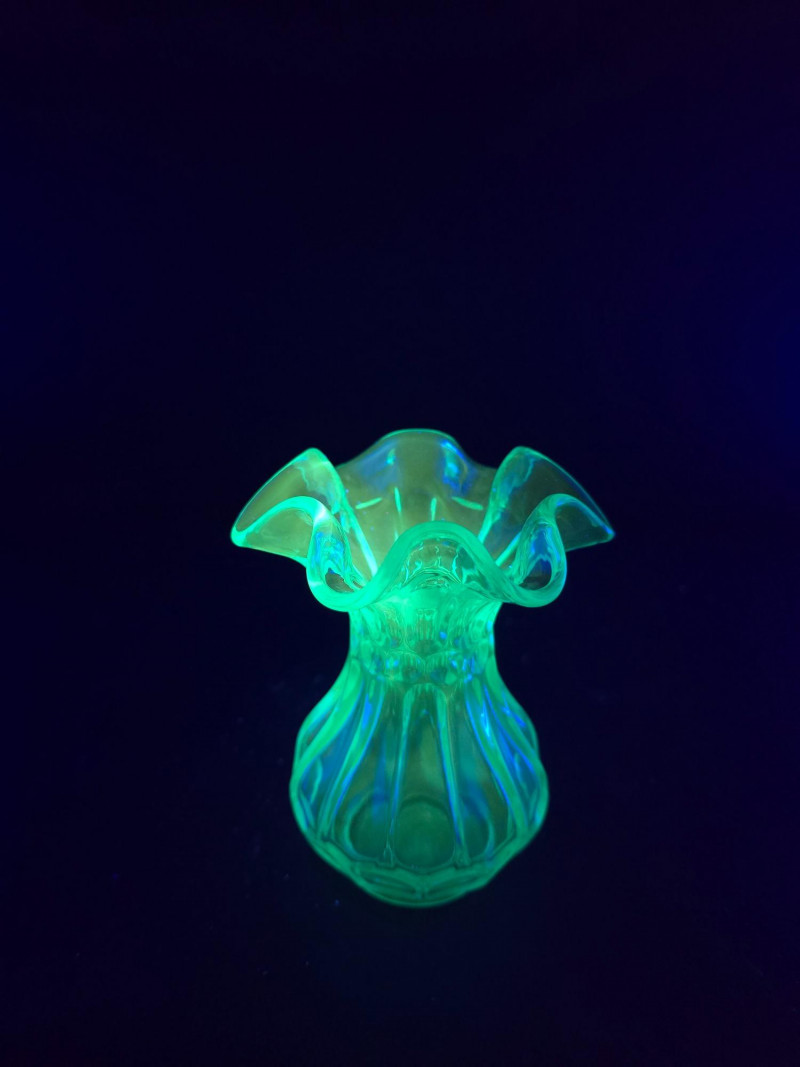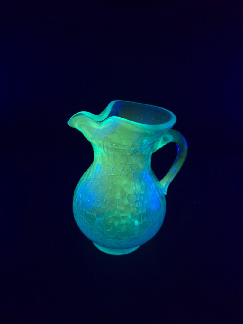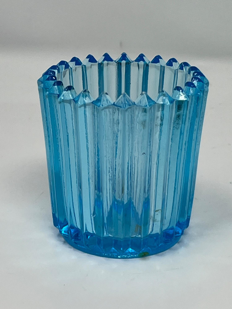 Summary: A radiant ensemble of six vintage blue glass pieces, each glowing vividly under black light. Includes a ruffled vase, two textured pitchers, a bird figurine, a ribbed votive holder, and an ornate mini vessel. Ranging from teal to cobalt, this coordinated set blends mid-century charm with glowing whimsy—ideal for vanity styling, shelf display, or collectors of UV-reactive glass. Material: Molded and pressed glass with confirmed UV-reactive properties Color Range: Teal, cobalt, and light blue tones Set Includes: 1 ruffled vase with vertical ribbing 2 textured pitchers (one large, one small) 1 blue bird figurine 1 ribbed votive holder 1 ornate mini vessel or candle holder Dimensions: Varying from approx. 3" to 8" tall Design Features: Ribbed, ruffled, and textured surfaces Glows under black light due to manganese or uranium content Era: Mid-20th century to late 20th century (attributed) Condition: Excellent vintage; no chips or cracks noted Item Details