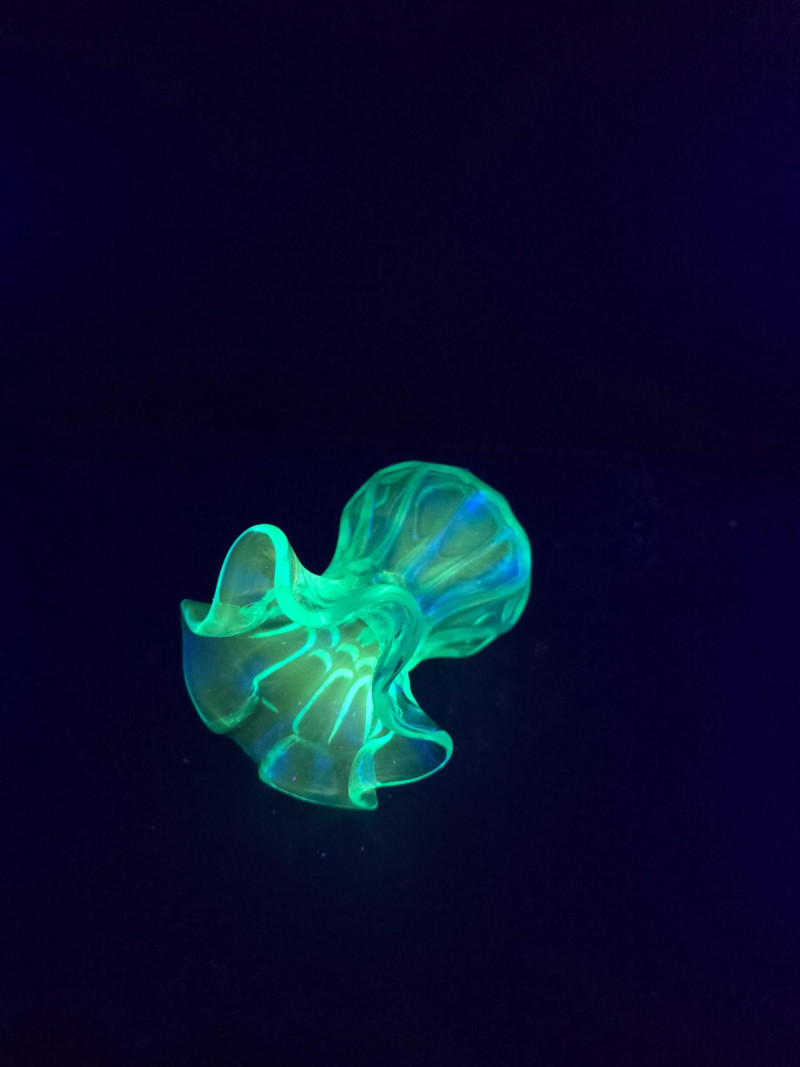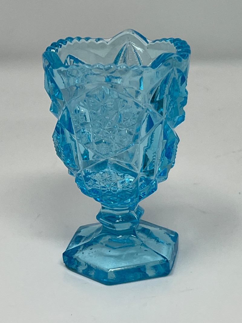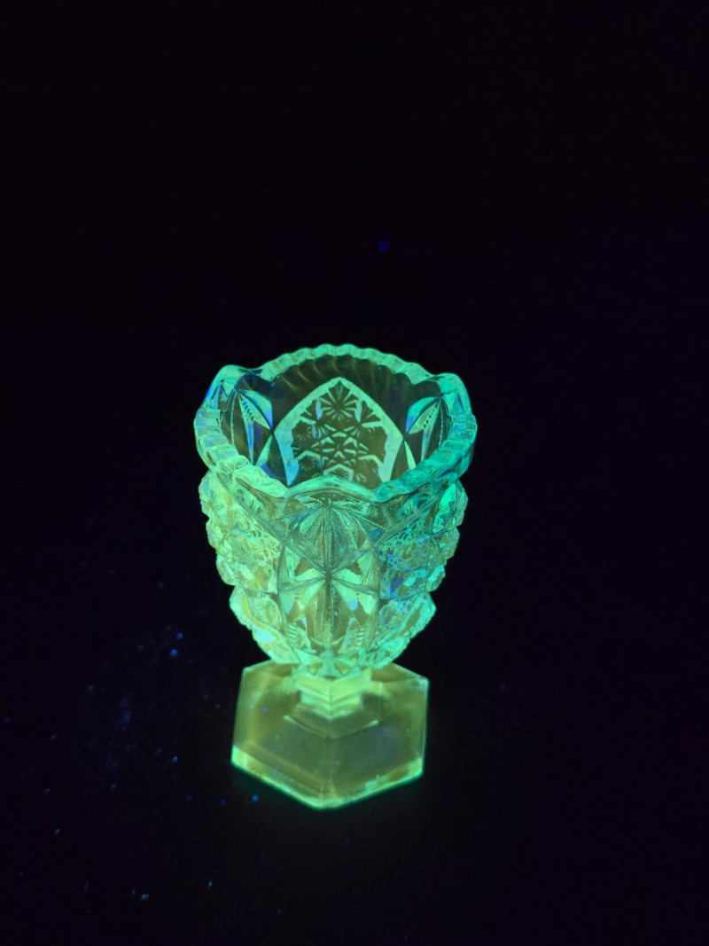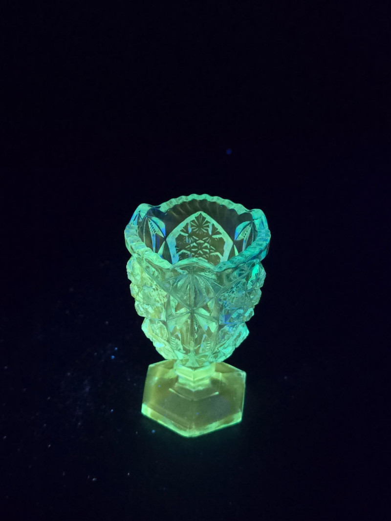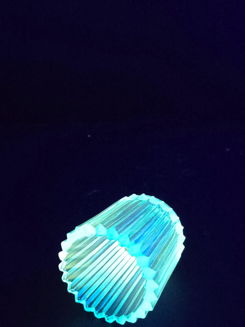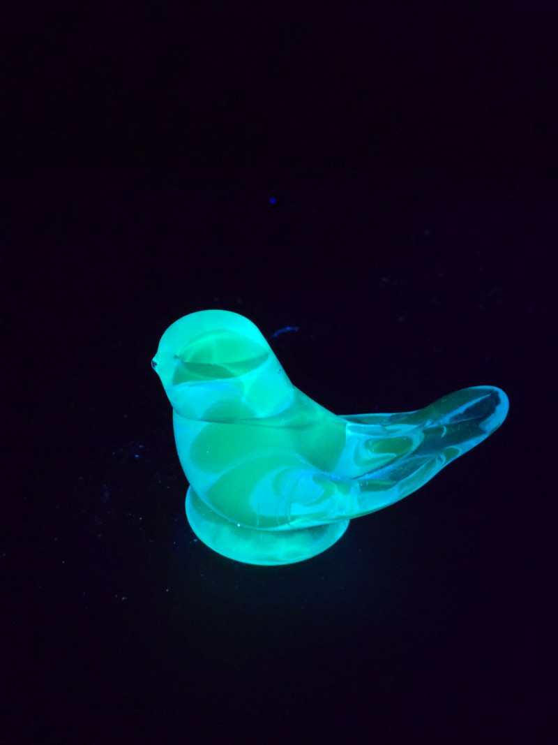Summary: A radiant ensemble of six vintage blue glass pieces, each glowing vividly under black light. Includes a ruffled vase, two textured pitchers, a bird figurine, a ribbed votive holder, and an ornate mini vessel. Ranging from teal to cobalt, this coordinated set blends mid-century charm with glowing whimsy—ideal for vanity styling, shelf display, or collectors of UV-reactive glass. Material: Molded and pressed glass with confirmed UV-reactive properties Color Range: Teal, cobalt, and light blue tones Set Includes: 1 ruffled vase with vertical ribbing 2 textured pitchers (one large, one small) 1 blue bird figurine 1 ribbed votive holder 1 ornate mini vessel or candle holder Dimensions: Varying from approx. 3" to 8" tall Design Features: Ribbed, ruffled, and textured surfaces Glows under black light due to manganese or uranium content Era: Mid-20th century to late 20th century (attributed) Condition: Excellent vintage; no chips or cracks noted Item Details