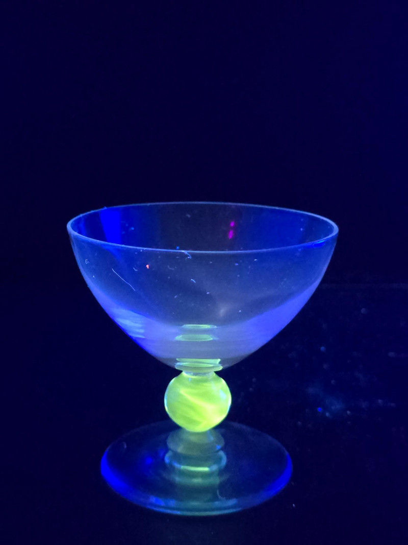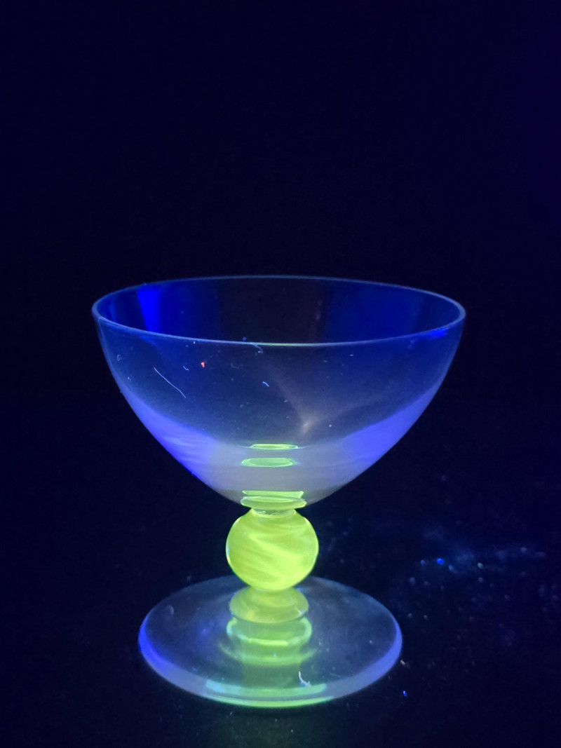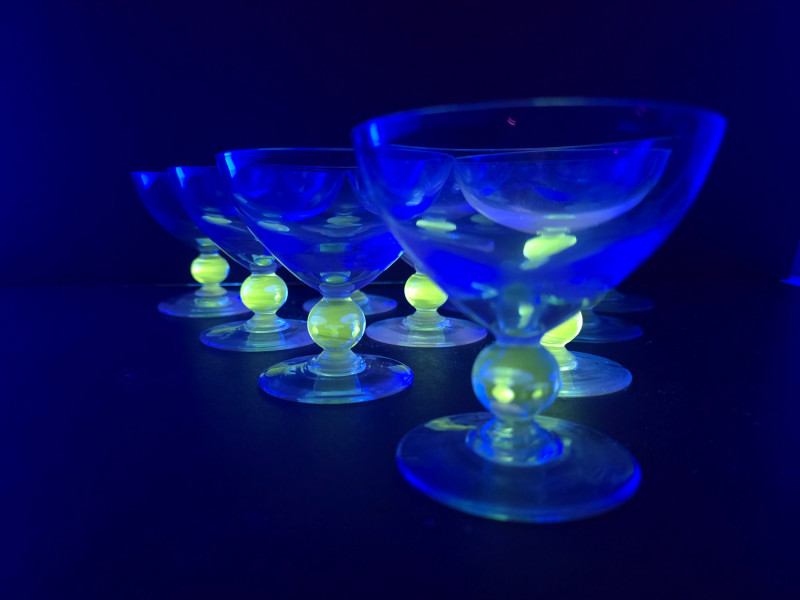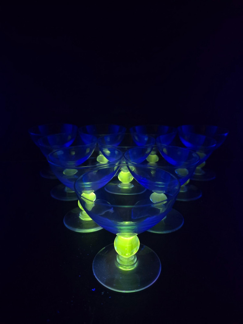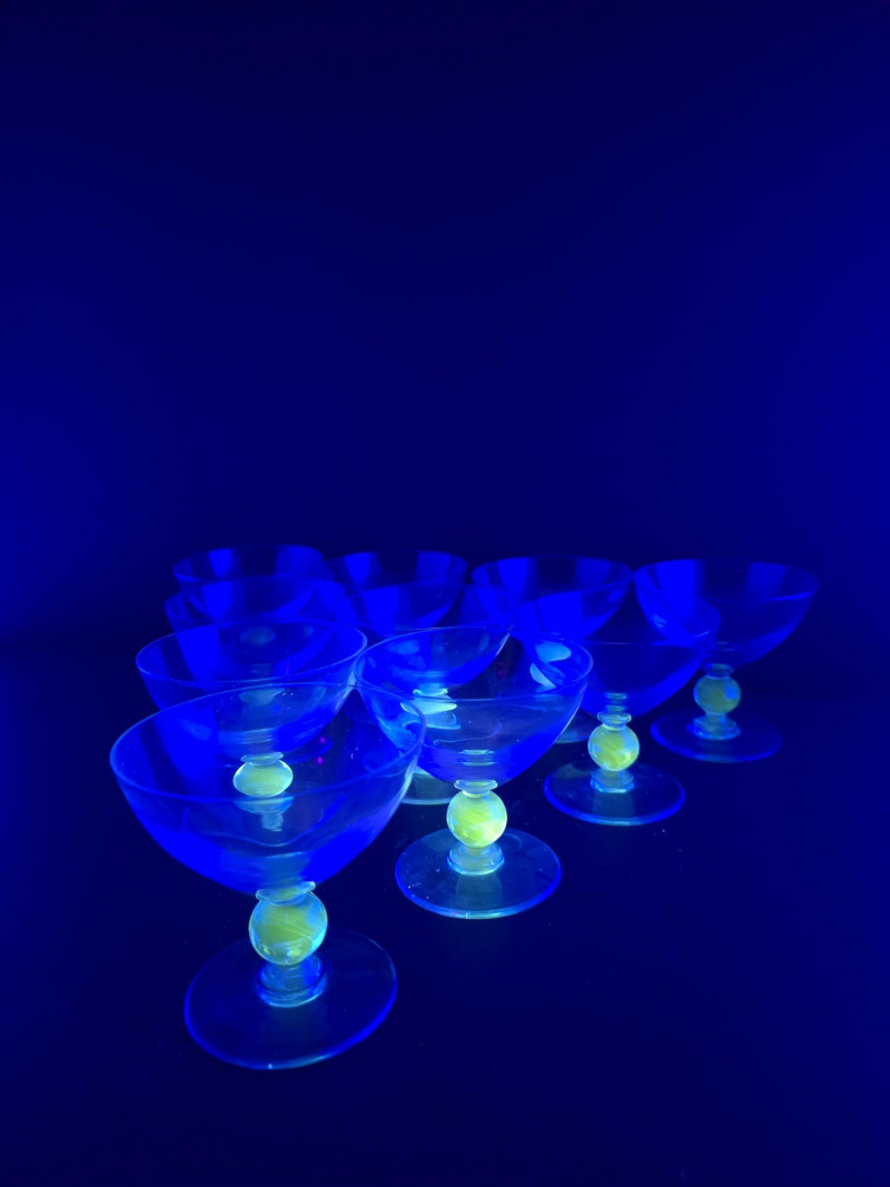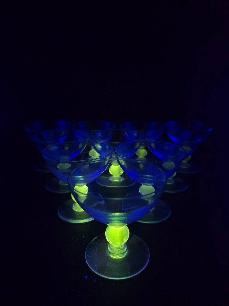 Summary: A dazzling set of ten vintage dessert or cocktail bowls in translucent blue glass, each glowing vividly under black light. These 3.5" wide coupe-style dishes feature wide bowls and short stems with a distinctive clear orb detail. Likely mid-century or revival vintage, they blend atomic-age elegance with radiant charm—ideal for entertaining, display, or collectors of glowing glass. Material: Molded glass with confirmed UV-reactive properties Color: Translucent blue with clear stem orb Dimensions: Width: 3.5" Height: 3.5" Design Features: Coupe-style bowl with short stem Clear spherical stem accent Glows under black light due to uranium or manganese content Era: Mid-20th century to late 20th century (attributed) Condition: Excellent vintage; no chips or cracks noted Item Details