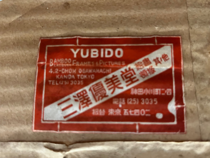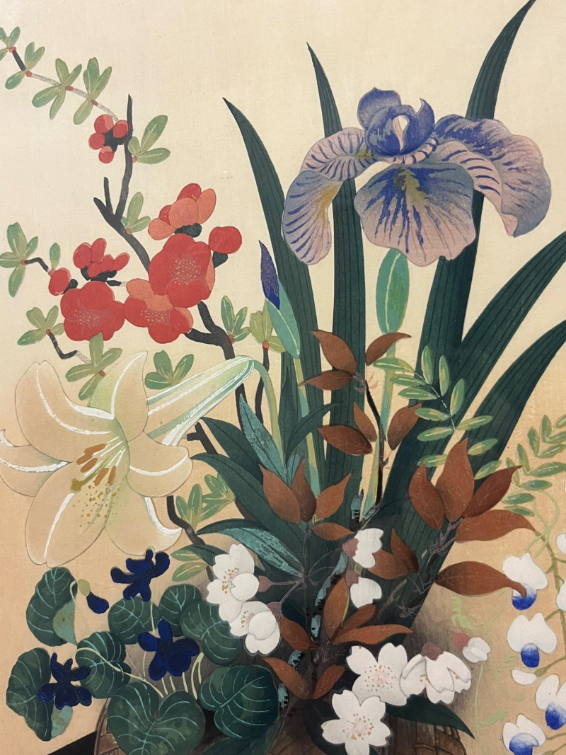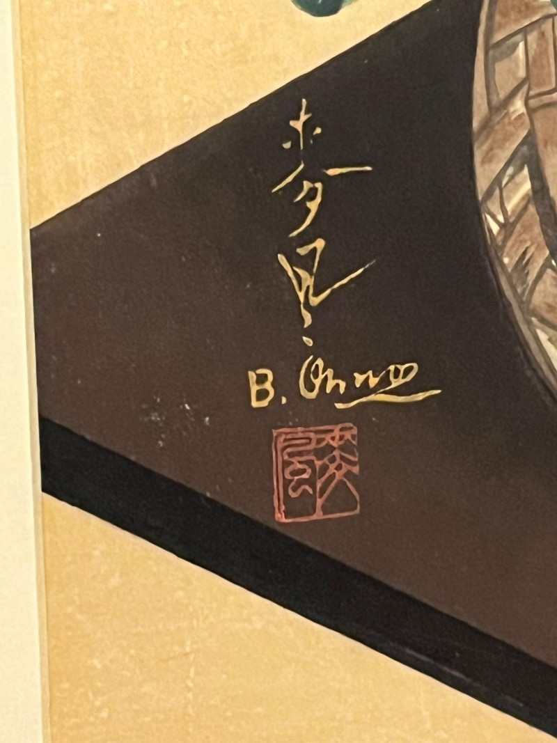 Summary: A masterful kachō-e (bird-and-flower) woodblock print by Ohno Bakufu (1888–1976), titled Flowers in Bamboo Basket (Spring). This composition features irises, lilies, and orchids arranged in a woven basket, rendered with delicate linework and subtle color gradations. Published by Kyoto Hanga-In in the 1950s, the print is framed in a bamboo-style frame by Tokyo’s Yubido studio. A serene and elegant celebration of seasonal beauty from one of Japan’s most respected 20th-century printmakers. Artist: Ohno Bakufu (大野麦風, 1888–1976) Title: Flowers in Bamboo Basket (Spring) Publisher: Kyoto Hanga-In Medium: Woodblock print (mokuhanga) Format: Oban (approx. 27 × 37.5 cm image size) Frame: Bamboo-style frame by Yubido, Tokyo Dimensions (Framed): 21" L × 16" W Era: 1950s Condition: Excellent; vibrant colors and clean impressionItem Details