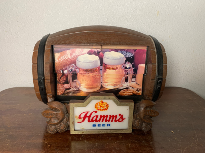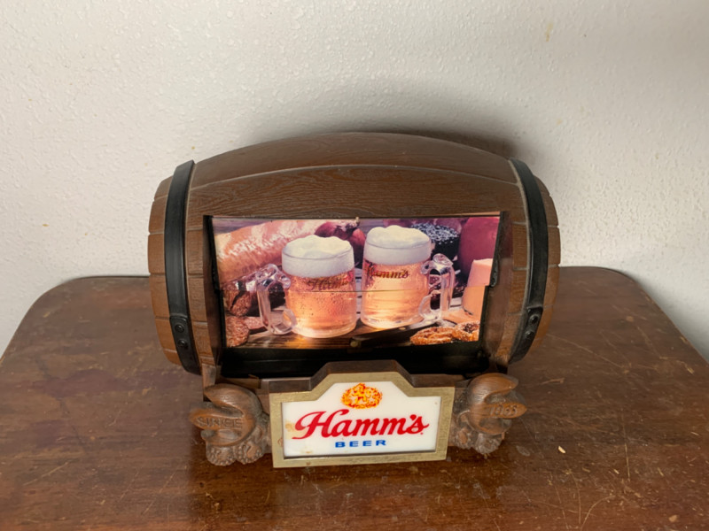 This is a beautiful, highly collectible vintage Hamm's Beer sign from the 1960s. The sign is designed to look like a wooden barrel and features a lighted, rotating "flipper" mechanism that cycles through a series of eight different scenes. The dimensional Hamm's logo at the bottom also lights up, making this a classic piece of breweriana for any collector. Authentic Vintage: A genuine piece of mid-century breweriana. Lighted Motion Sign: The internal scenes and the Hamm's logo are illuminated. Rotating Flipper: The inner mechanism rotates to display a sequence of different images. Barrel Design: The sign is shaped like a wooden barrel with a realistic woodgrain texture. Condition: This sign is in excellent vintage condition and is fully functional. The motor runs smoothly, and the flipper mechanism changes scenes without issue. The light works perfectly, illuminating both the scenes and the Hamm's logo. There are no cracks or major damage to the plastic, only minor signs of wear consistent with its age. This iconic Hamm's Beer sign would be a great addition to any home bar, man cave, or collection of vintage advertising.