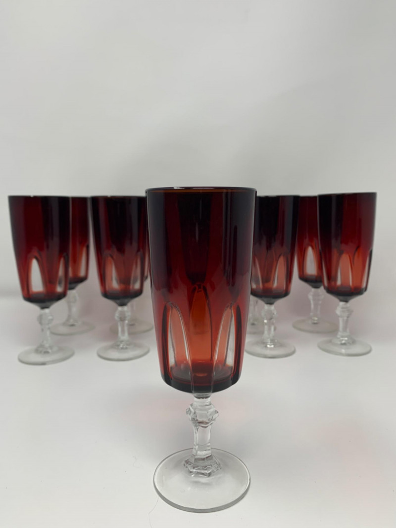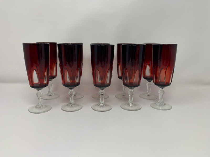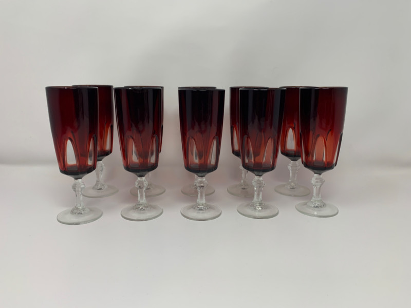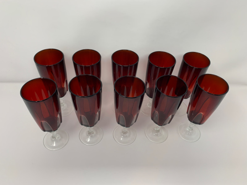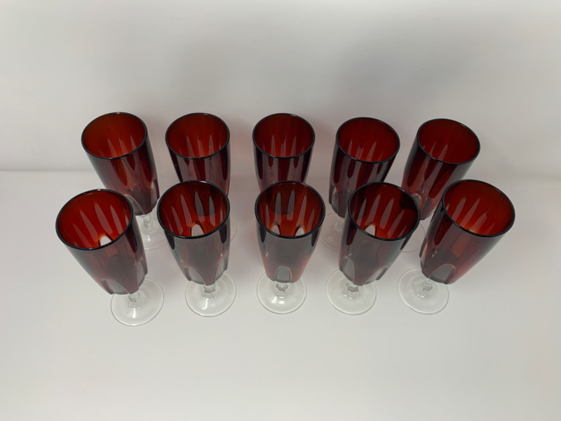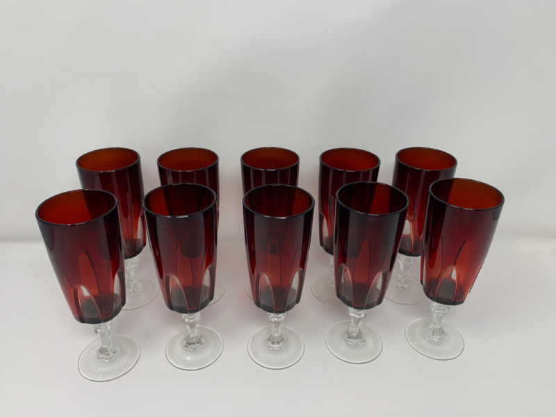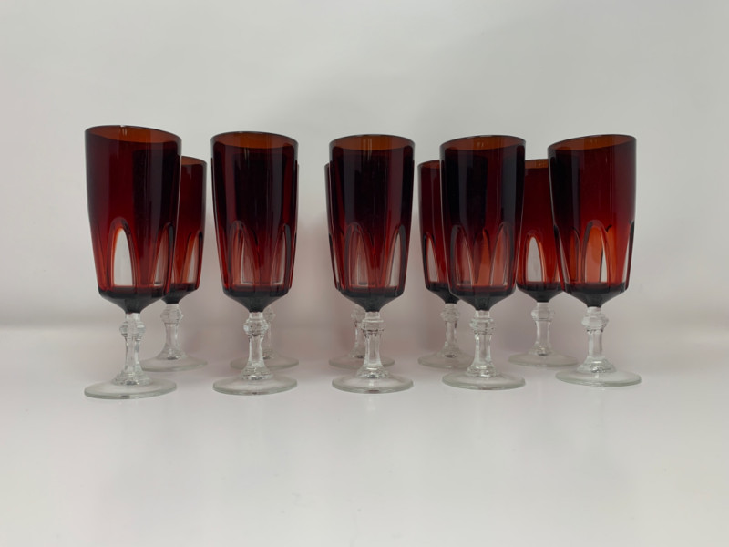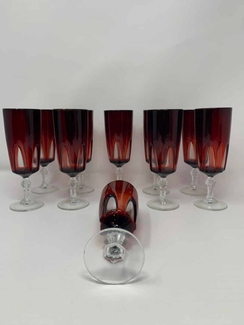 Elevate your next celebration with this exquisite set of 10 vintage champagne flutes. This is the highly sought-after "Rubilux" pattern, also known as "Gothic," produced by Luminarc/Cristal D'Arques in France during the 1960s and 1970s.Features:Material: The flutes are made of crystal glass with a stunning ruby red overlay. The stems and bases are clear crystal. Design: The design features a "cut-to-clear" technique, creating a distinctive gothic arch pattern on the red crystal bowl. The stem has an elegant hexagonal shape. Origin: Made in France by Luminarc, part of the French ARC Group. Condition: All 10 glasses are in excellent vintage condition with no chips, cracks, or fading. They are structurally sound and ready for use. Measurements: Each glass is approximately 6" x 2" This rare and elegant set is perfect for special occasions, from a holiday dinner to a unique wedding toast. Due to their vintage nature, they may show signs of light wear consistent with age and use.
