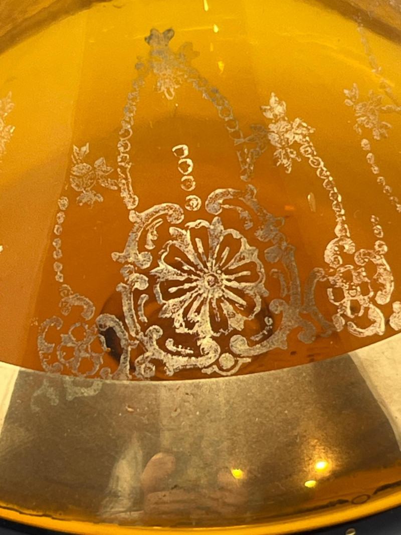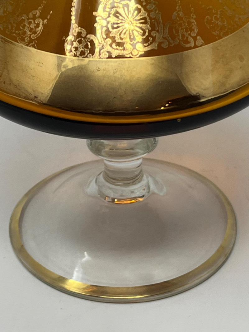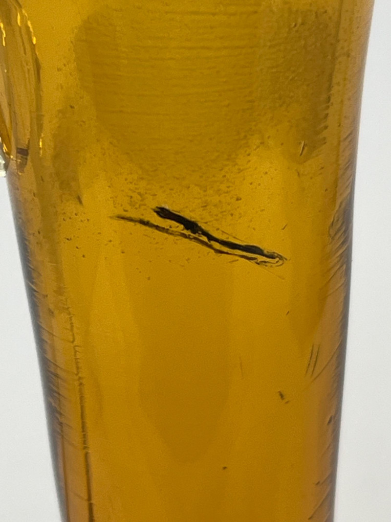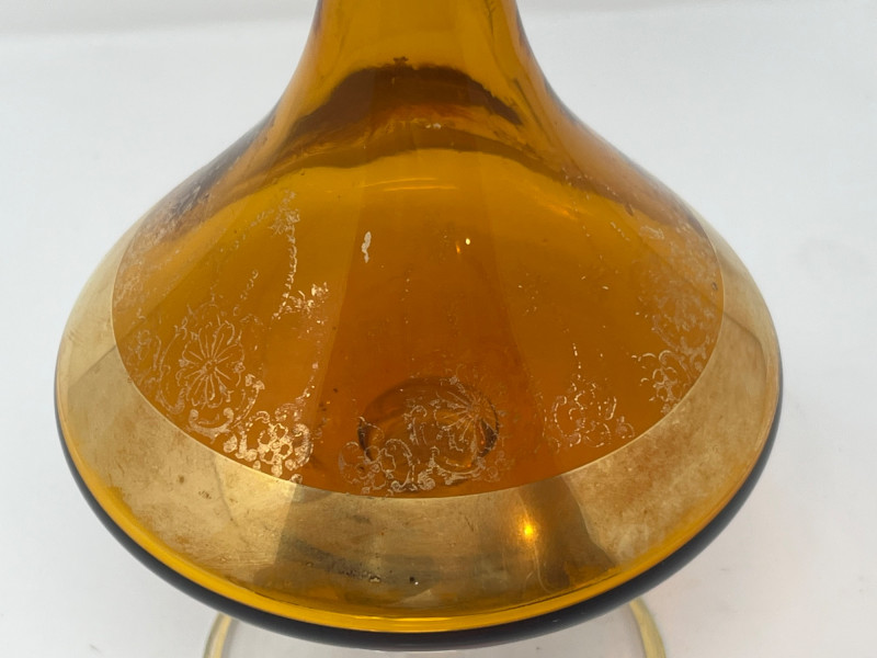 Summary:A luminous vintage amber glass decanter in the style of Empoli or Barsottini, featuring a handblown body with a bulbous base, slender neck, and twisted clear glass handle. The base is adorned with a gold-painted ornamental band, and the piece is crowned with its original clear glass teardrop stopper. Likely Italian, circa 1950s–60s, this carafe blends sculptural elegance with warm mid-century tones. A standout for barware collectors or lovers of Italian art glass. Maker: Unmarked; attributed to Empoli or Barsottini (Italy) Material: Handblown amber glass with clear glass accents Color: Rich amber with gold detailing Dimensions: 7" L × 7" W × 15" H Design Features: Twisted clear glass handle Teardrop stopper (original) Gold-painted ornamental band near base Controlled bubbles and vintage imperfections Era: Mid-20th century (1950s–60s) Condition: No chips or cracks Minor wear to gold detailing Black mark on neck notedItem Details