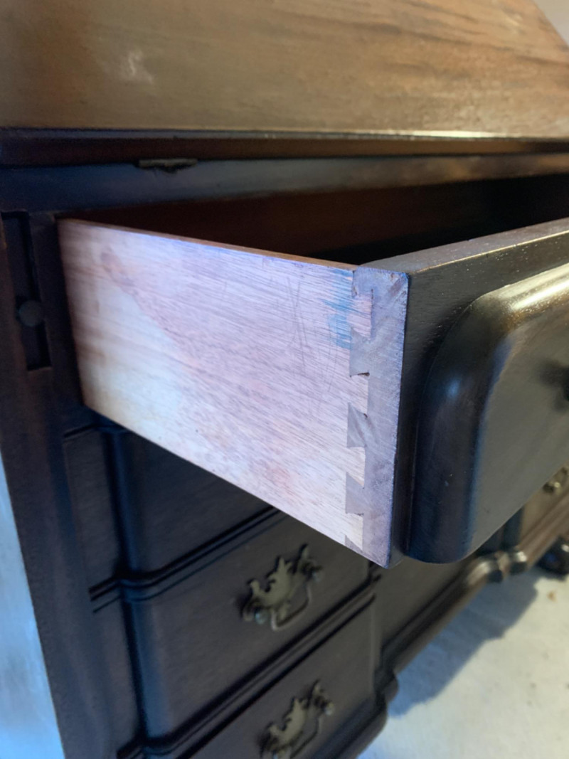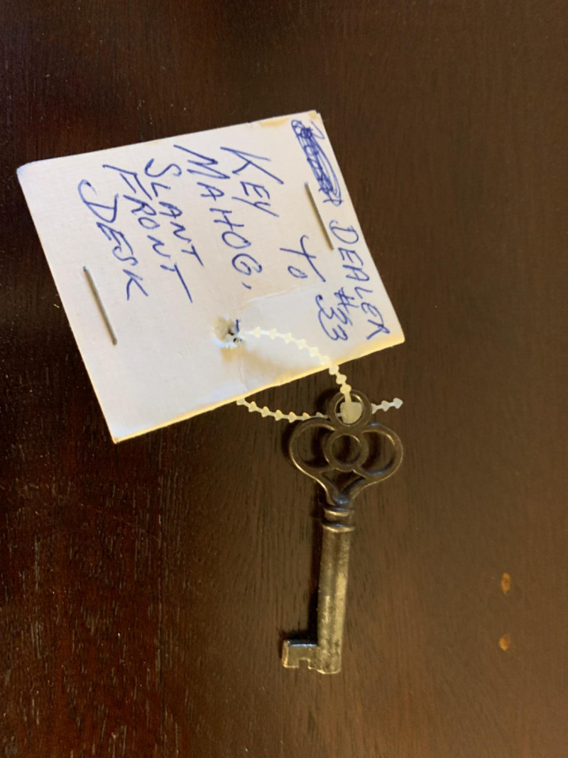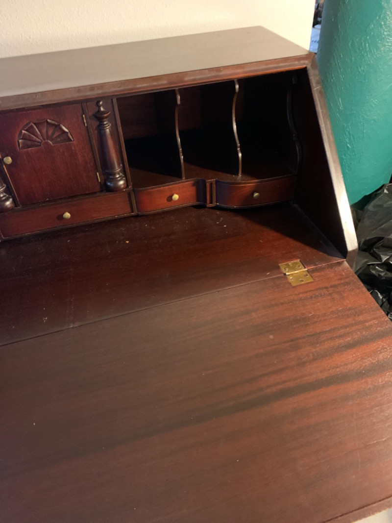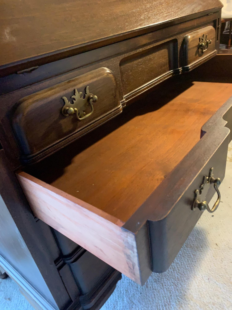 This desk is in good vintage condition with signs of use and age, including minor surface wear and a natural patina on the wood and hardware. The drawers have dovetail joints, which are visible in some photos. The writing surface may or may not lock. As with all vintage furniture, it is being sold "as-is."
