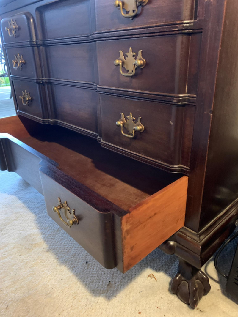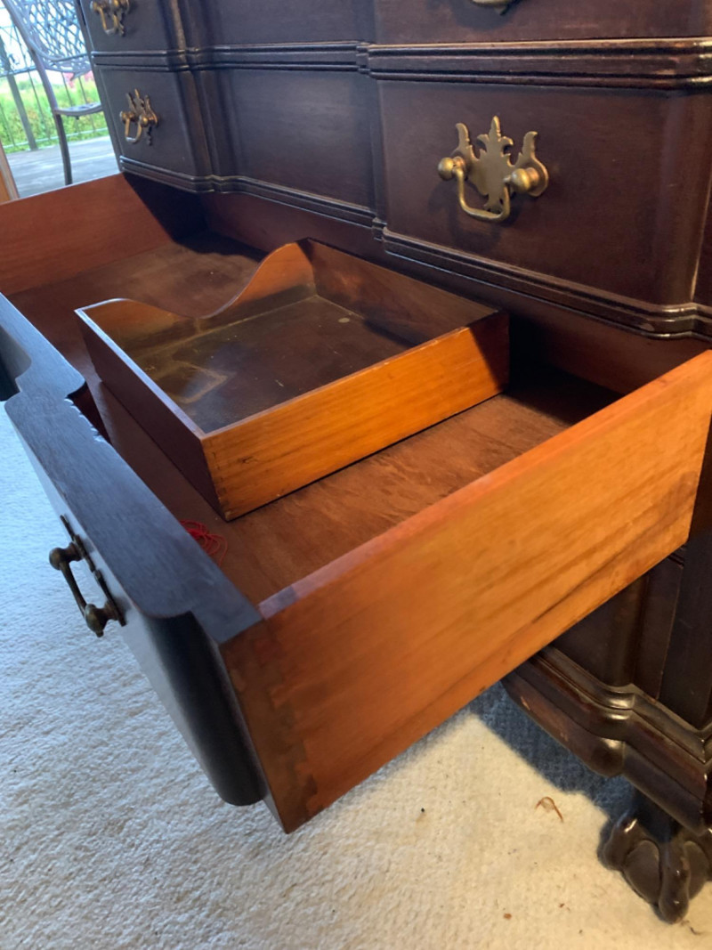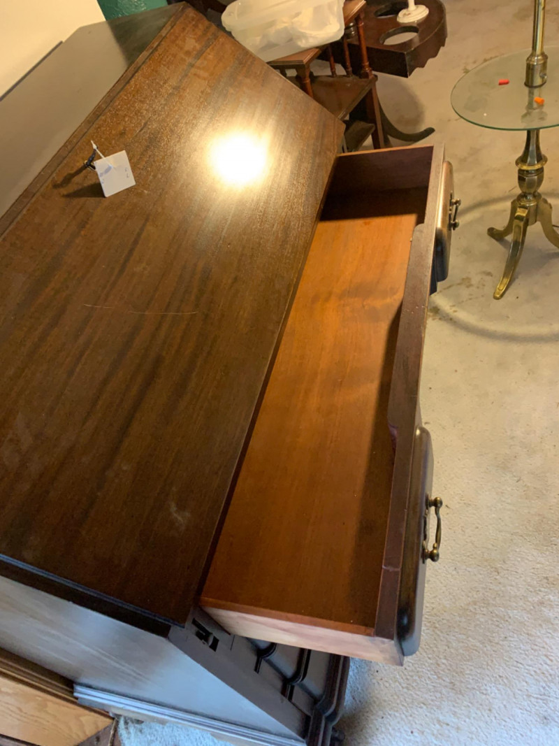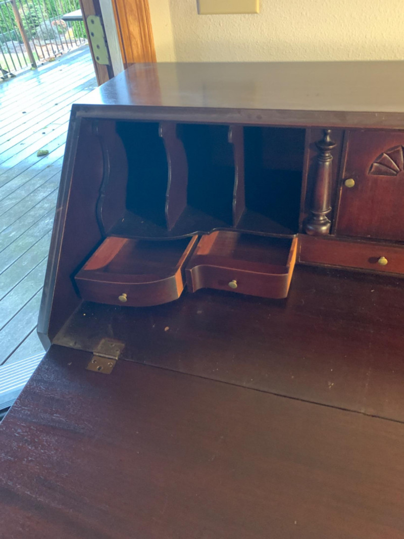 This desk is in good vintage condition with signs of use and age, including minor surface wear and a natural patina on the wood and hardware. The drawers have dovetail joints, which are visible in some photos. The writing surface may or may not lock. As with all vintage furniture, it is being sold "as-is."