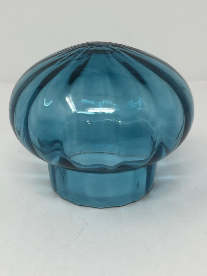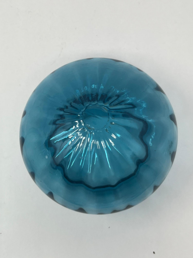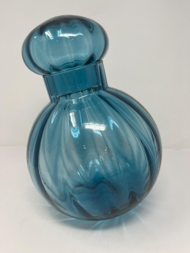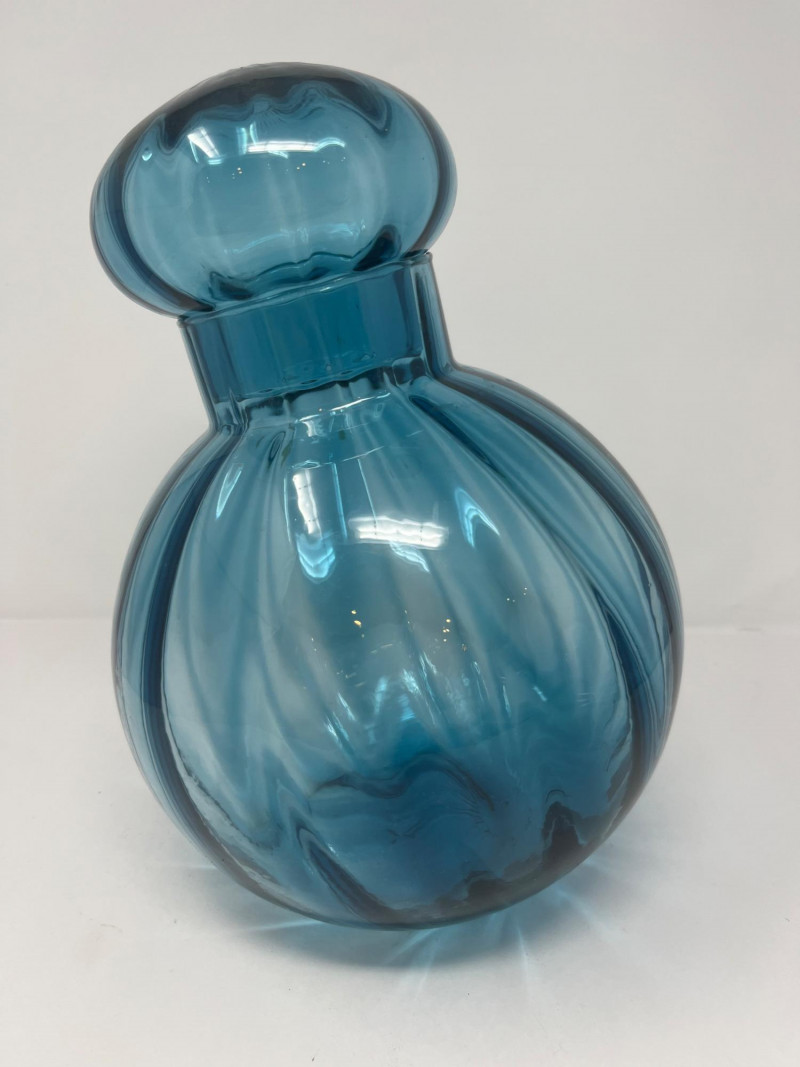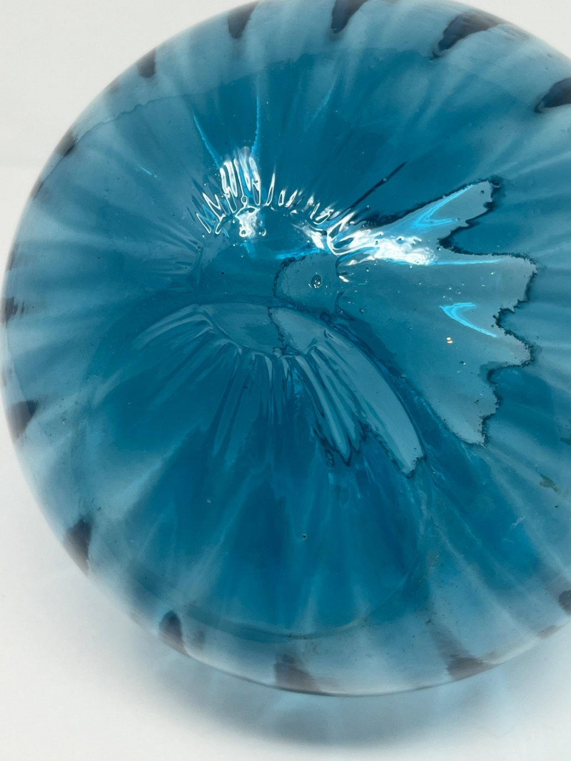 Summary: A striking handblown blue glass decanter or sculptural vase featuring a bulbous base, elongated neck, and matching rounded stopper. The glass exhibits dynamic swirling within the material, creating a sense of movement and depth. Likely Danish or Empoli-inspired, this piece blends mid-century modern form with rich color saturation. At 19" tall, it serves as a bold decorative accent or functional barware centerpiece. Maker: Unmarked; attributed to Danish or Empoli-style glassmakers Material: Handblown blue glass Color: Deep cobalt with internal swirl pattern Dimensions: 9" L × 9" W × 19" H Design Features: Rounded stopper with snug fit Swirled body with glossy finish Sculptural silhouette suitable for display or use Era: Mid-20th century (1950s–70s) Condition: Excellent vintage; no chips or cracks notedItem Details