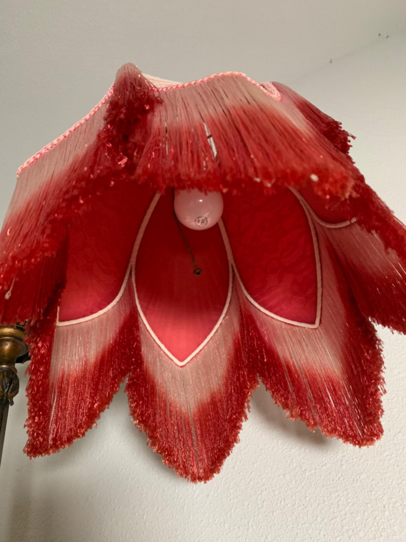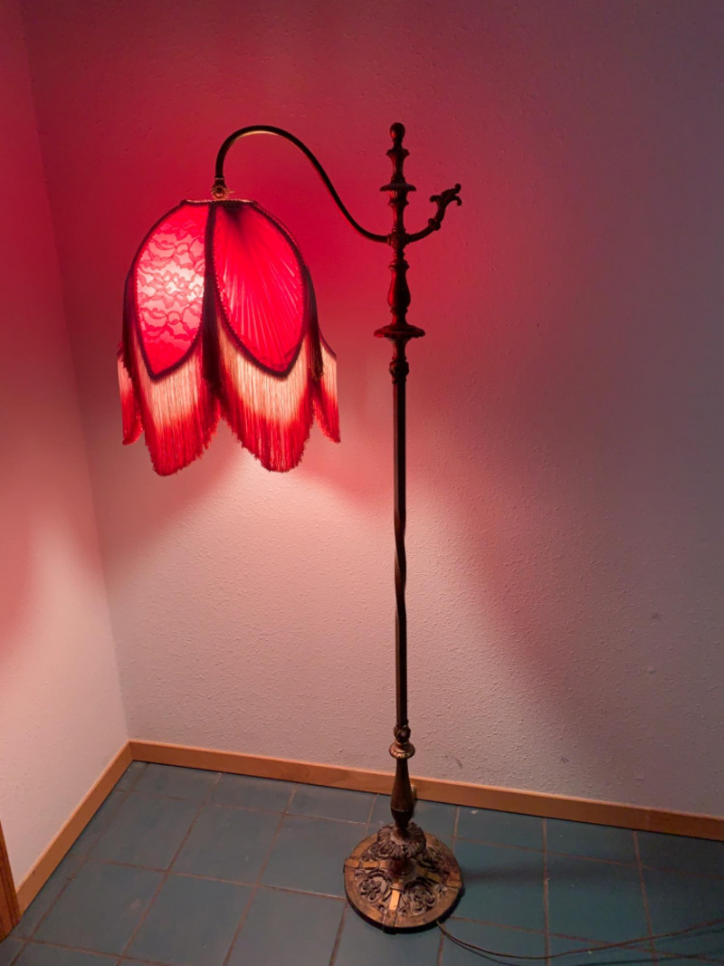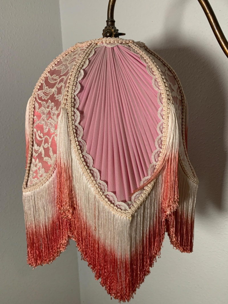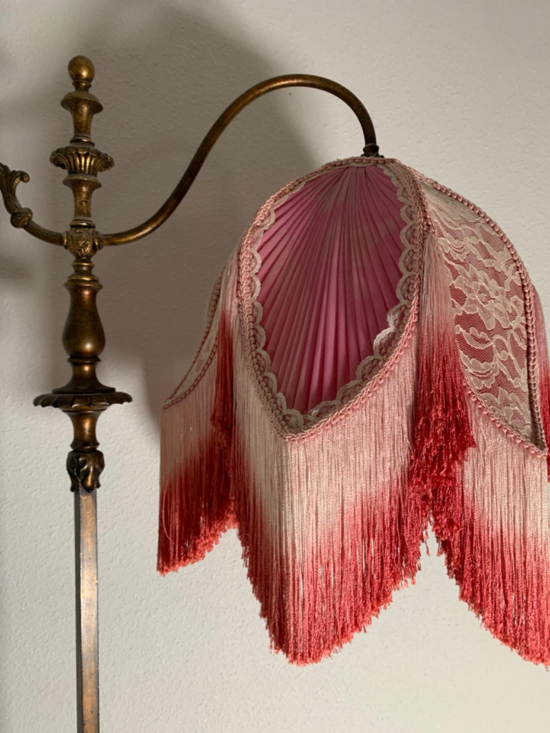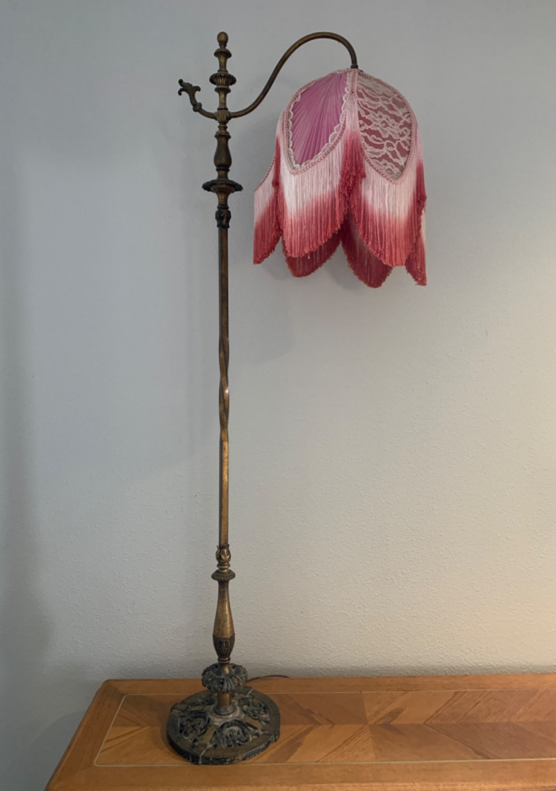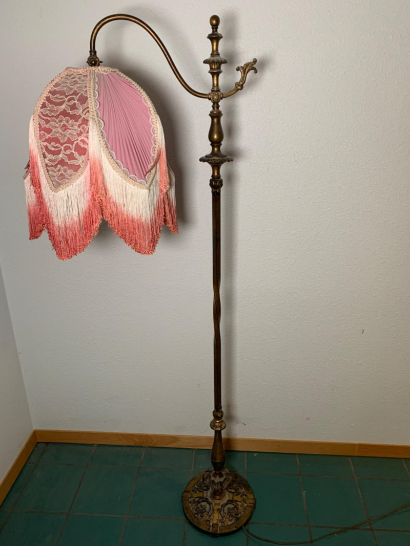 This listing is for a beautiful and ornate vintage bridge arm floor lamp. The lamp features a distinctive twisted metal column and an ornate, possibly cast iron, base. The curved "bridge" arm holds the lampshade away from the stand, a popular design feature of lamps from the 1920s to 1930s. Style: Art Noveau/Victorian with an elegant, classic design. Base: Ornate cast metal construction, possibly Hubley or similar manufacturer- no visible branding. Shade: The lampshade is a standout feature, with a bell shape, pink fabric, and a decorative lace overlay. The long, pink fringe adds to its romantic, vintage appeal. Functionality: The bridge arm design allows for adjustable lighting, making it an excellent piece for a reading nook or as an accent light. Condition: The lamp is in good vintage condition. There may be some age-appropriate wear to the metal finish and the lampshade. For a detailed assessment, please refer to the provided images which are part of the description. The lamp is in working order. This lamp would be a stunning addition to any vintage-inspired or eclectic décor, adding a touch of classic elegance and warmth to a living room, bedroom, or library.