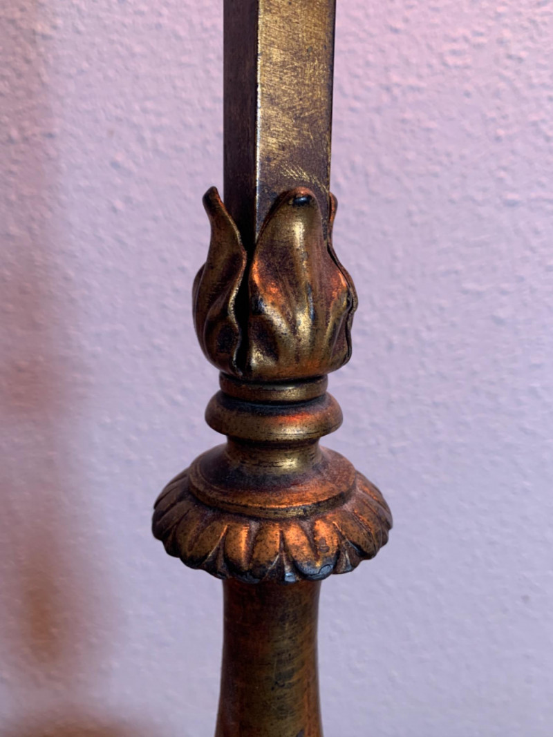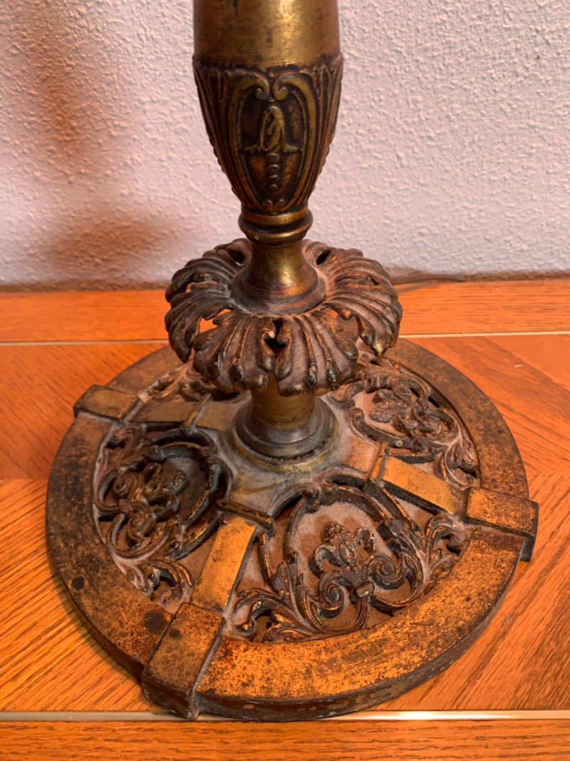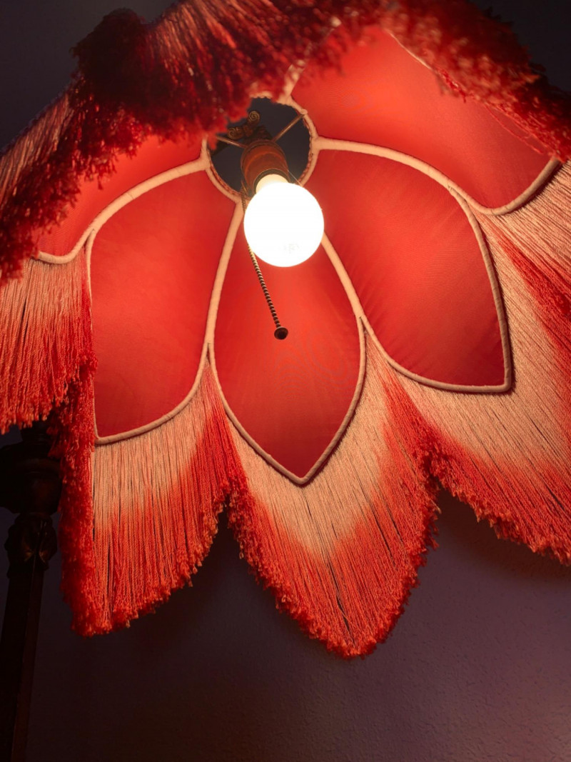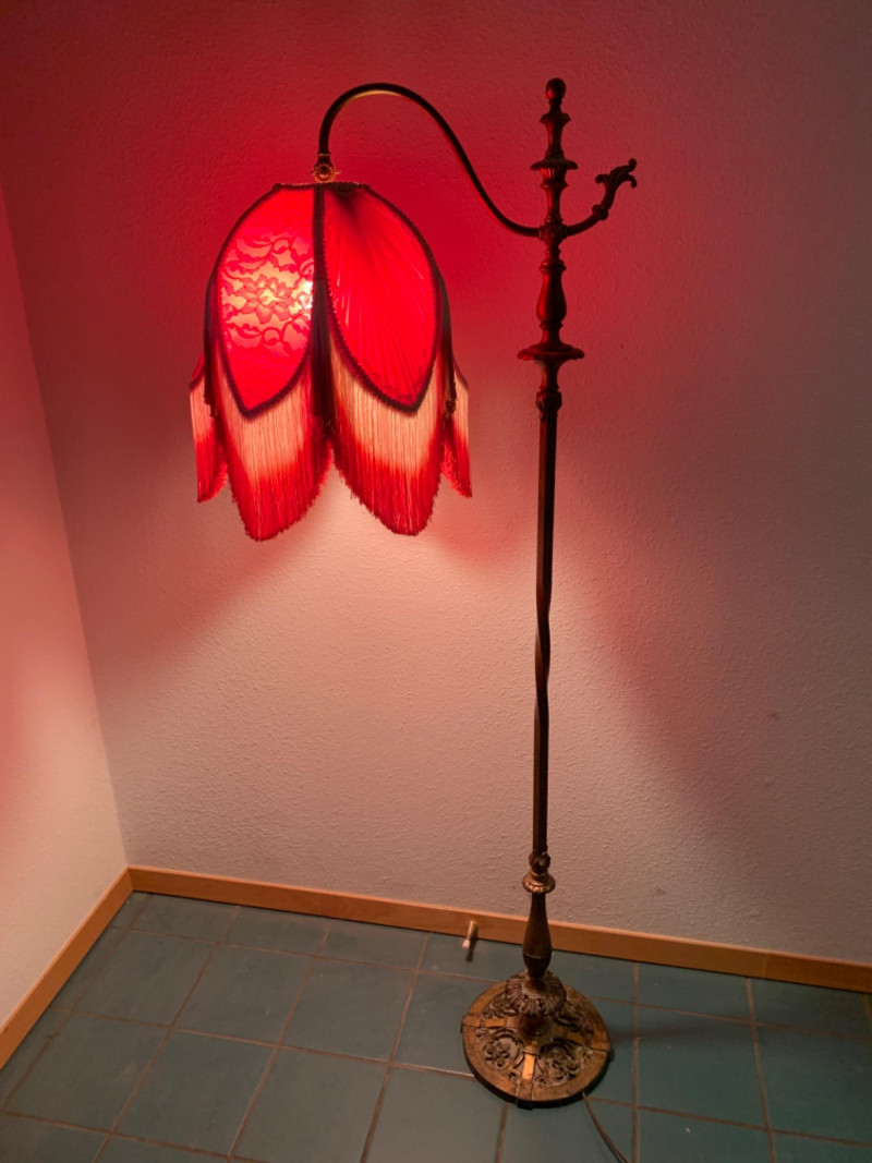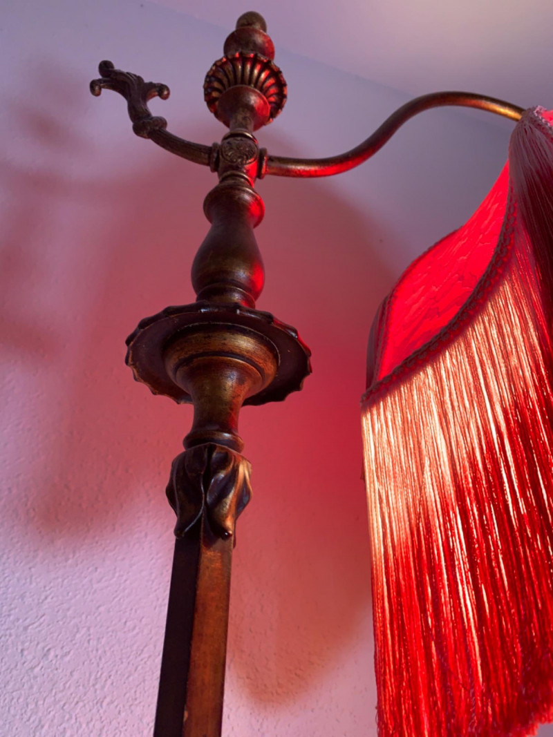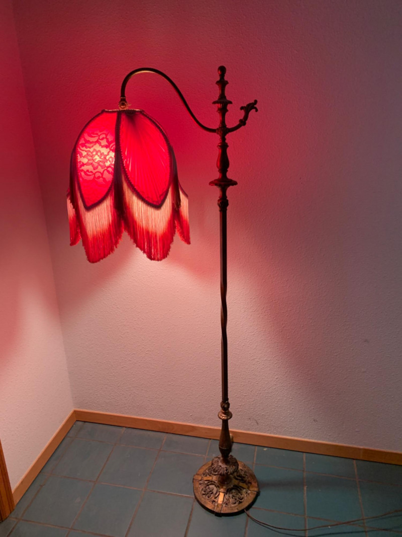 This listing is for a beautiful and ornate vintage bridge arm floor lamp. The lamp features a distinctive twisted metal column and an ornate, possibly cast iron, base. The curved "bridge" arm holds the lampshade away from the stand, a popular design feature of lamps from the 1920s to 1930s. Style: Art Noveau/Victorian with an elegant, classic design. Base: Ornate cast metal construction, possibly Hubley or similar manufacturer- no visible branding. Shade: The lampshade is a standout feature, with a bell shape, pink fabric, and a decorative lace overlay. The long, pink fringe adds to its romantic, vintage appeal. Functionality: The bridge arm design allows for adjustable lighting, making it an excellent piece for a reading nook or as an accent light. Condition: The lamp is in good vintage condition. There may be some age-appropriate wear to the metal finish and the lampshade. For a detailed assessment, please refer to the provided images which are part of the description. The lamp is in working order. This lamp would be a stunning addition to any vintage-inspired or eclectic décor, adding a touch of classic elegance and warmth to a living room, bedroom, or library.