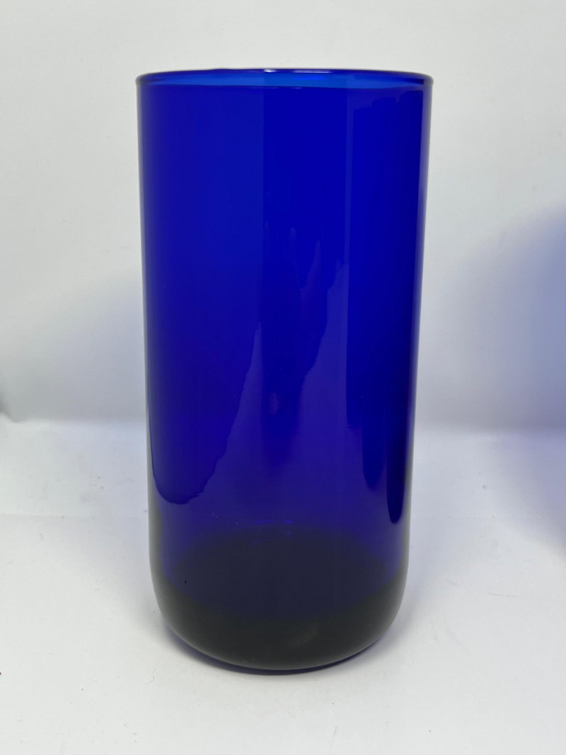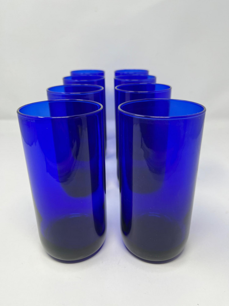 Summary: A sleek and vibrant set of eight vintage cobalt blue glass tumblers, likely produced by Libbey Glass in the mid-20th century. Each glass features a smooth cylindrical form with a slight flare and rounded base, measuring approximately 5.75" tall and holding 16 oz. The rich blue hue adds a bold pop of color to any table or bar setup. Perfect for water, iced tea, or cocktails, these tumblers blend everyday function with collectible charm. Maker: Likely Libbey Glass (USA) Material: Pressed glass Color: Cobalt blue Dimensions: Height: 5.75" Diameter: 3" Capacity: Approx. 16 oz Design Features: Smooth cylindrical shape Slight flare at rim Rounded base Era: 1960s–1980s Condition: Excellent vintage; no chips or cracks notedItem Details