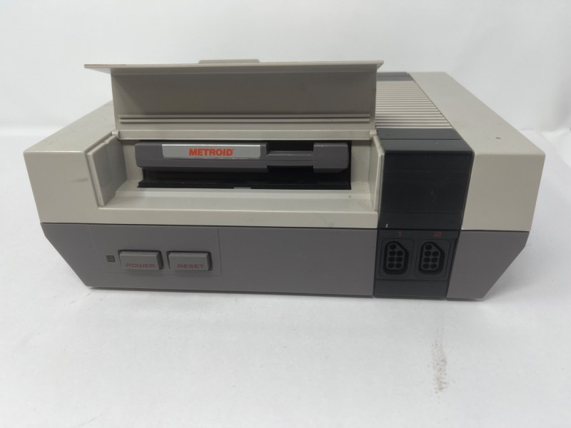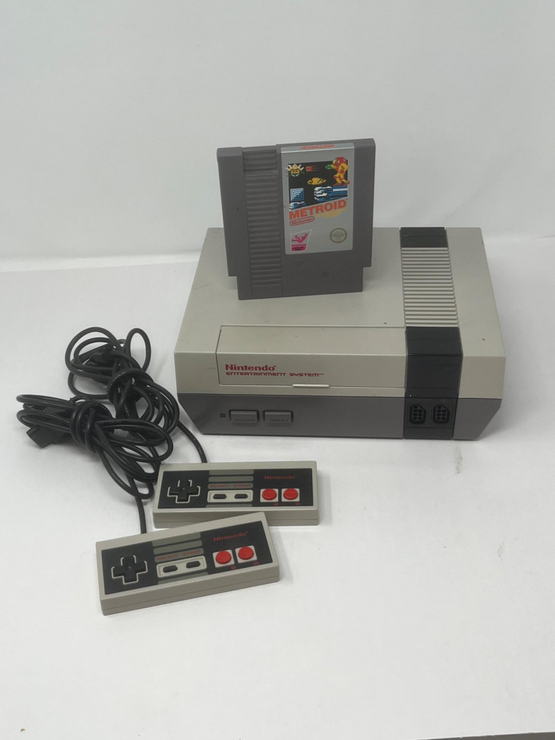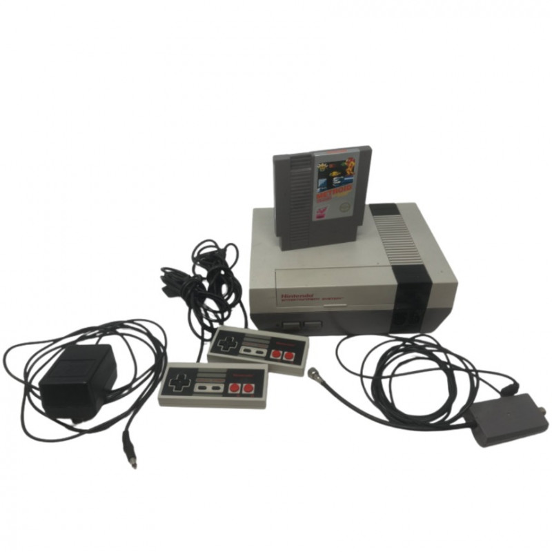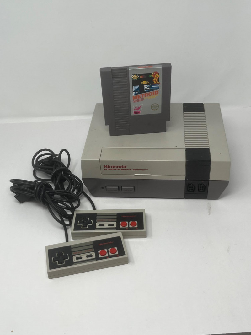 Summary: A complete and tested Nintendo Entertainment System (Model NES-001) bundle featuring the original console, two classic rectangular controllers, and the iconic Metroid game cartridge. Includes power adapter and RF switch for TV connection. All components show light cosmetic wear consistent with age but are fully functional. A nostalgic and playable set from the golden age of 8-bit gaming—ideal for collectors or retro enthusiasts. Console: Model: NES-001 Year: 1985 Condition: Used, tested, good cosmetic shape Controllers: Quantity: 2 original NES controllers Functionality: Fully tested Game Cartridge: Title: Metroid Label: Clean and intact Functionality: Tested and loads correctly Cables Included: Power adapter RF switch for TV hookup Packaging: Loose; no original box Condition Notes: Cleaned; minor wear typical of vintage electronicsItem Details