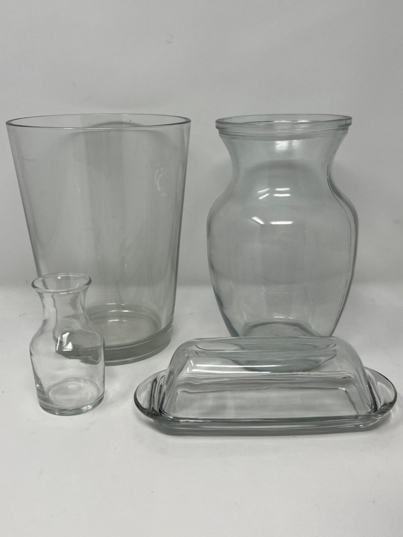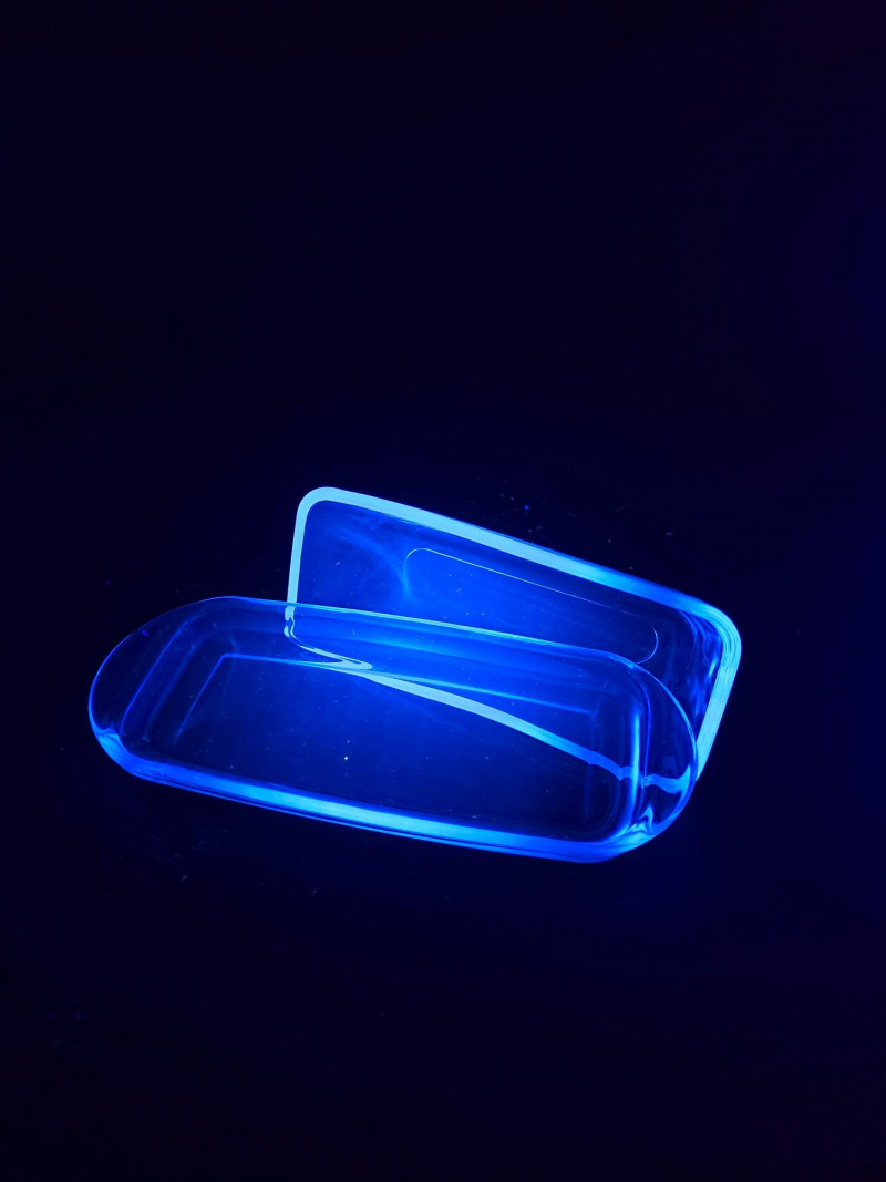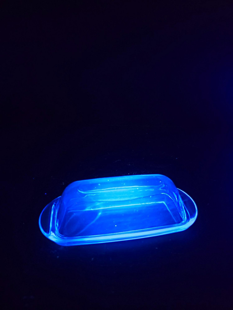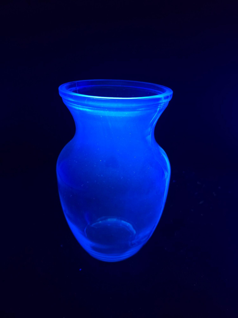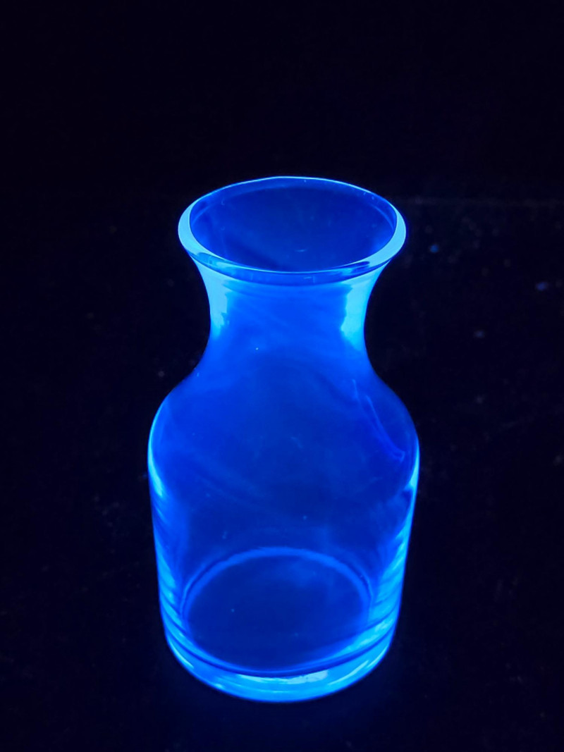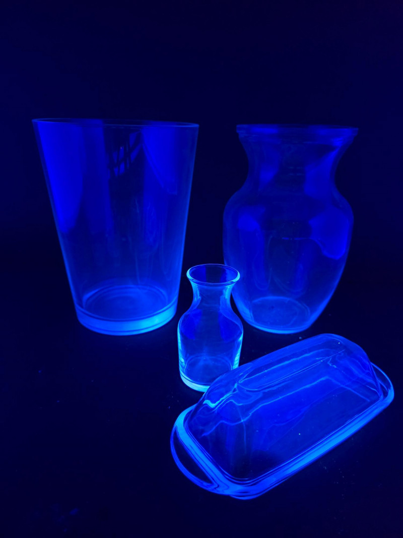 Summary: A visually striking 4-piece collection of electric blue glassware, each piece exhibiting vivid fluorescence under UV light. Includes a cylindrical tumbler, narrow-neck vase, miniature carafe, and covered butter dish. Likely mid-century pressed or molded glass, possibly incorporating manganese or trace uranium for glow effect. A captivating set for collectors of novelty glass, barware, or blacklight display. Material: Pressed or molded glass with UV-reactive compounds Color: Clear glass- Electric blue (fluoresces under blacklight) Set Includes: 1 cylindrical tumbler 1 narrow-neck vase 1 miniature carafe 1 covered butter dish with lid Dimensions: Vary by piece; approx. 3"–6" tall Design Features: Smooth and faceted contours Uniform manganese glow under UV light Likely mid-century novelty or barware glass Era: 1950s–1970s Condition: Excellent vintage; no chips or cracks noted Item Details