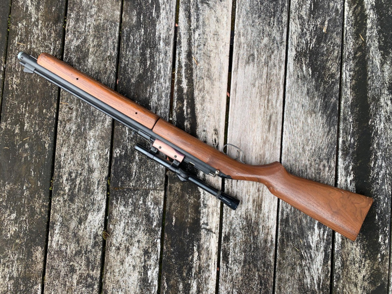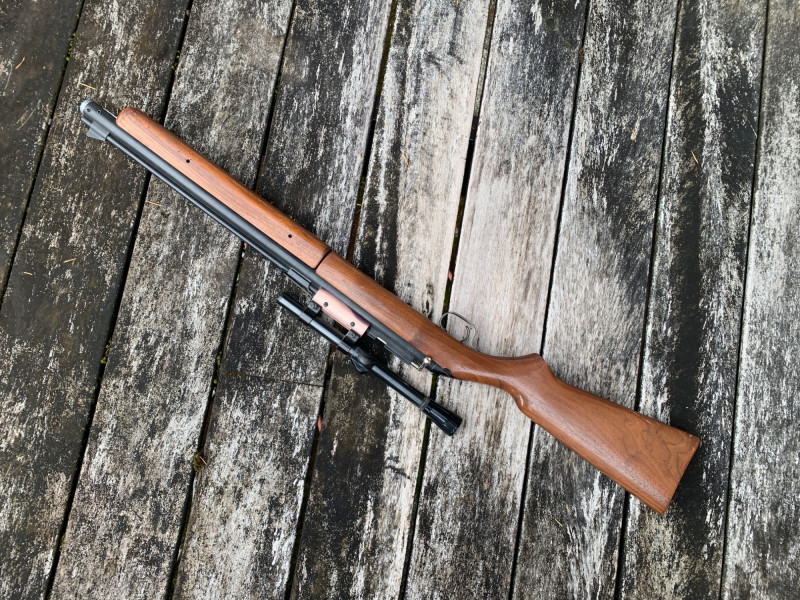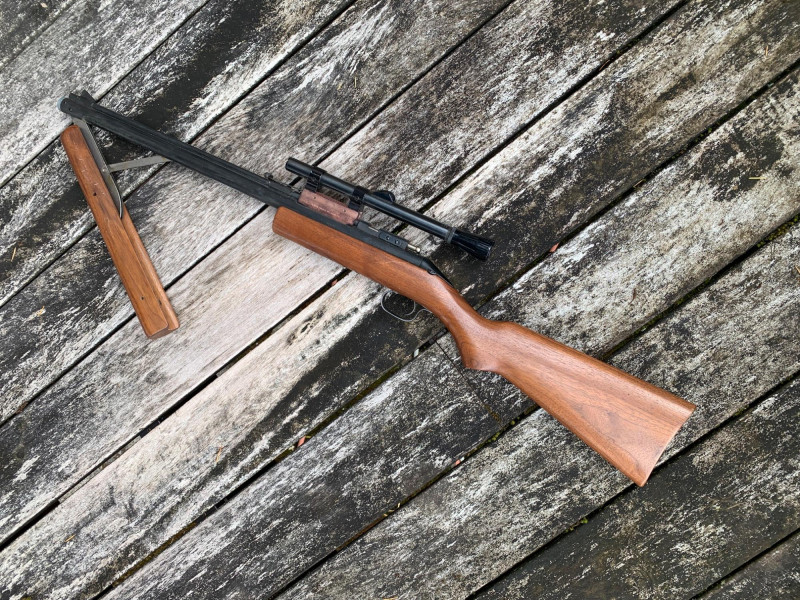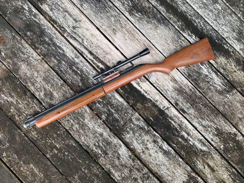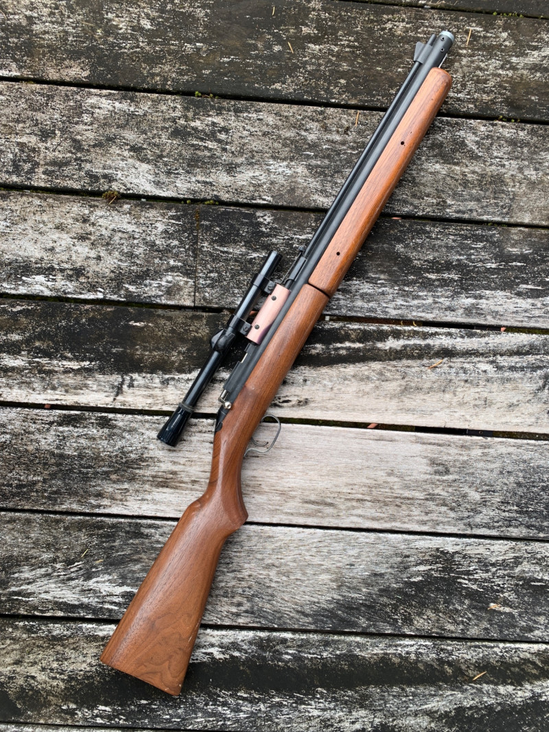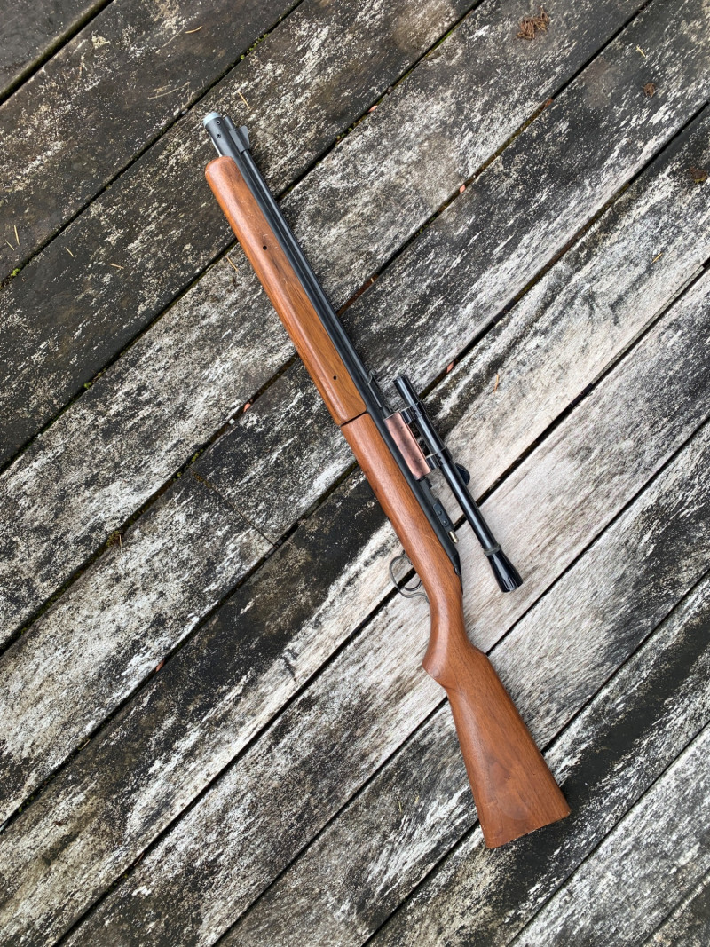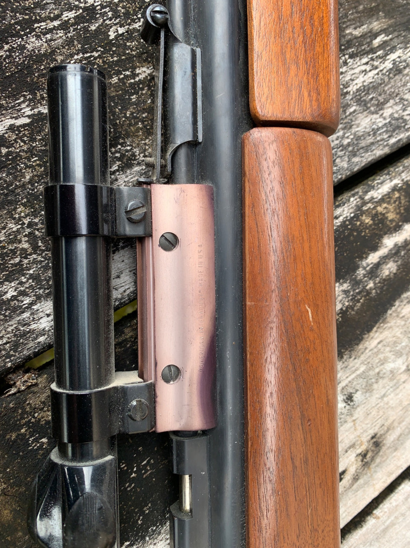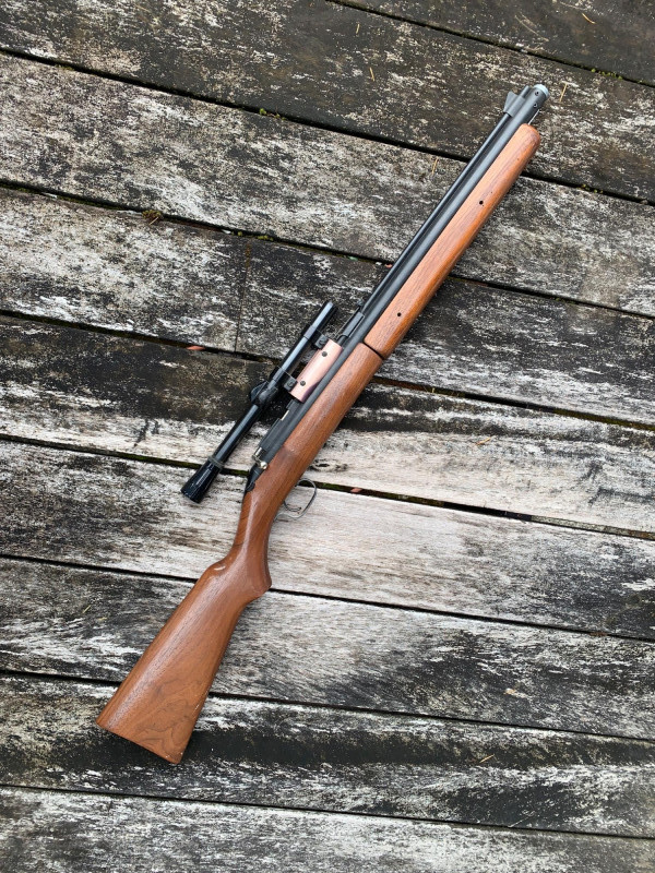 Sheridan Blue Streak 5mm (.20 Cal) Air Rifle – 37" Length, Rocker Safety, Mounted Scope Summary: A classic Sheridan Blue Streak air rifle chambered in 5mm (.20 caliber), featuring a smooth hardwood stock, rocker safety, and mounted scope. This pump-action pellet rifle was manufactured by Sheridan Products Inc. in Racine, Wisconsin, and is prized for its accuracy, durability, and American craftsmanship. With its 37" length and vintage patina, this piece is ideal for collectors of mid-century air guns or functional target shooters. Maker: Sheridan Products Inc. (USA) Model: Blue Streak Caliber: 5mm (.20 cal) Action: Single-shot, multi-pump pneumatic Safety: Rocker-style safety near trigger Stock: Hardwood, smooth finish Scope: Mounted (likely 4x15 Crosman or similar) Length: Approx. 37" overall Era: Circa 1960s–1980s Condition: Good vintage; wear consistent with age, untested but appears completeItem Details
