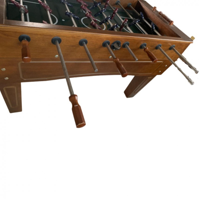 The table is fully functional and in good condition. There are signs of cosmetic wear consistent with normal use, which may include minor scratches or scuffs, but these do not affect gameplay. Two blue team players have missing caps.