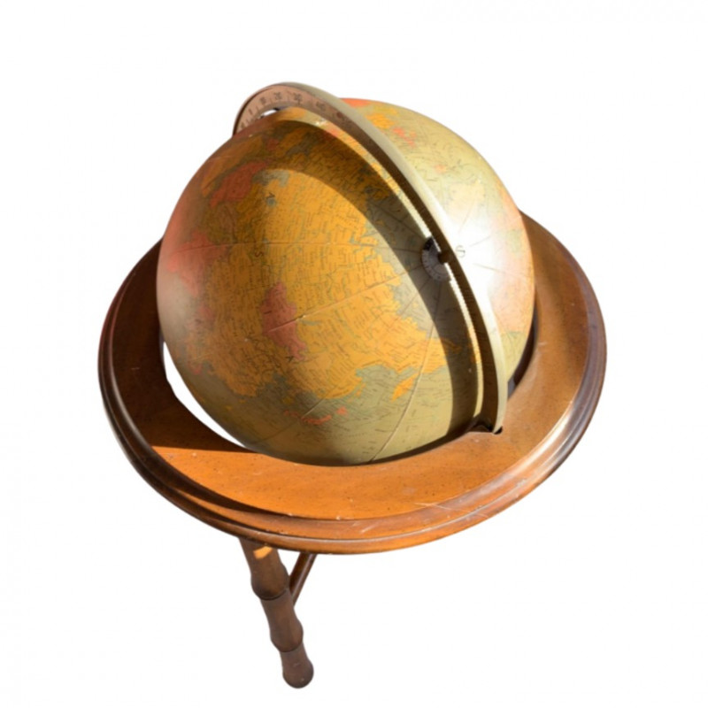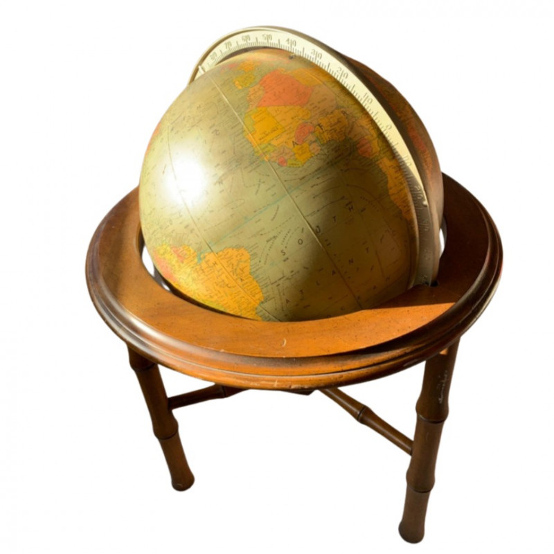 A handsome vintage Replogle World Classic Series globe featuring a 12" diameter sphere mounted on a circular faux bamboo wood stand. The globe rotates smoothly on its axis and displays raised relief topography with parchment-style oceans and classic cartographic typography. The stand’s bamboo-style legs and circular frame evoke mid-century tropical design, making this piece both educational and decorative. A timeless accent for libraries, offices, or collector displays. Maker: Replogle Globes Inc. (USA) Model: World Classic Series Globe Diameter: 12" Stand Material: Faux bamboo wood Total Dimensions: Approx. 24" H × 16" W Design Features: Raised relief topography Rotating globe axis Parchment-toned oceans with political boundaries Decorative faux bamboo legs and circular frame Era: Likely 1970s–1980s Condition: Excellent vintage; light wear consistent with age