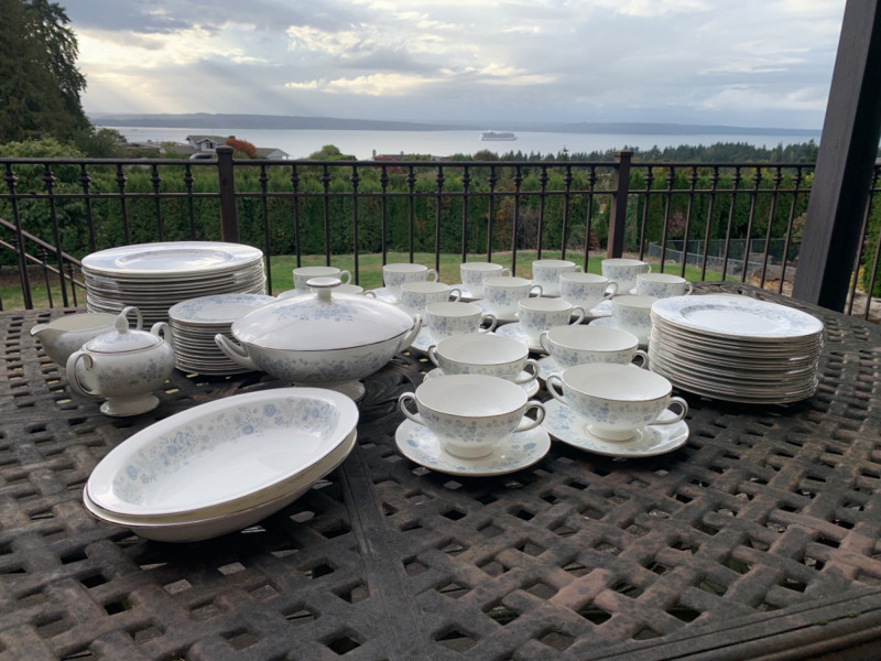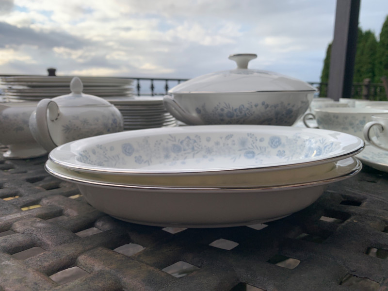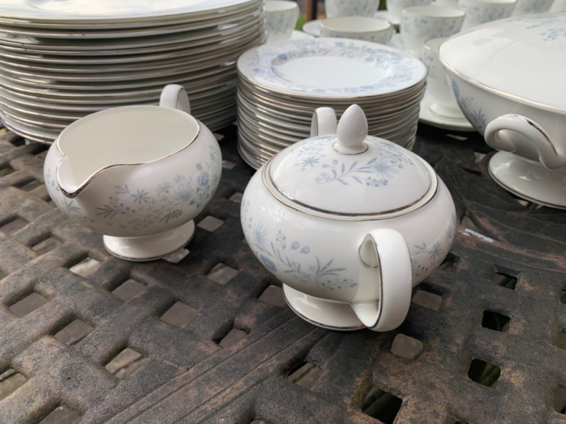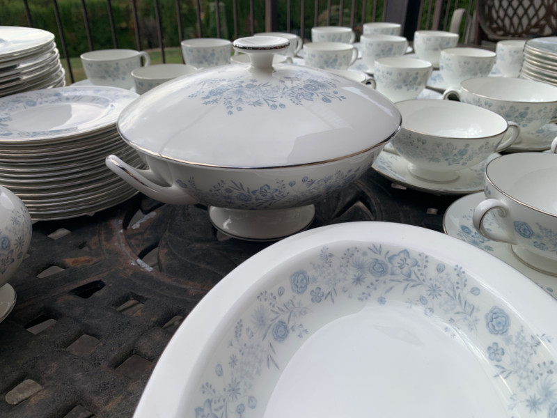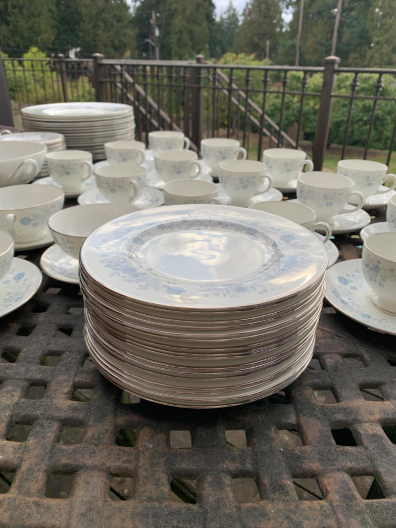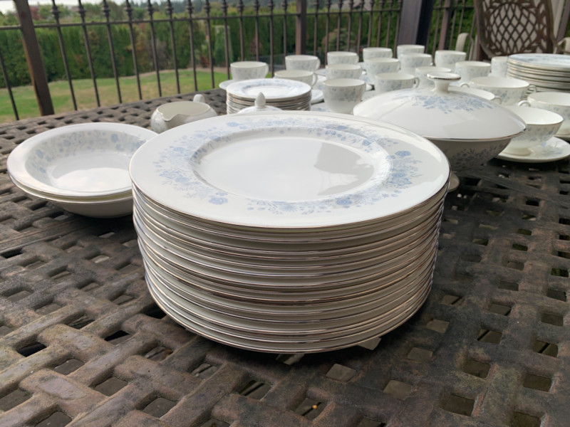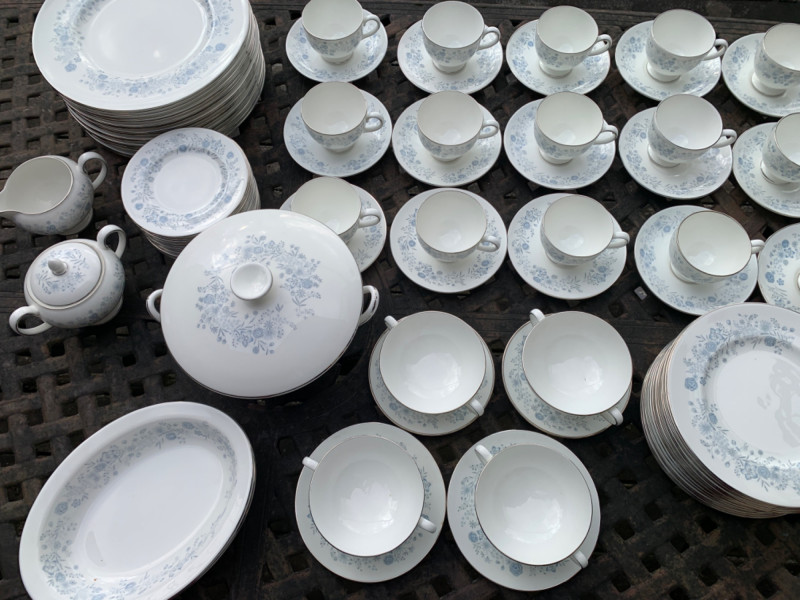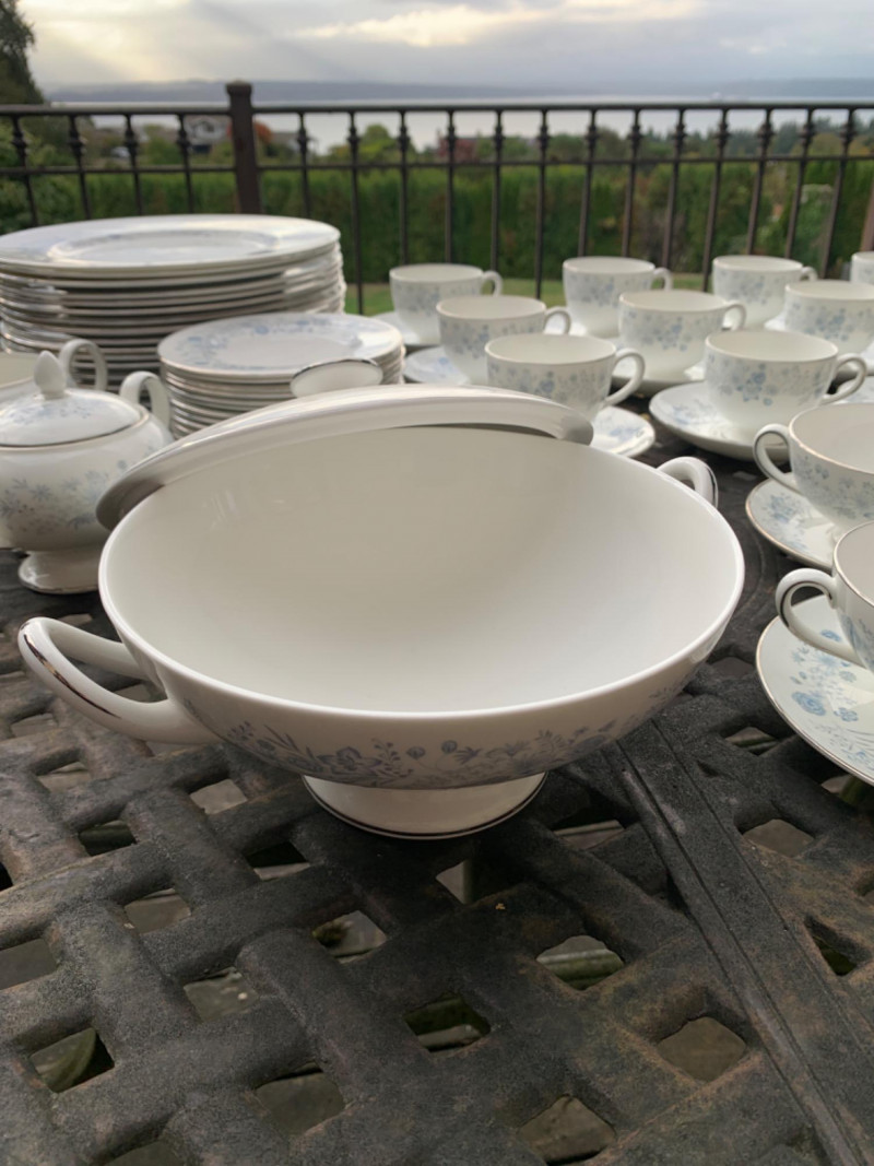 This is a beautiful and extensive vintage dinnerware set in the popular Belle Fleurpattern by Wedgwood, a renowned English brand. The pattern, produced from 1961 to 1991, features delicate blue and gray floral sprays on a pristine white bone china body, all finished with an elegant platinum trim. This discontinued pattern is a timeless classic that would make a wonderful addition to any collection or for special occasions. The set includes a large number of pieces, suitable for a dinner party or formal gathering. The pieces are in excellent vintage condition with minimal signs of wear. Condition: Excellent vintage condition. No chips, cracks, or crazing. The platinum trim is largely intact with minimal wear. Please see photos for a complete and accurate representation of the set. Brand: Wedgwood Pattern: Belle Fleur Material: Fine Bone China with Platinum Trim Production Era: 1961-1991Country of Origin: England Care: Hand wash recommended to preserve the platinum trim. This is a fantastic opportunity to own a complete set of this desirable vintage dinnerware.