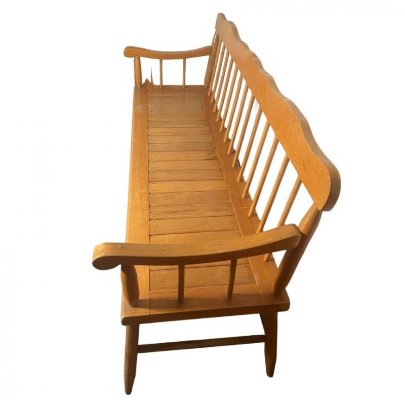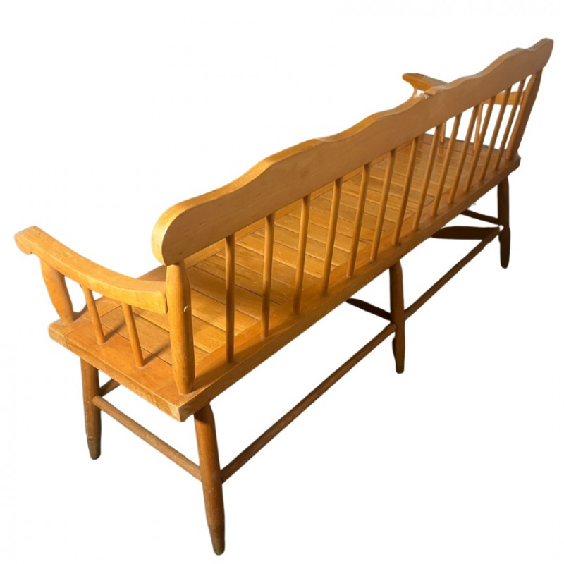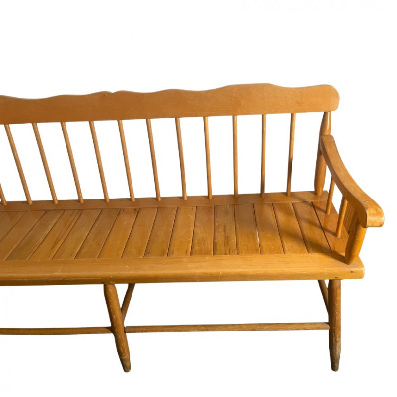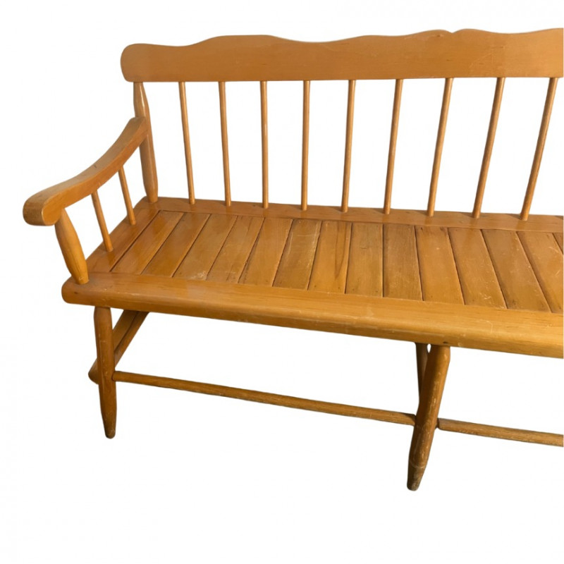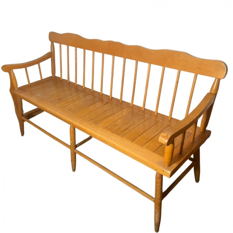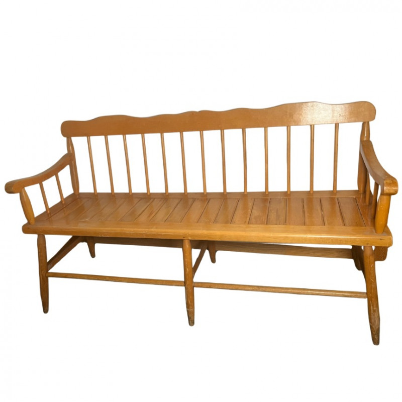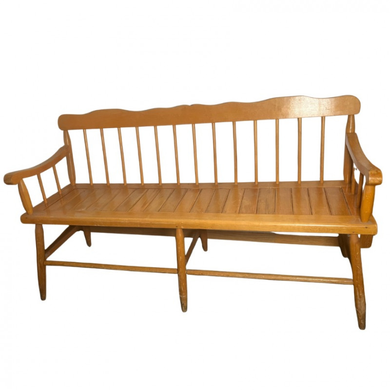 This charming and classic Deacon's bench is perfect for adding a touch of traditional style to any home. The bench features a slatted, spindle-back design and gracefully curved arms, reminiscent of early American furniture styles. Its light-toned wood finish and clean lines make it a versatile piece that would complement a farmhouse, country, or rustic decor aesthetic.The solid wood construction ensures durability, and the bench provides a substantial amount of seating, making it an excellent addition to an entryway, hallway, mudroom, or at the foot of a bed. While it shows some wear consistent with its age, it is in good overall condition and is ready for use. Style: Spindle-back, Deacon's bench Material: Solid wood Finish: Natural light wood tone Condition: Used, with signs of age and wear. Construction is solid. Please Note: The bench is sold as-is.