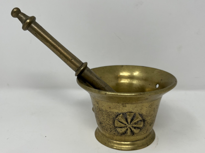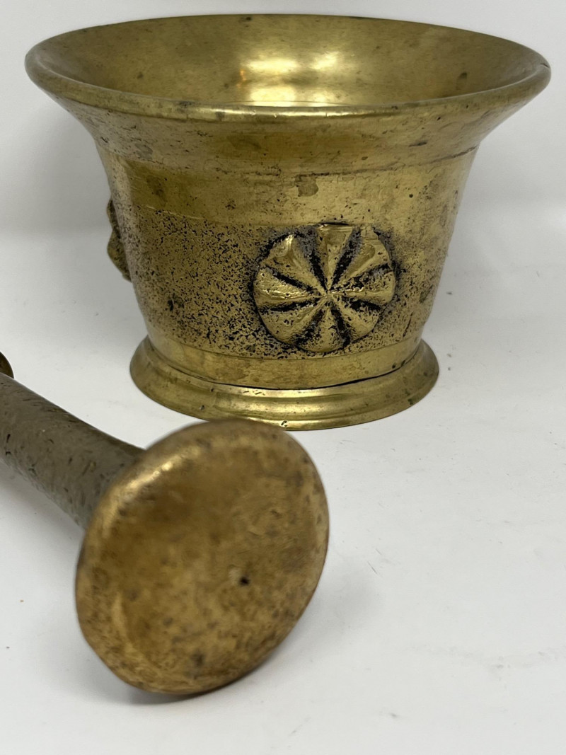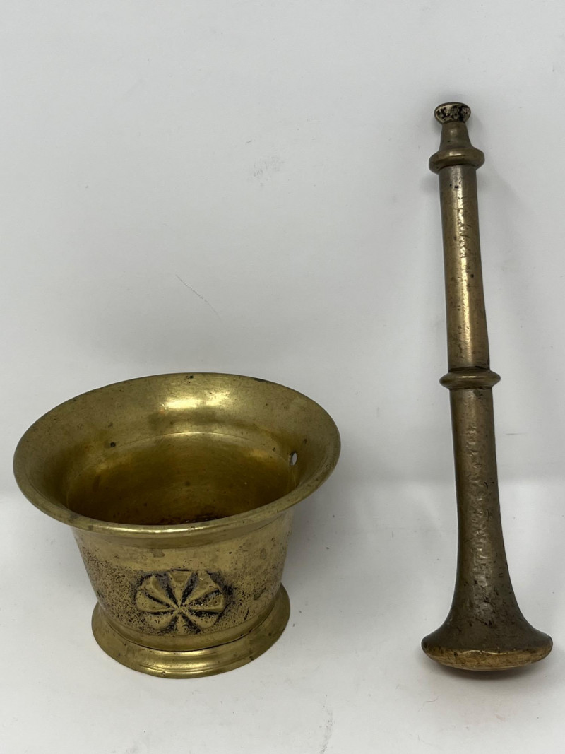 Lot # 178 - Antique Solid Brass Mortar and Pestle Apothecary Set
