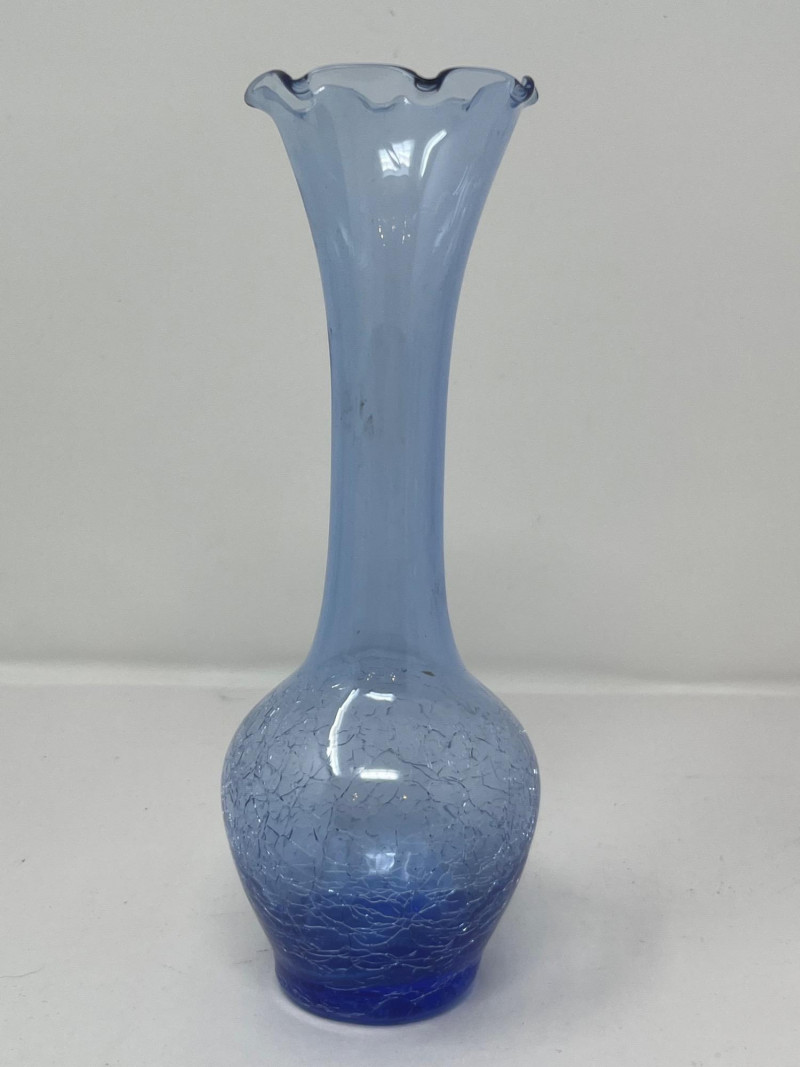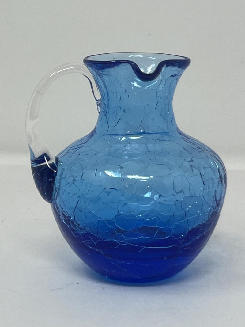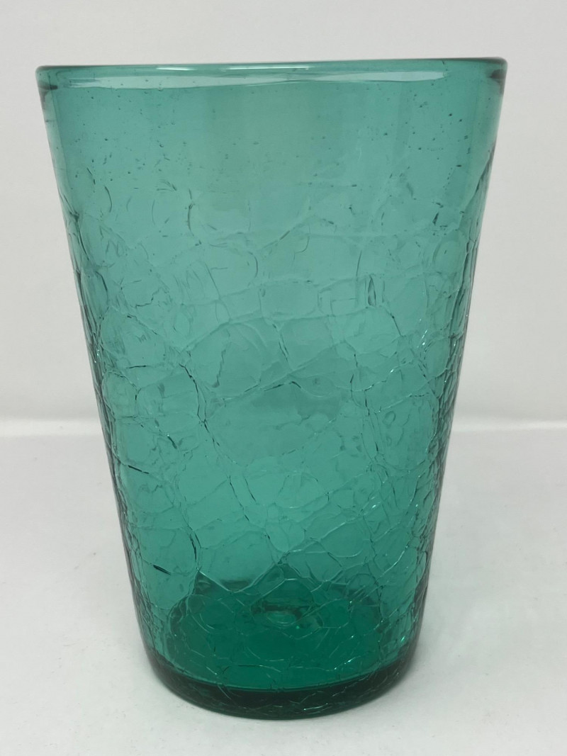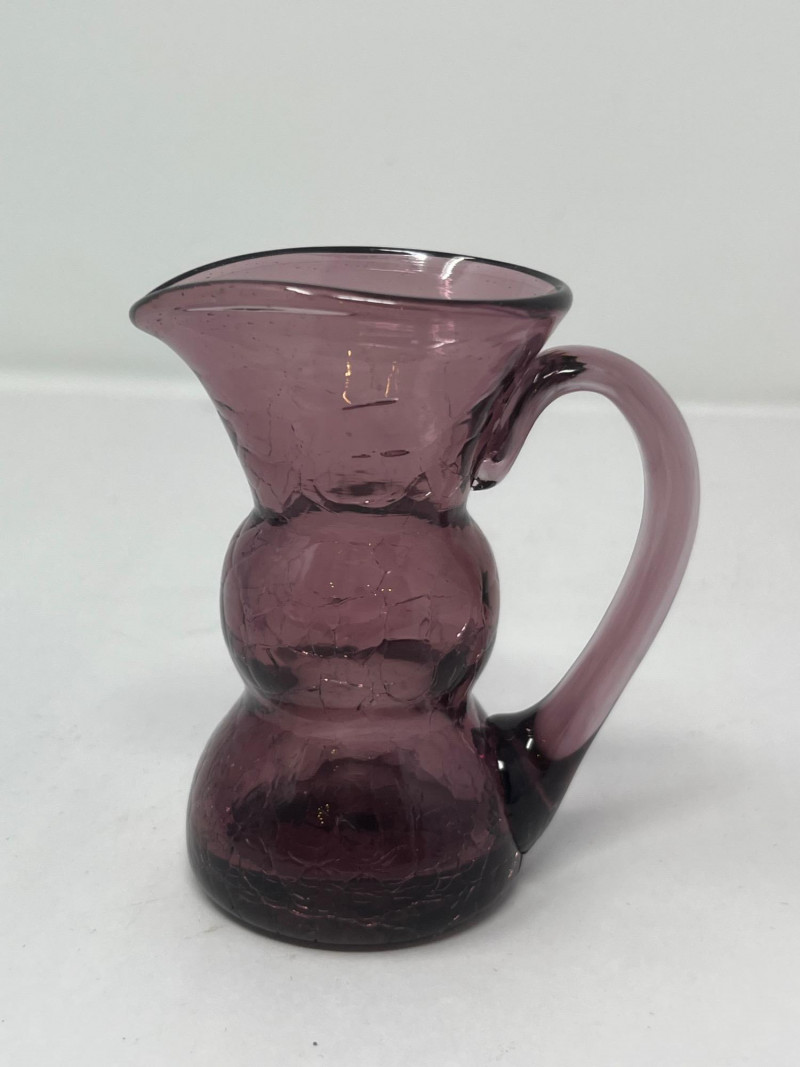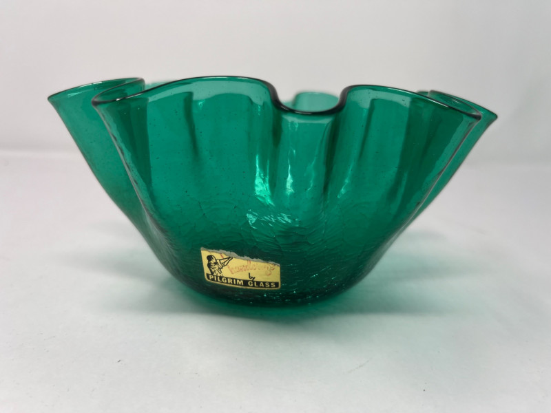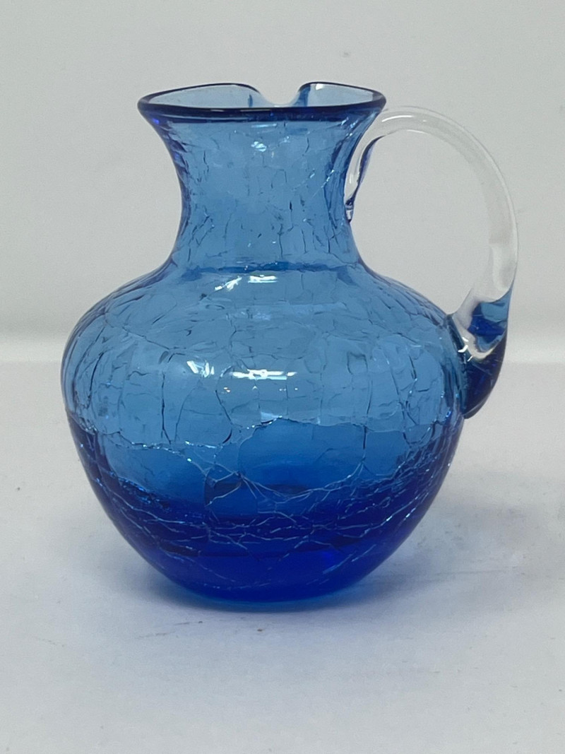 This is a stunning vintage collection of five pieces of hand-blown crackle glass, perfect for collectors of mid-century modern glassware. The lot features a variety of shapes and colors, including two vases, two pitchers, and a ruffled bowl, all showcasing the distinctive crackle texture. Tall Ruffled Blue Vase: A beautiful, elegant vase with a flared, ruffled rim. The crackle texture is prominent throughout the piece, giving it a unique visual depth. Small Deep Blue Pitcher: A charming hand-blown pitcher with a handle and spout. Its rich blue color and crackle finish make it a standout piece. Green Pilgrim Glass "Fazzoletto-Style" Bowl: A ruffled "handkerchief" style bowl in a vibrant green color. This popular mid-century design is a beautiful display piece. This piece retains its original Pilgrim Glass sticker, confirming its authenticity and heritage. Amethyst Pitcher: A small, curvaceous pitcher in a lovely amethyst or purple hue. Large Cylindrical Green Vase: A tall, striking vase in a brilliant green. The large size and all-over crackle pattern make it an impressive focal point. Condition: All pieces are in excellent vintage condition with no chips or cracks. The glass shows normal signs of age and handcrafted production, such as pontil marks on the bases. The Pilgrim Glass sticker on the green bowl is visible. This is a wonderful opportunity to acquire a ready-made collection of beautiful, classic crackle glass from a bygone era. These pieces are ideal for display, and their vibrant colors will complement any décor.