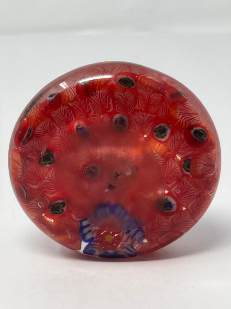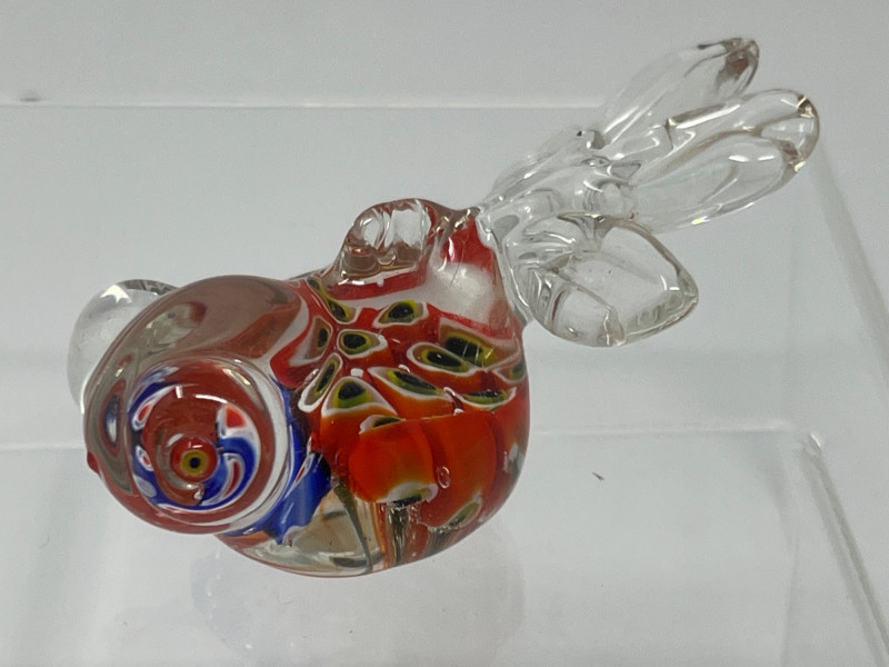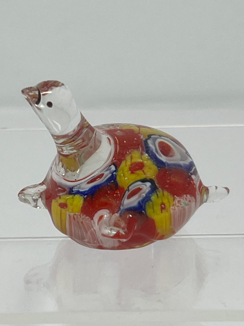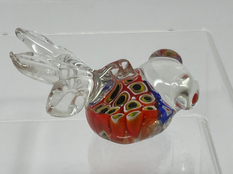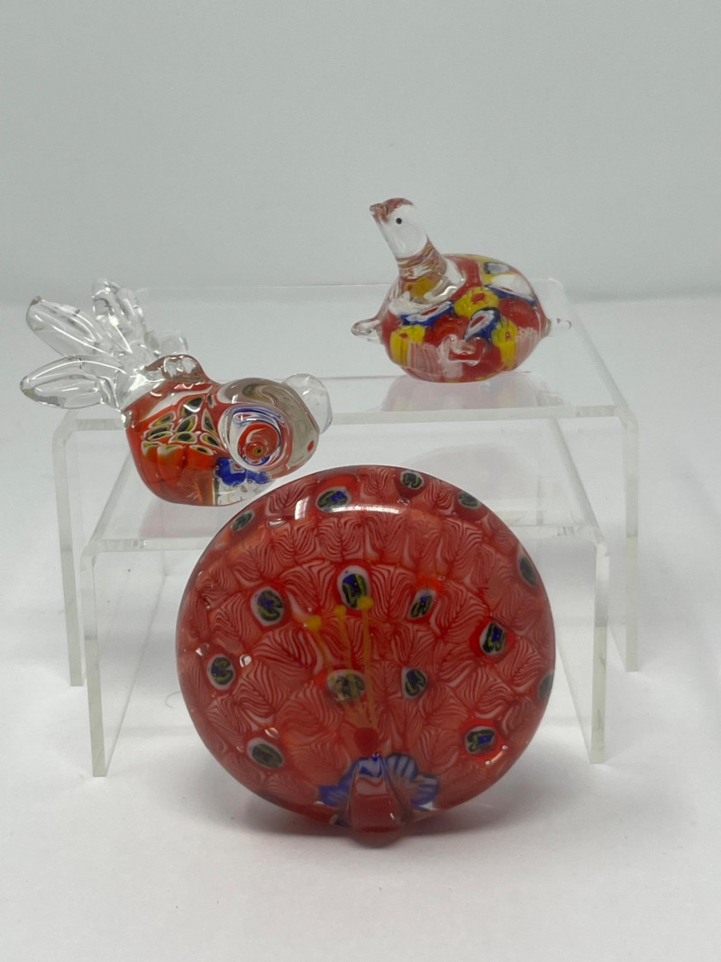 This auction lot features a beautiful collection of vintage art glass, crafted in the Murano millefiori style. The three pieces are hand-blown and showcase the "a thousand flowers" technique, where colorful glass canes are fused to create intricate mosaic-like patterns. This technique is a hallmark of traditional Venetian glassmaking. Peacock Paperweight: A striking red peacock paperweight that can be displayed either flat or upright. Its body is composed of detailed, colorful millefiori patterns, with a vibrant red base. Fish Figurine: A charming, hand-blown glass fish with a clear body and a mosaic of colorful millefiori canes. Turtle Figurine: A small, whimsical turtle figurine, also featuring the classic millefiori design, with a clear glass head and fins and a colorful shell. The items are in good vintage condition. Please refer to the high-resolution photos for a detailed view of the items. As these are hand-blown pieces, minor variations in color and form are part of their unique character.