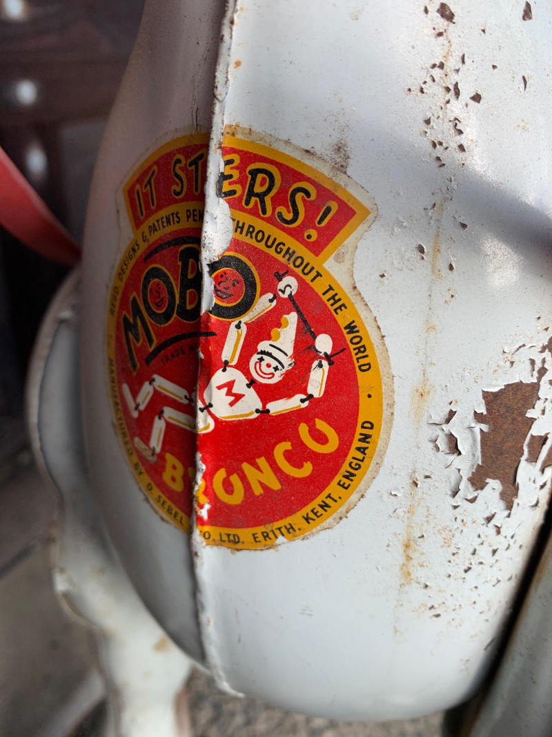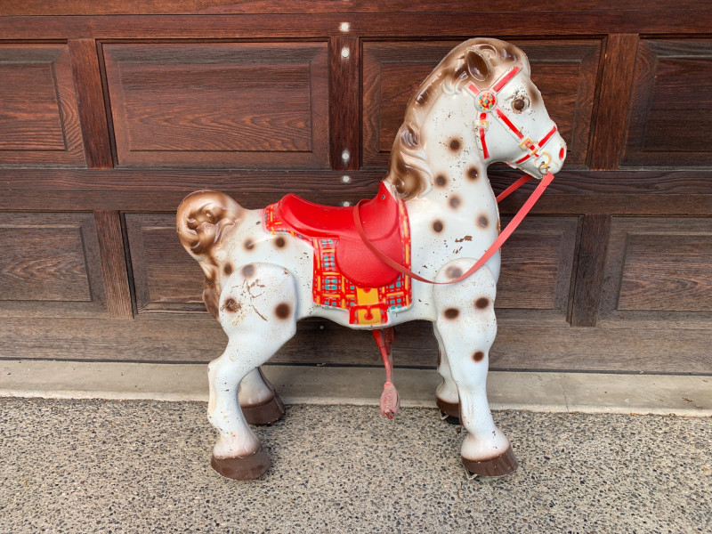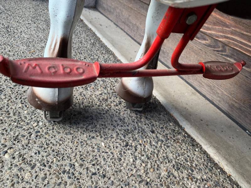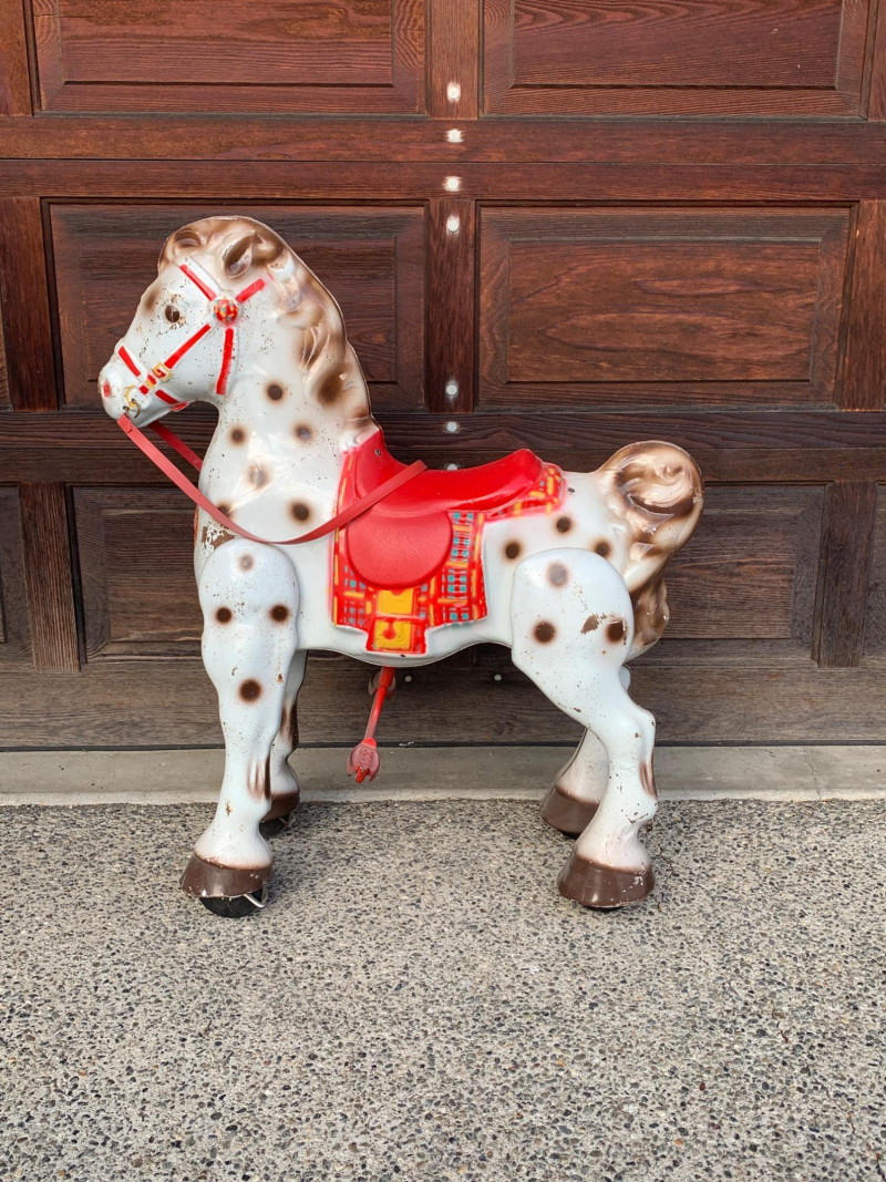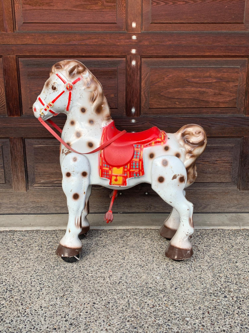 A classic Mobo Bronco ride-on toy horse manufactured by D. Sebel & Co. in Kent, England. Made of pressed steel and painted in white with brown spots, this self-propelled horse features a red saddle with yellow plaid detailing, red bridle, and functional foot pedals that drive hidden wheels. Introduced in the 1940s and updated in 1950 with “magic steering,” this model remains a favorite among vintage toy collectors for its mechanical ingenuity and nostalgic charm. Maker: D. Sebel & Co. Ltd. (England) Model: Mobo Bronco Material: Pressed steel with painted finish Color Scheme: White with brown spots, red saddle and bridle, yellow plaid accents Dimensions: Length: 28" Width: 13" Height: 31" Features: Foot pedal propulsion system “Magic steering” mechanism (introduced in 1950) Painted saddle and bridle details Mounted on wheels for forward motion Era: 1940s–1970s