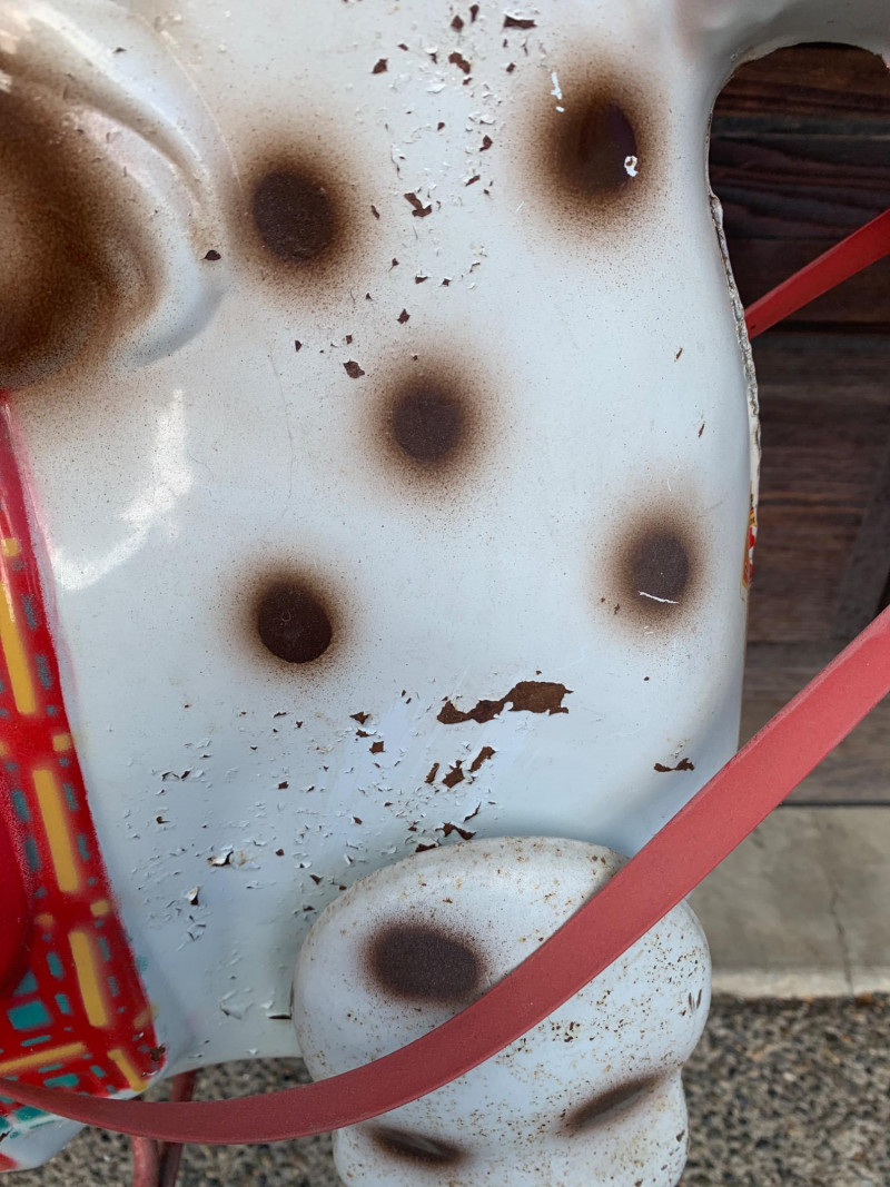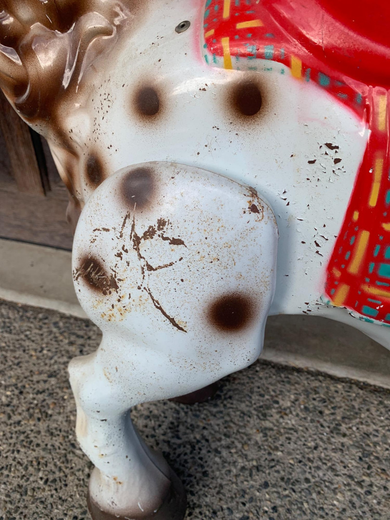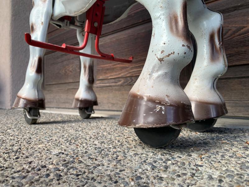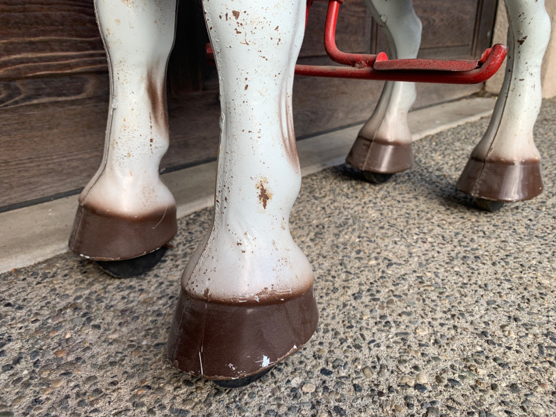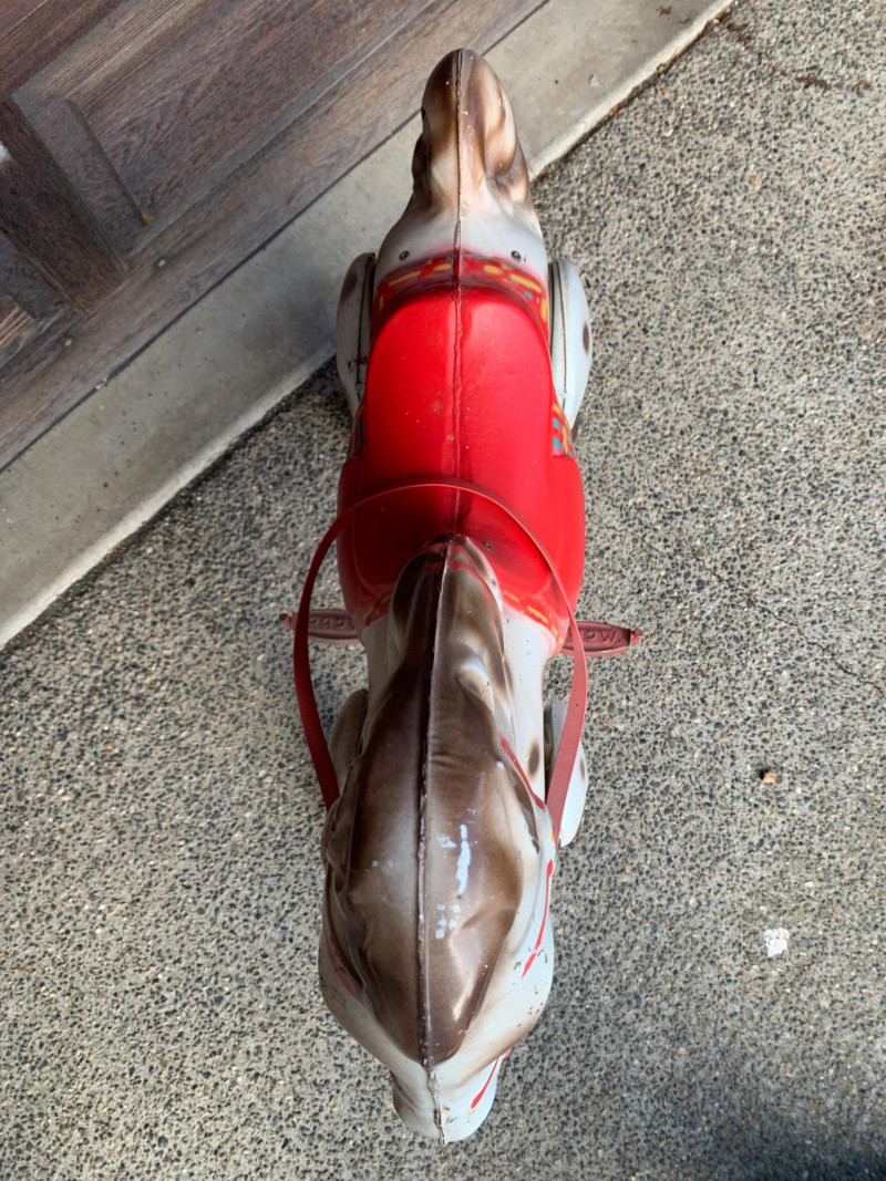 A classic Mobo Bronco ride-on toy horse manufactured by D. Sebel & Co. in Kent, England. Made of pressed steel and painted in white with brown spots, this self-propelled horse features a red saddle with yellow plaid detailing, red bridle, and functional foot pedals that drive hidden wheels. Introduced in the 1940s and updated in 1950 with “magic steering,” this model remains a favorite among vintage toy collectors for its mechanical ingenuity and nostalgic charm. Maker: D. Sebel & Co. Ltd. (England) Model: Mobo Bronco Material: Pressed steel with painted finish Color Scheme: White with brown spots, red saddle and bridle, yellow plaid accents Dimensions: Length: 28" Width: 13" Height: 31" Features: Foot pedal propulsion system “Magic steering” mechanism (introduced in 1950) Painted saddle and bridle details Mounted on wheels for forward motion Era: 1940s–1970s