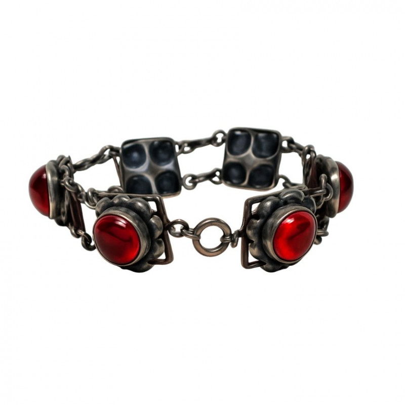 Vintage-style bracelet stamped 925. Features alternating square and round links set with red glass cabochons. Measures 7.5" long. Length: 7.5" Material: Sterling silver (stamped 925) Gemstones: Red glass cabochons Design: Alternating square and round links