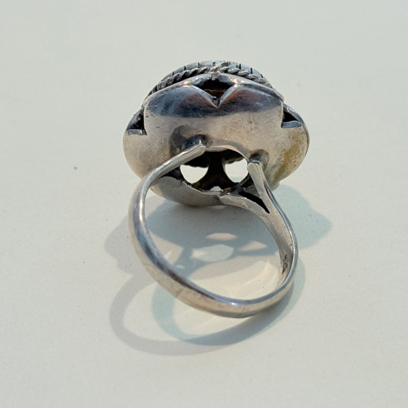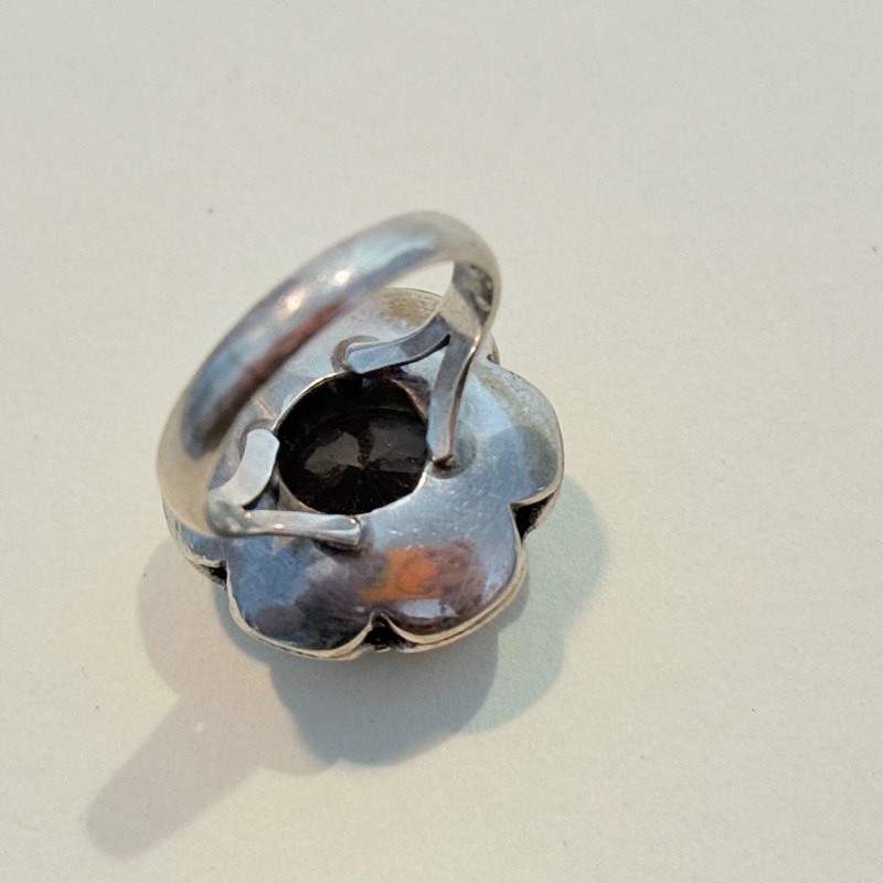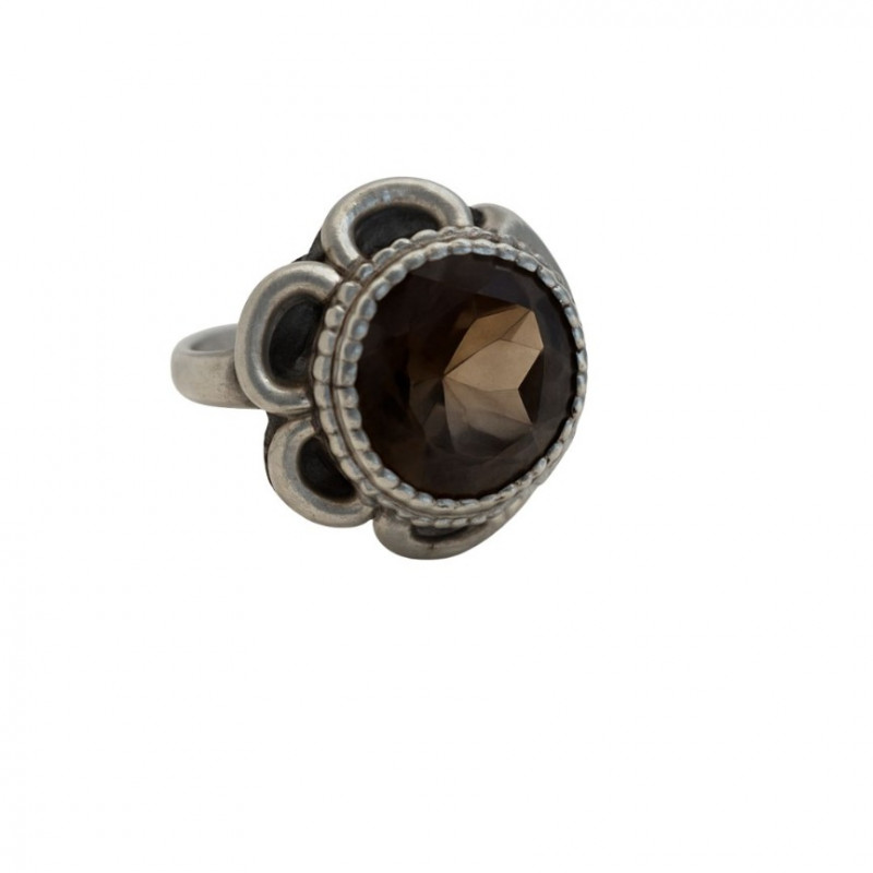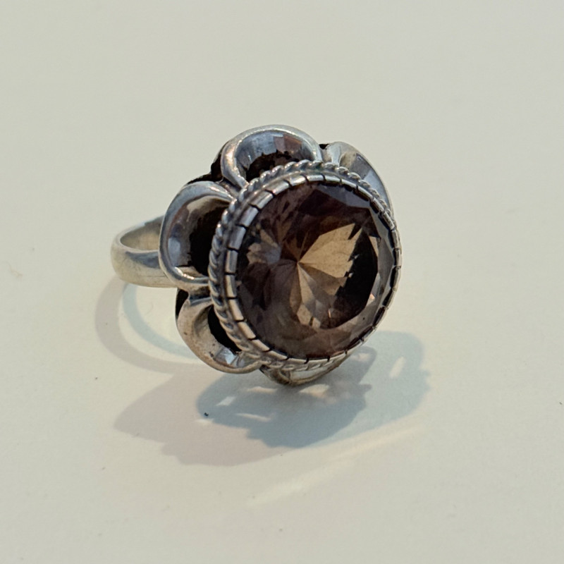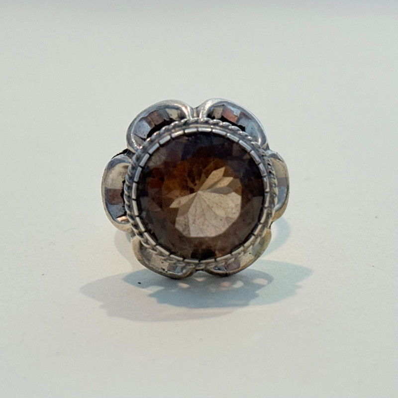 Bold sterling silver ring featuring a large round-cut smoky quartz in a scalloped bezel setting. The stone displays rich brown-gray tones with translucent depth. Size 8. Weighs 9.5 grams. Face of ring measures 1" wide. Size: 8 Weight: 9.5 grams Material: Sterling silver Gemstone: Smoky quartz (round-cut, approx. 1" wide) Design: Scalloped bezel setting with vintage flair