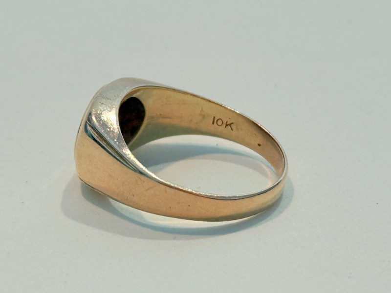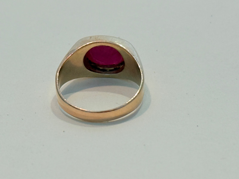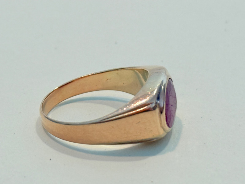Solid 10k gold ring featuring a flush-set oval cabochon ruby with deep purple-red tones. Smooth, polished band with vintage styling and minimalist elegance. Size: 7.5
