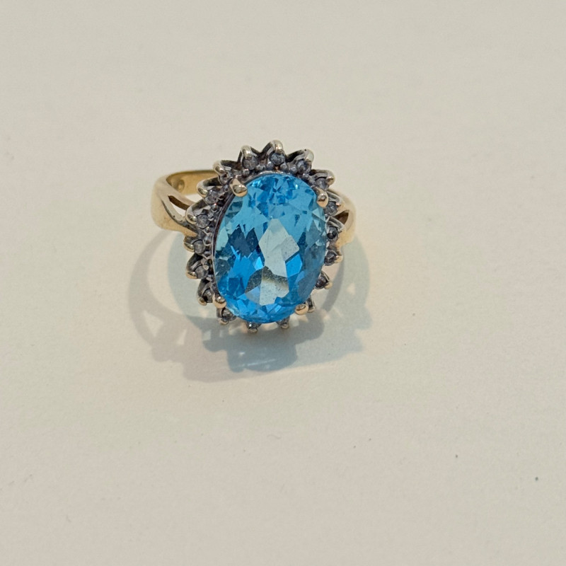 Blue topaz and diamond ring set in 14k gold. Features a large faceted oval blue topaz surrounded by a halo of clear accent stones. Weighs 5.9 grams and fits a size 7.5. Size: 7.5