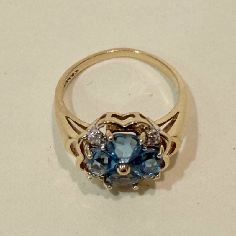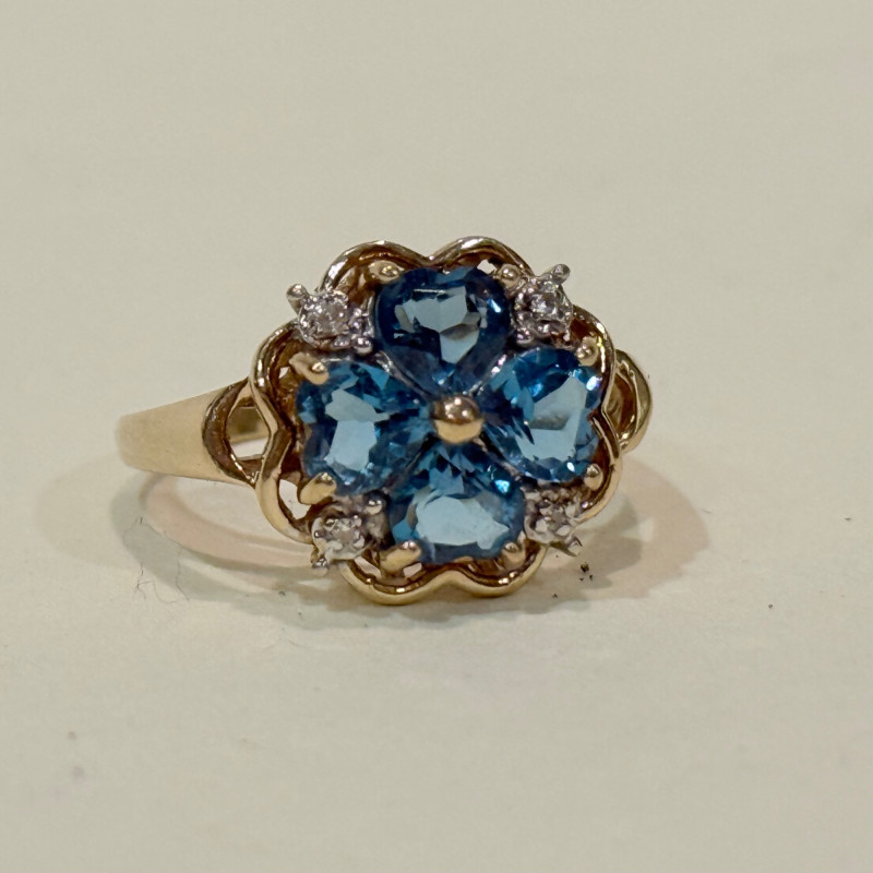 Blue topaz and diamond ring set in 10k gold. Features five heart-shaped blue topaz stones arranged in a floral cluster with four small diamonds accenting the petals. Gold bead center and scalloped gold surround. Weighs 3.2 grams and fits a size 7. Size: 7