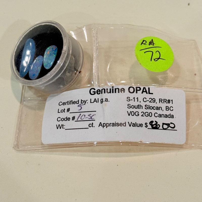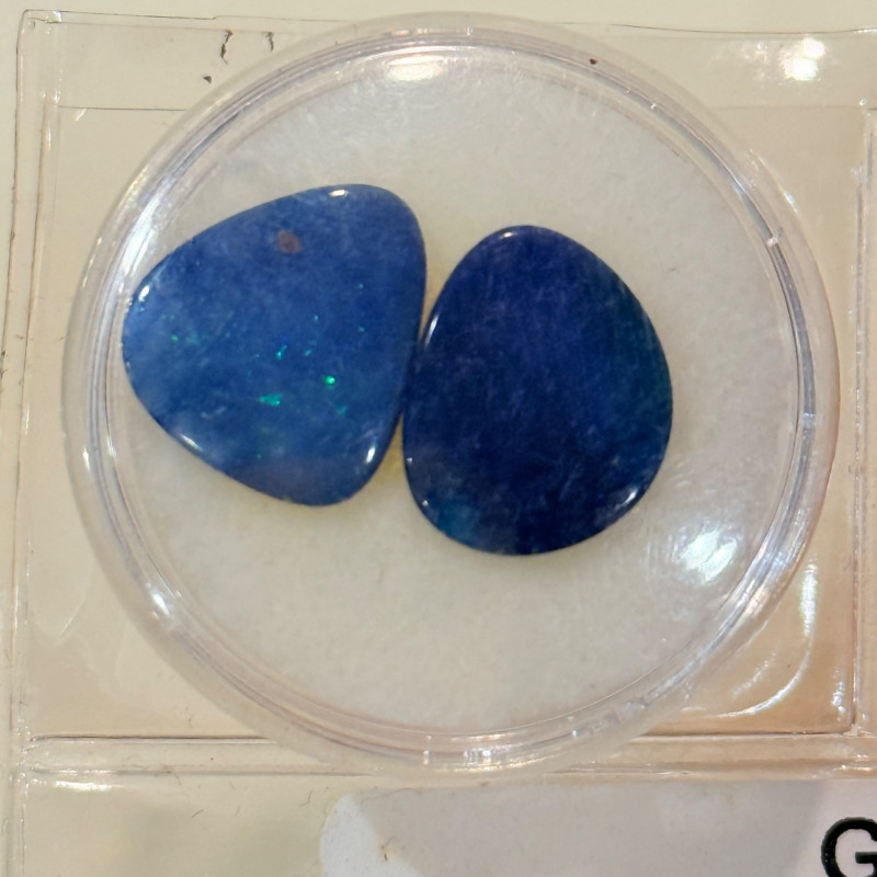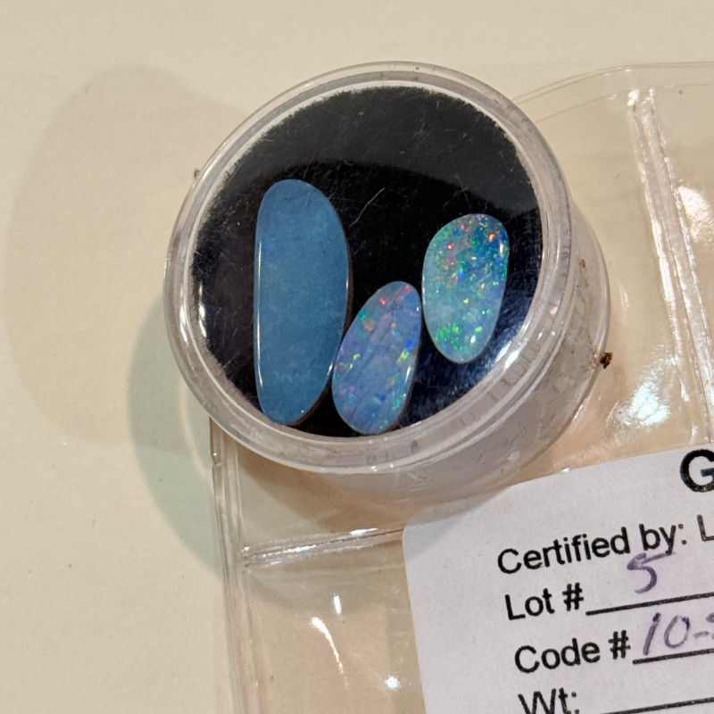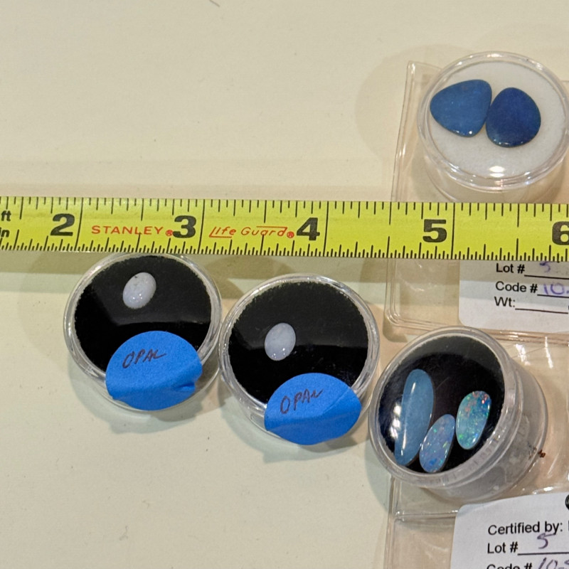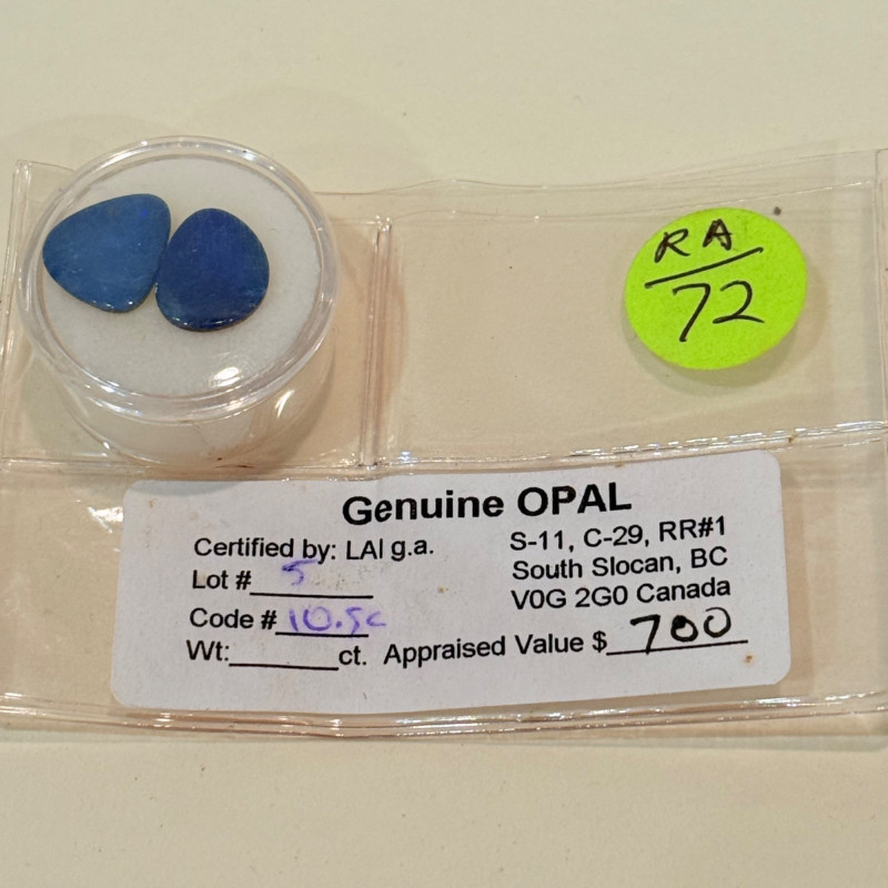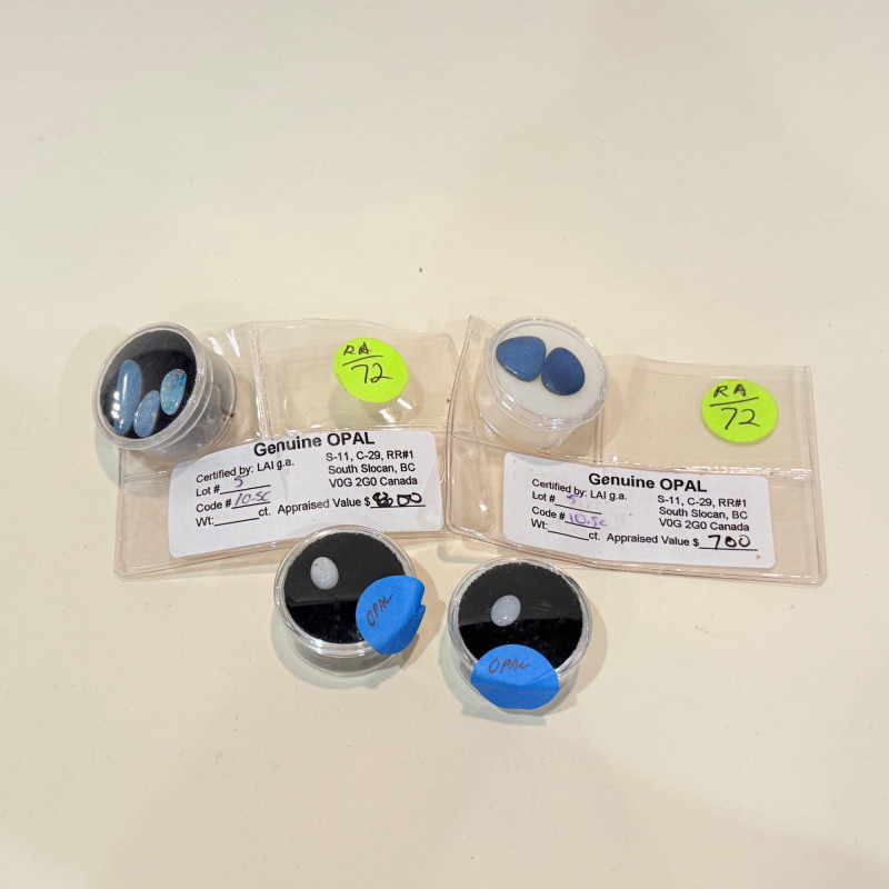 Set of seven certified blue opal cabochons in presentation cases. Includes two labeled pairs and five certified sets from ULA-9, each with appraisal cards noting Canadian origin. Stones are oval cabochons with smooth polish and vivid blue tone. Appraised at approximately $300–$350 each. Quantity: 7 sets