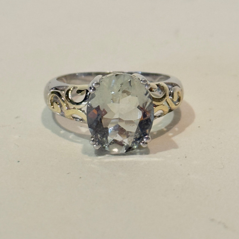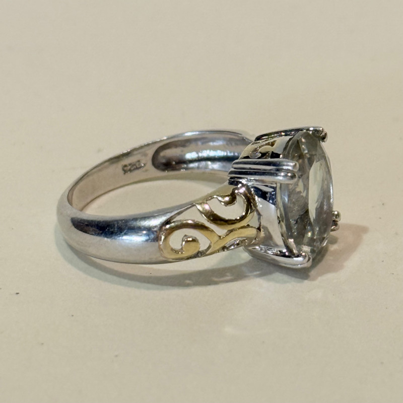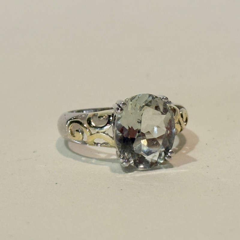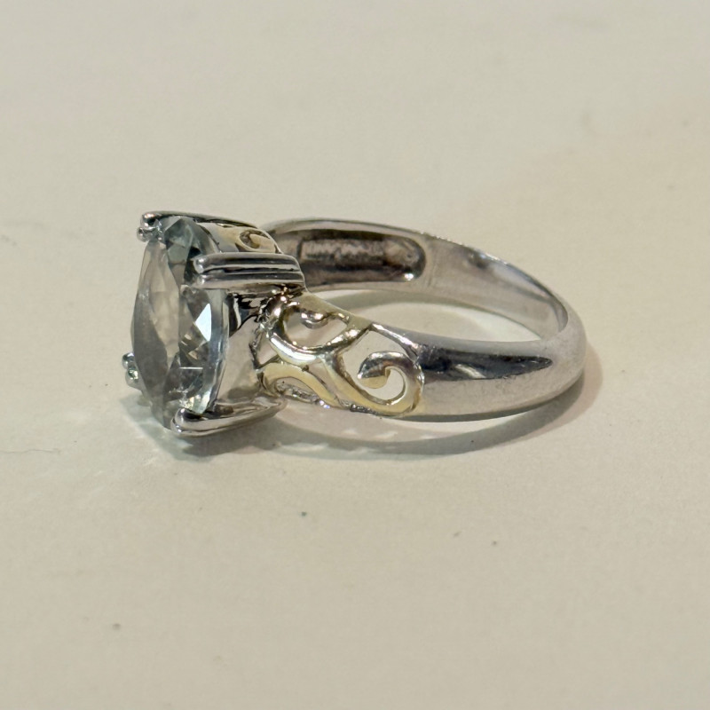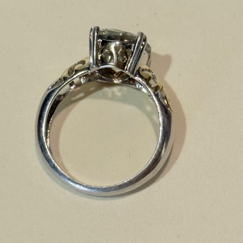 Size 7 sterling silver ring featuring a faceted green sapphire. Weighs 4 grams and is stamped 925. The band showcases ornate scrollwork with vintage flair. Size: 7 Weight: 4 grams Material: Sterling silver (stamped 925) Gemstone: Green sapphire