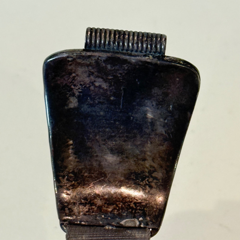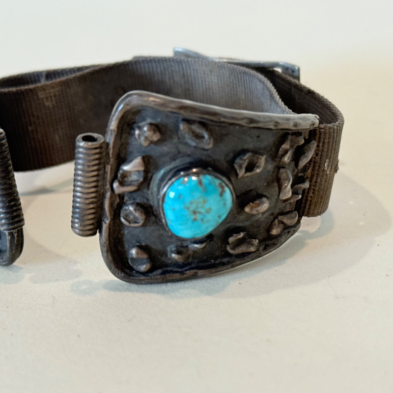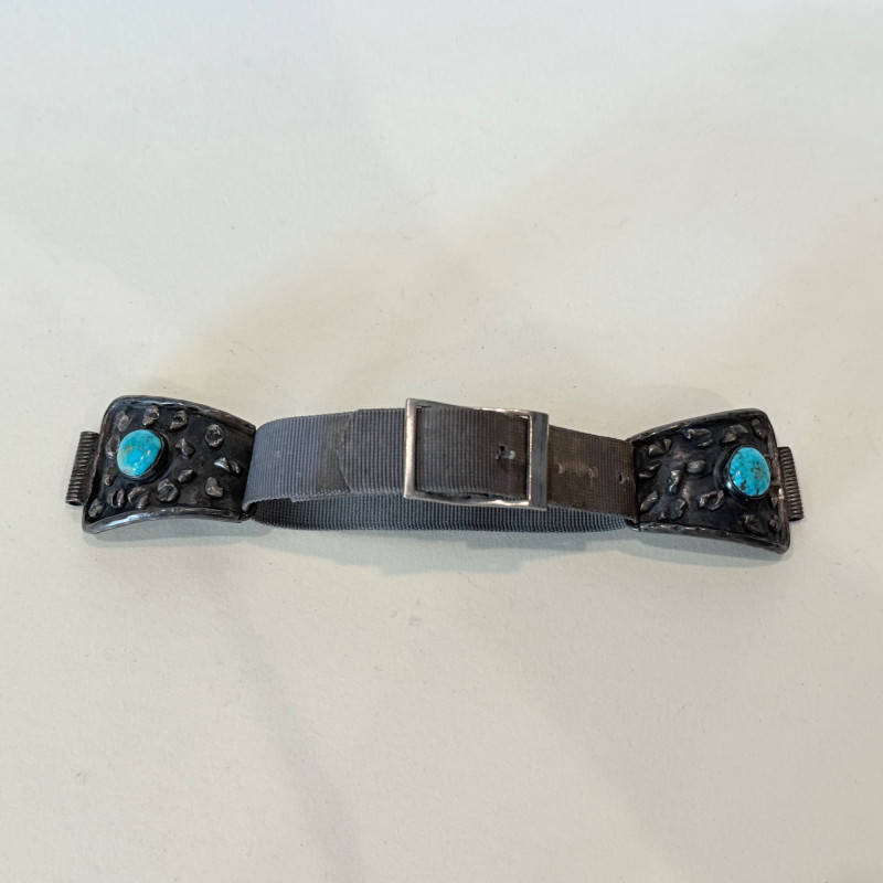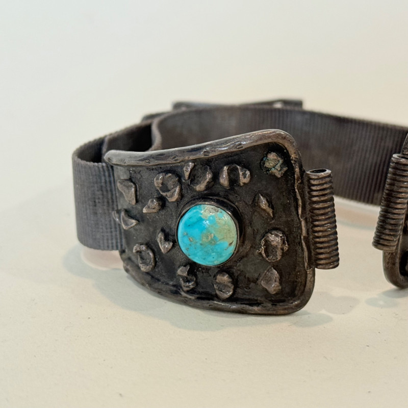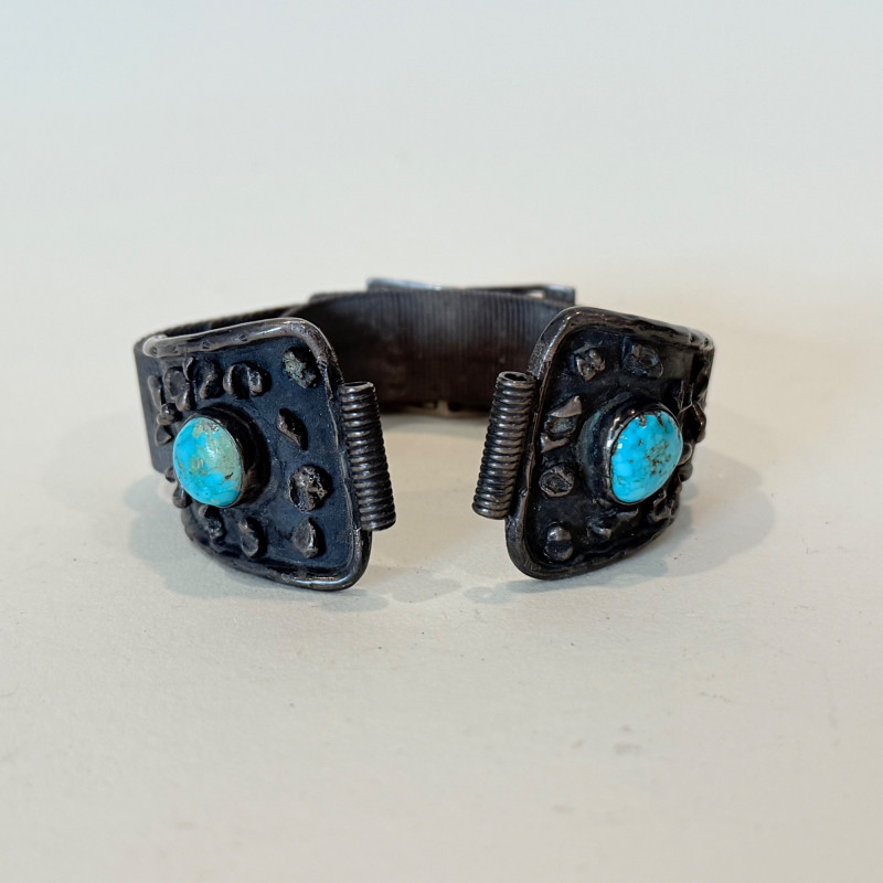 Vintage sterling and turquoise watch band. Features two textured metal panels set with round turquoise stones. Panels measure 1 1/8" wide by 1" long; watch attachment is 5/8" wide. Marked KXI - G. Size: Panels 1 1/8" × 1"; attachment 5/8" wide