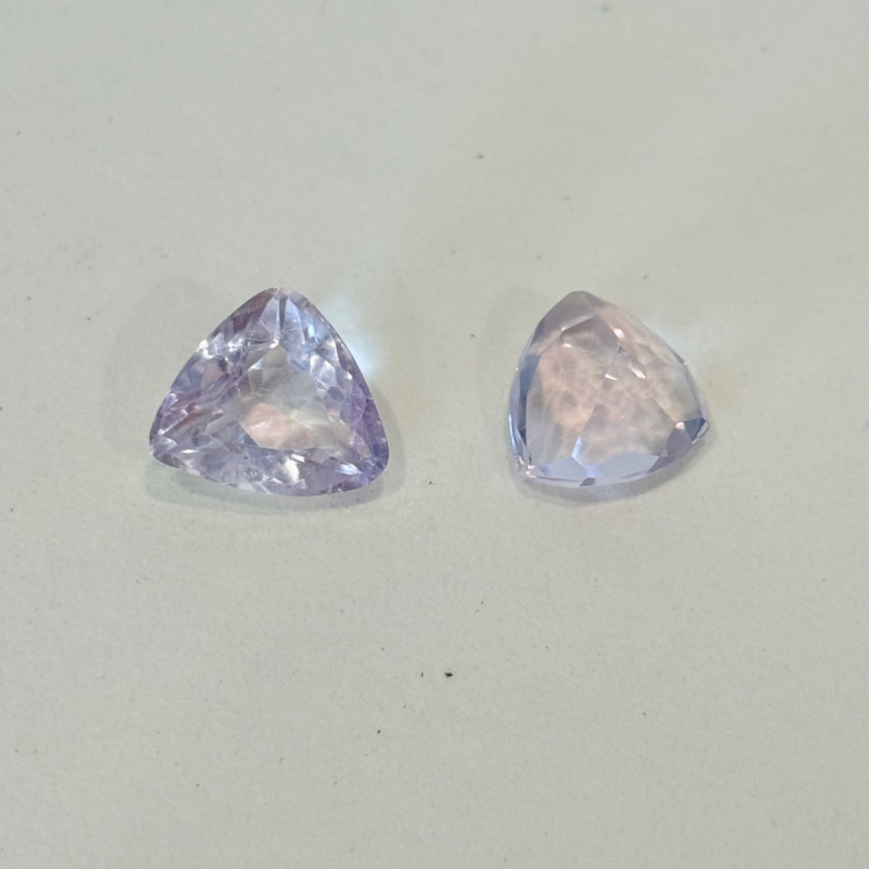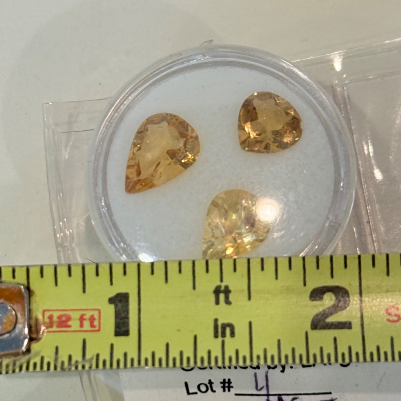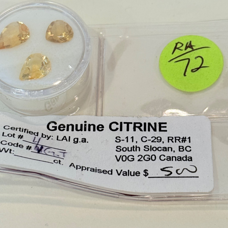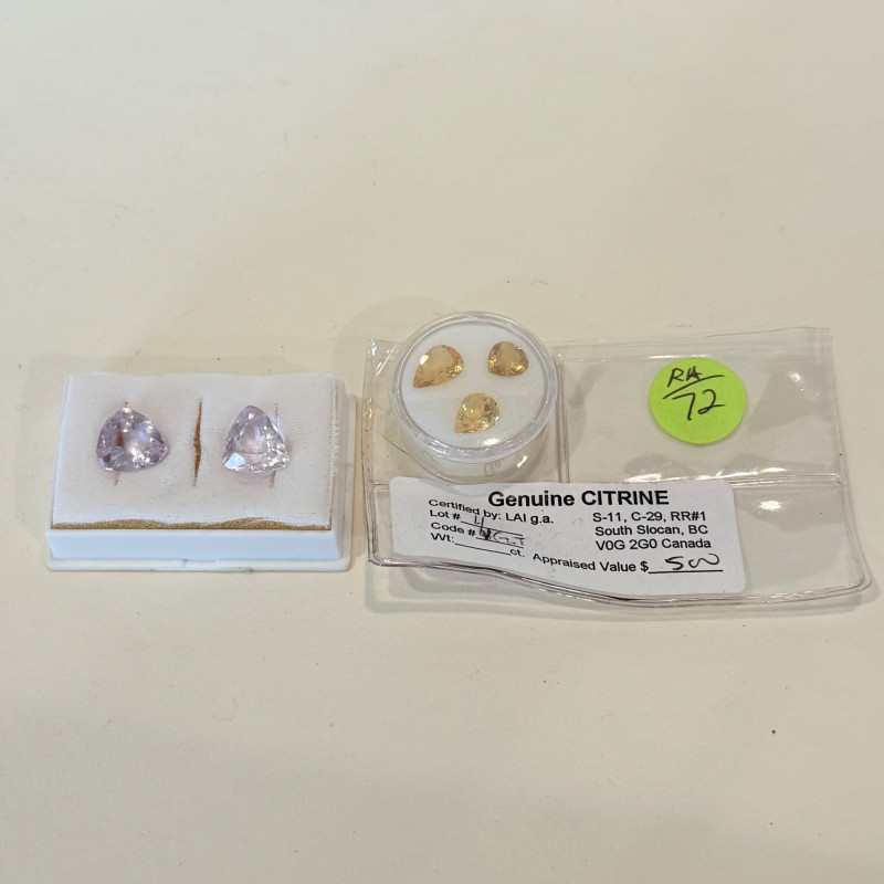Set of five loose gemstones including three certified citrine stones and two faceted amethyst pears, ideal for custom jewelry or collector display. The citrines are oval-cut with warm golden-yellow clarity, housed in a labeled plastic case with certification from South Slocan, BC. The amethysts are light purple, pear-shaped, and mounted on a foam pad for presentation. Gemstones Included: 3 citrine (oval), 2 amethyst (pear)