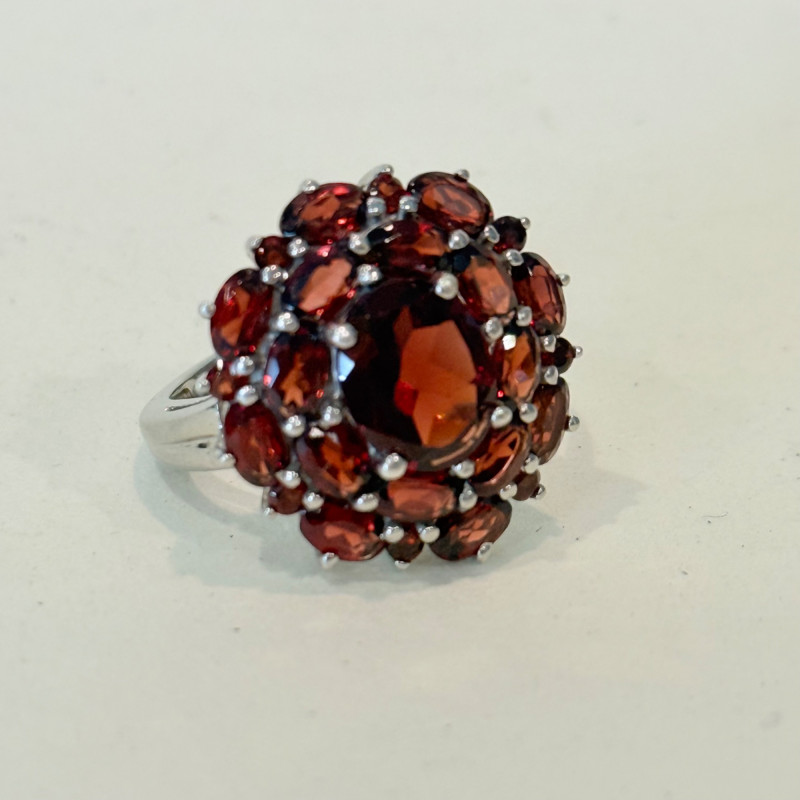 Crimson Bloom: Sterling Garnet Cluster in Regal Mid-Century Style Vintage sterling silver ring featuring a dramatic oval-cut garnet at center, surrounded by a halo of twenty-four smaller garnets in a floral cluster arrangement. The stones are prong-set in a raised gallery, creating a bold dome profile with rich red sparkle. The polished silver band is substantial and tapers gently at the shoulders. Stamped 925. Size 7.5. Total weight: 6.2 grams. Material: Sterling silver (.925), faceted garnets Size: 7.5 Weight: 6.2 grams Design: Central oval garnet with halo of round and oval garnets in raised cluster setting Markings: Stamped 925